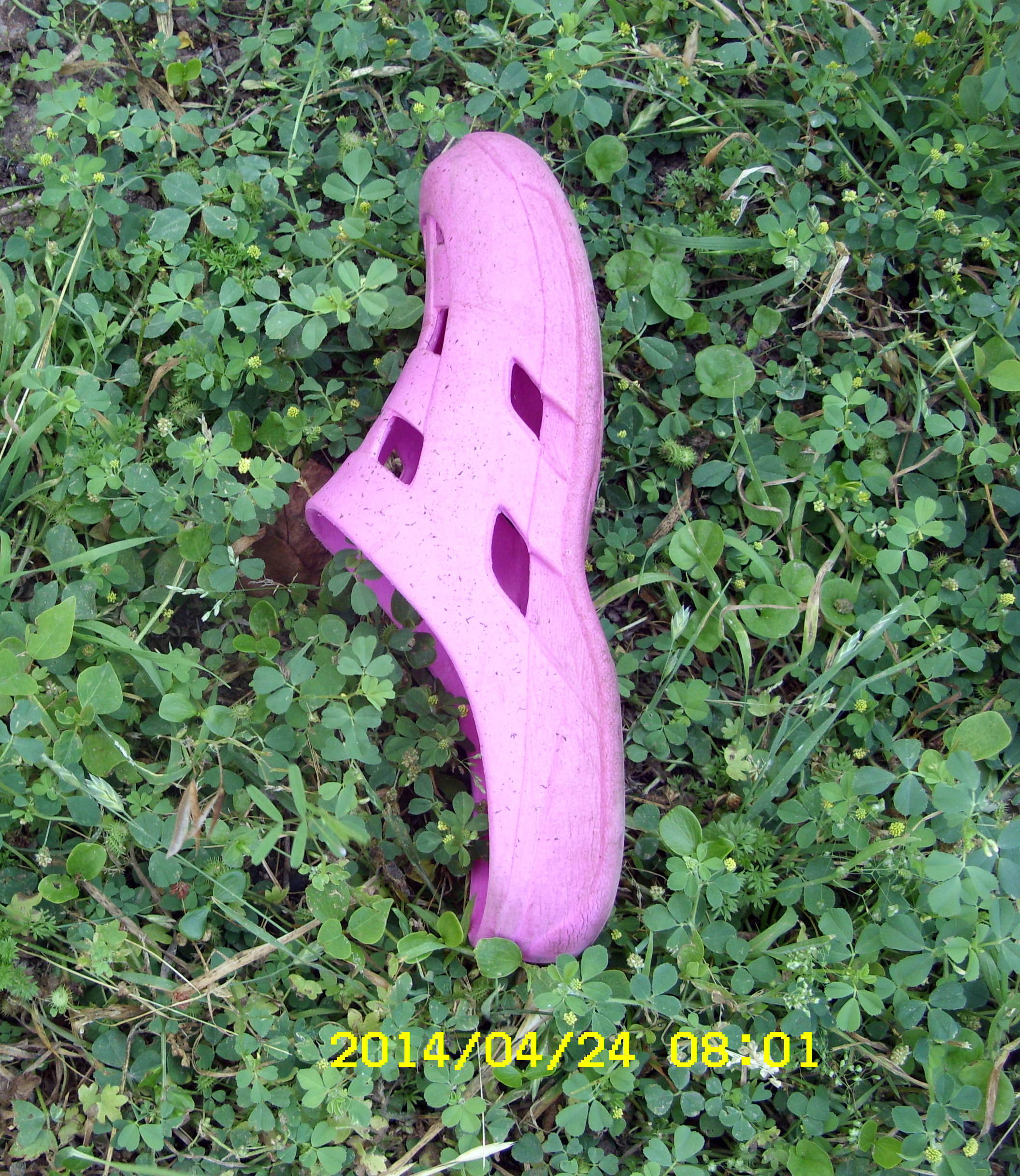 Postscript, Sunday, April 27, 2014: As I suspected, the dog of a volunteer (my former teammate) took my sandal. “Bella” escaped her leash (as she often does) and came to visit me (as she often does). No big loss: The sandals were free, acquired during my 2010 travels in the New England States and Canada.