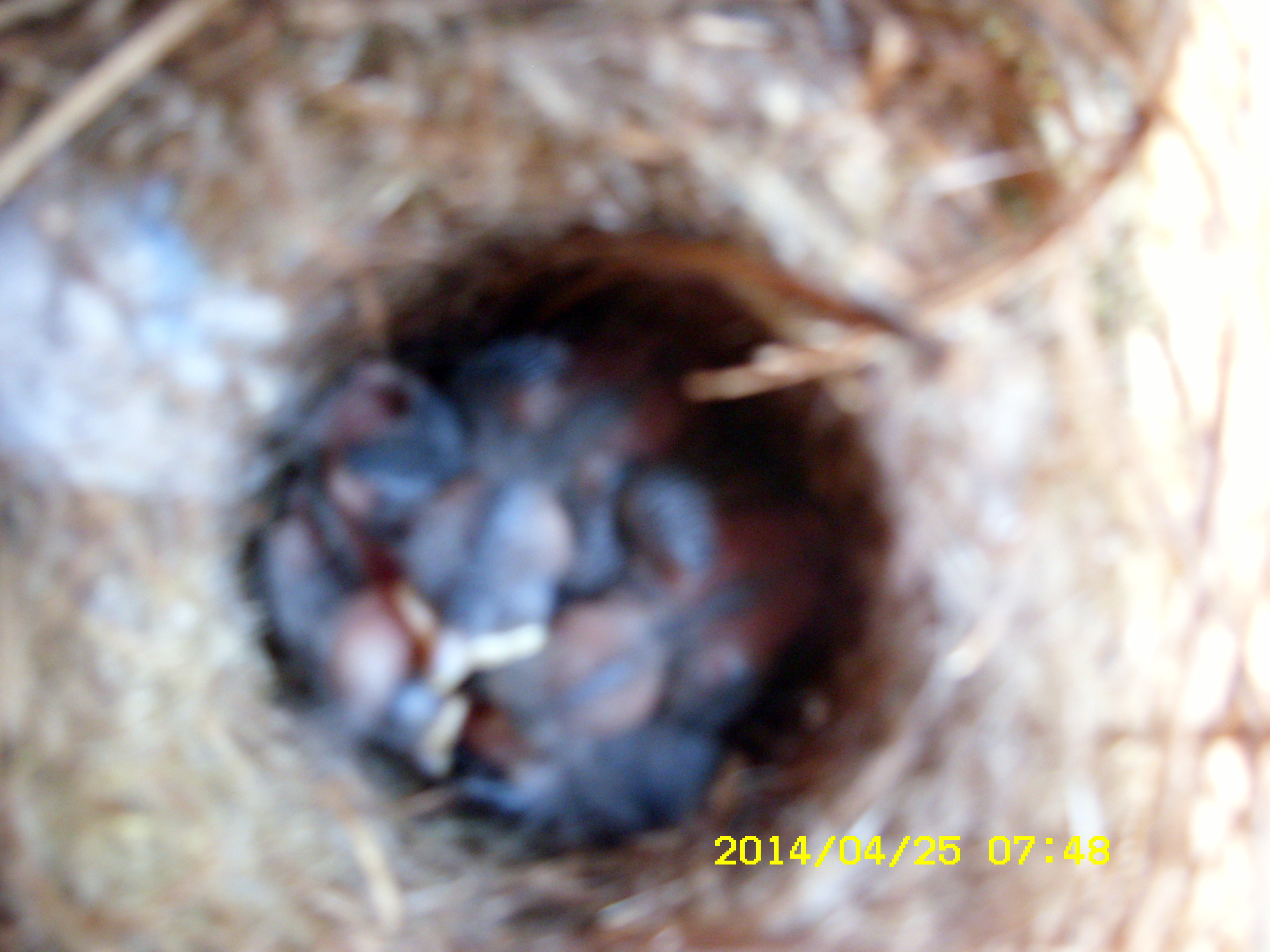 It was delightful to walk into the kitchen and see the sunlight streaming through a clean window. After delivering mealworms for the Bluebirds, I checked the other bird house (with my camera). I must do some research to find out if all baby birds look similar. I was told the bird sitting on the eggs was a Carolina Chickadee. IMHO, the babies look like Bluebirds.