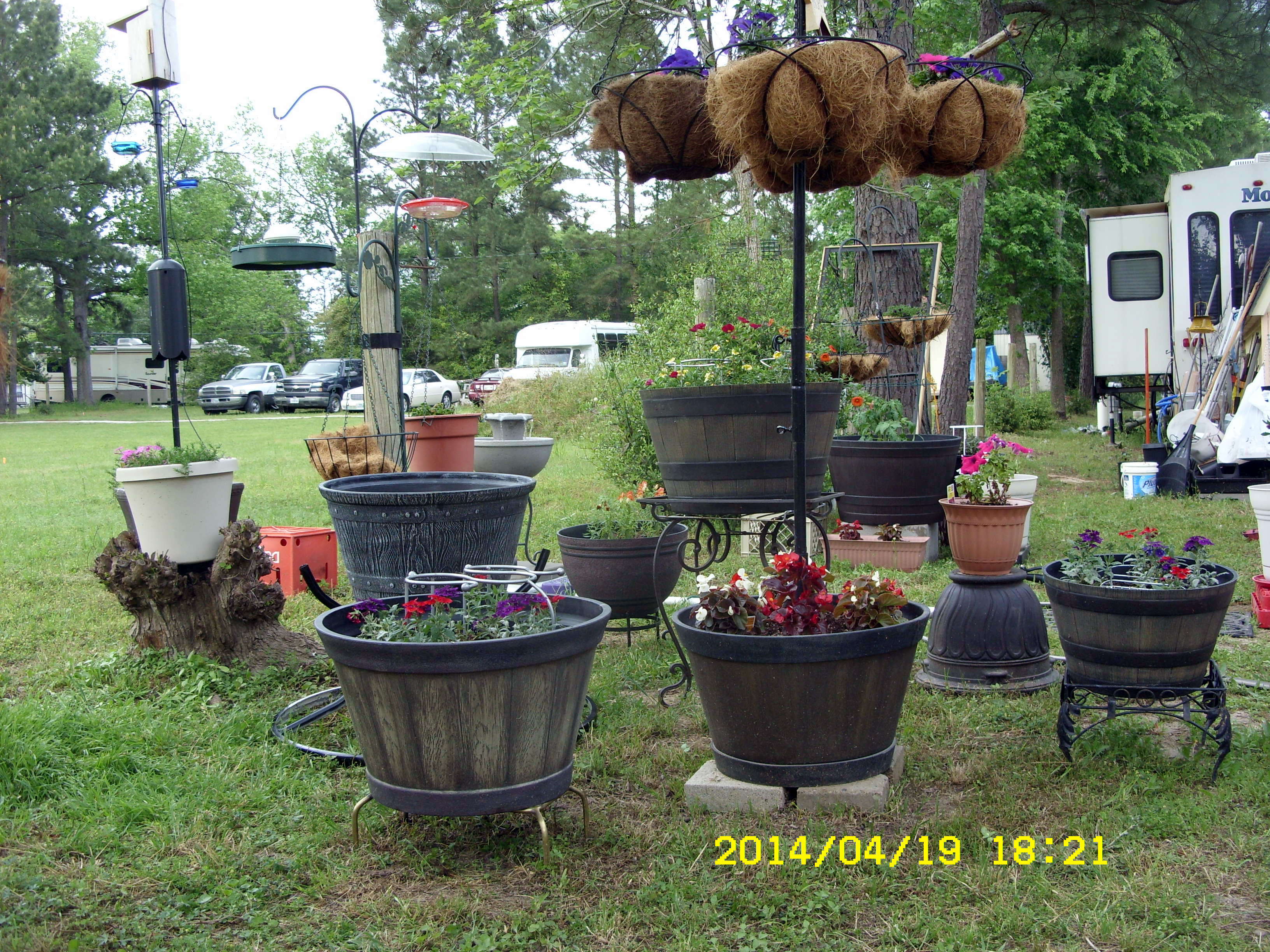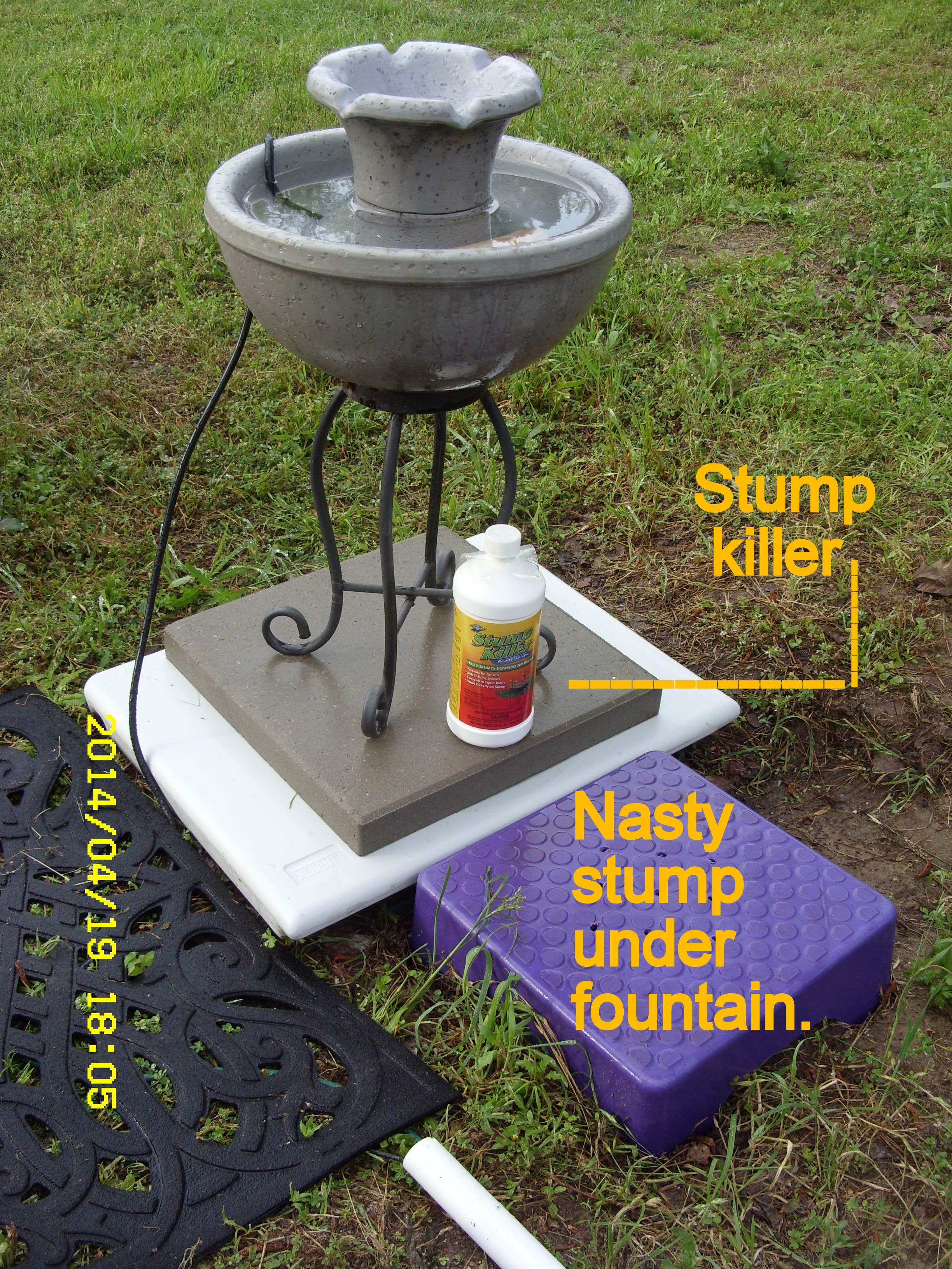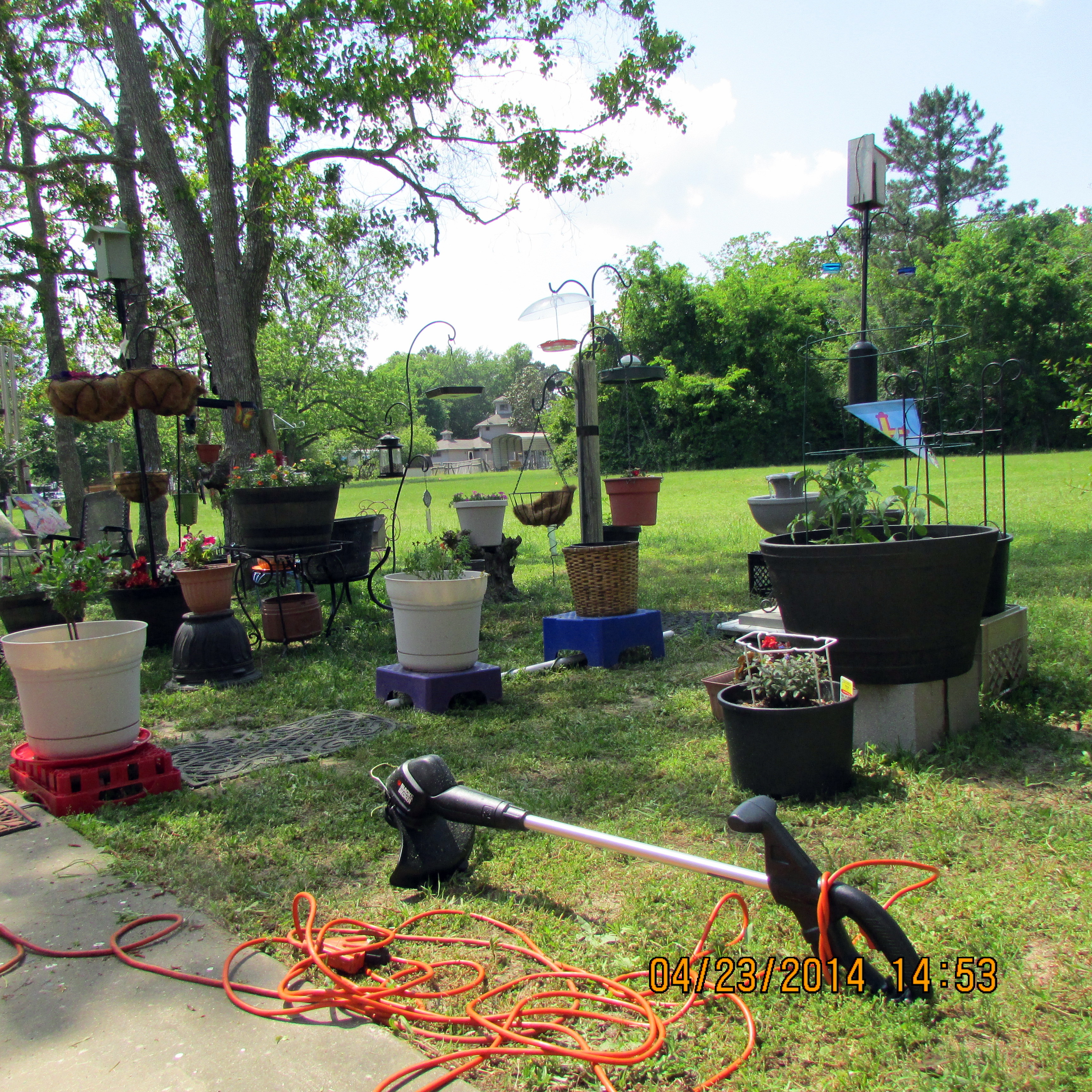 …of plastic simulated whisky barrel planters. Like any family, there is a resemblance but each is uniquely different. I filled a jumbo-size planter with compost, organic soil, tomato plant and a pepper plant. ~~ I was gone most of the day. First I spent the morning at a local meeting of a bird and bloom club; my first time to any such activity. Second, back to Tractor Supply for more bird seed, planter soil, and stump killer. By this time next year, I would like to level the craggy uneven soil under the fountain; the stump must die and disintegrate. Likewise, the stump serving as a plant stand must die (it is pushing out prolific new growth). Note my new (used) frame to elevate a planter: upside-down table (without a glass top). It was ugly and dirty but a coat of black spray paint enhances its appearance. Third: Lowe’s for a tomato plant, pepper plant and mosquito plant. Fourth and fifth: Thrift shops looking for something to elevate the veggie planter. In the end, I simply used two cement blocks to elevate it (for adequate drainage). ~~ I changed clothes as soon as I got home and dug into the composter for stinky rotten garbage for the bottom of the veggie planter, followed by soil. ~~ I won’t list all the things I did because long and “boring.”