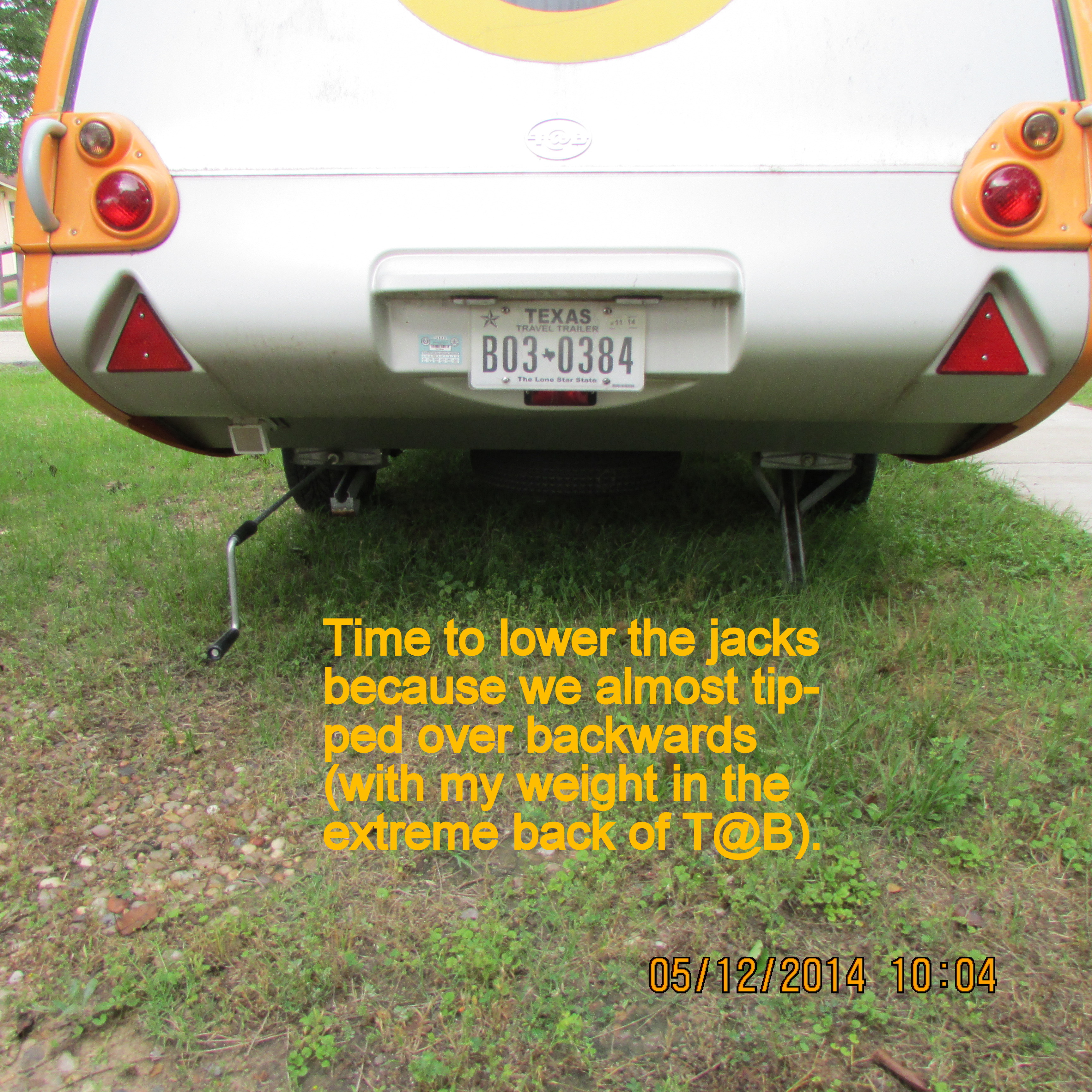 Not that a few raindrops would hurt me, I came in to have a cup of coffee and upload these pictures. It’s a pleasant 82 degrees outside, cloudy with wind, and a sprinkling of rain. The weather report says this condition will last most of the week so this is my perfect opportunity to clean mold and mildew in the tiny teardrop trailer. I started by standing (hunched over) in the extreme back, sponging white vinegar on the culprit. “Oh no, we’re going down!!” So I needed to use the tool and lower the stabilizers. It’s looking better where I have swiped white vinegar–but I have a long way to go.