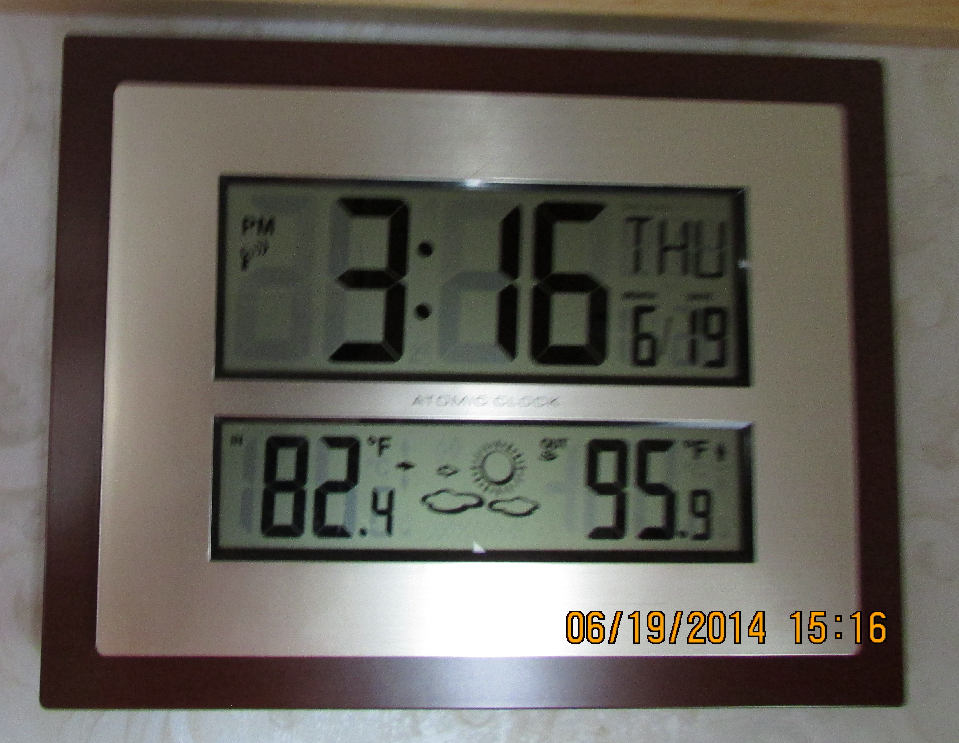 Time and temperatureFriends and acquaintances are trying to convince me to take the trip. So-o-o-o I’ve rushed around trying to pull last-minute details together. After lunch, I went to the extremely hot mini-storage unit trying to find my blue ice” containers. Could not locate!! Went to Walmart and bought four small…. When I started loading things into the T@B, the temperature read 106 degrees. It dropped to 105 when I carried the clock into the BIG trailer to take a picture. And look at the outside temperature!! Gratefully, I do not think it is as humid today as many days. Well (to please everyone, ha), I guess I’ll leave tomorrow (after a haircut in the CARE Center). ~~ I’ll probably spend hours (today) getting ready because I did very little yesterday. C’est la vie!!