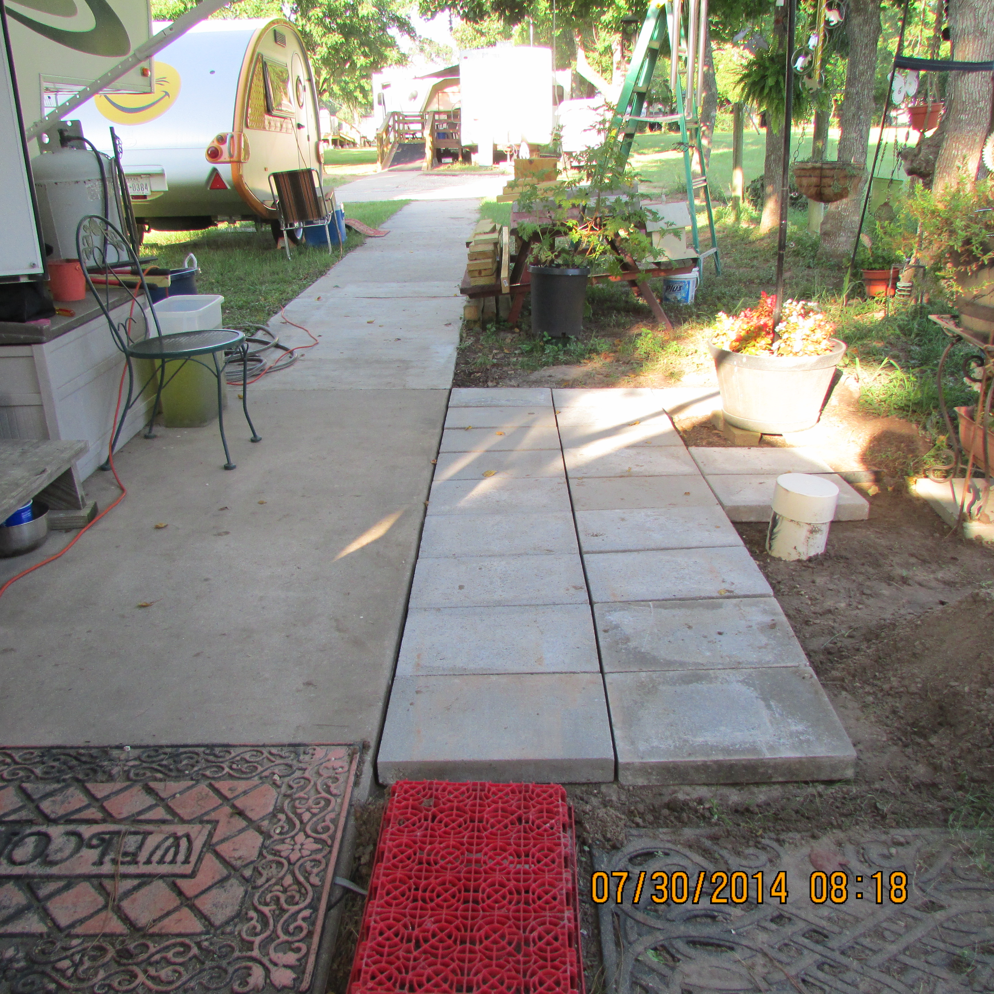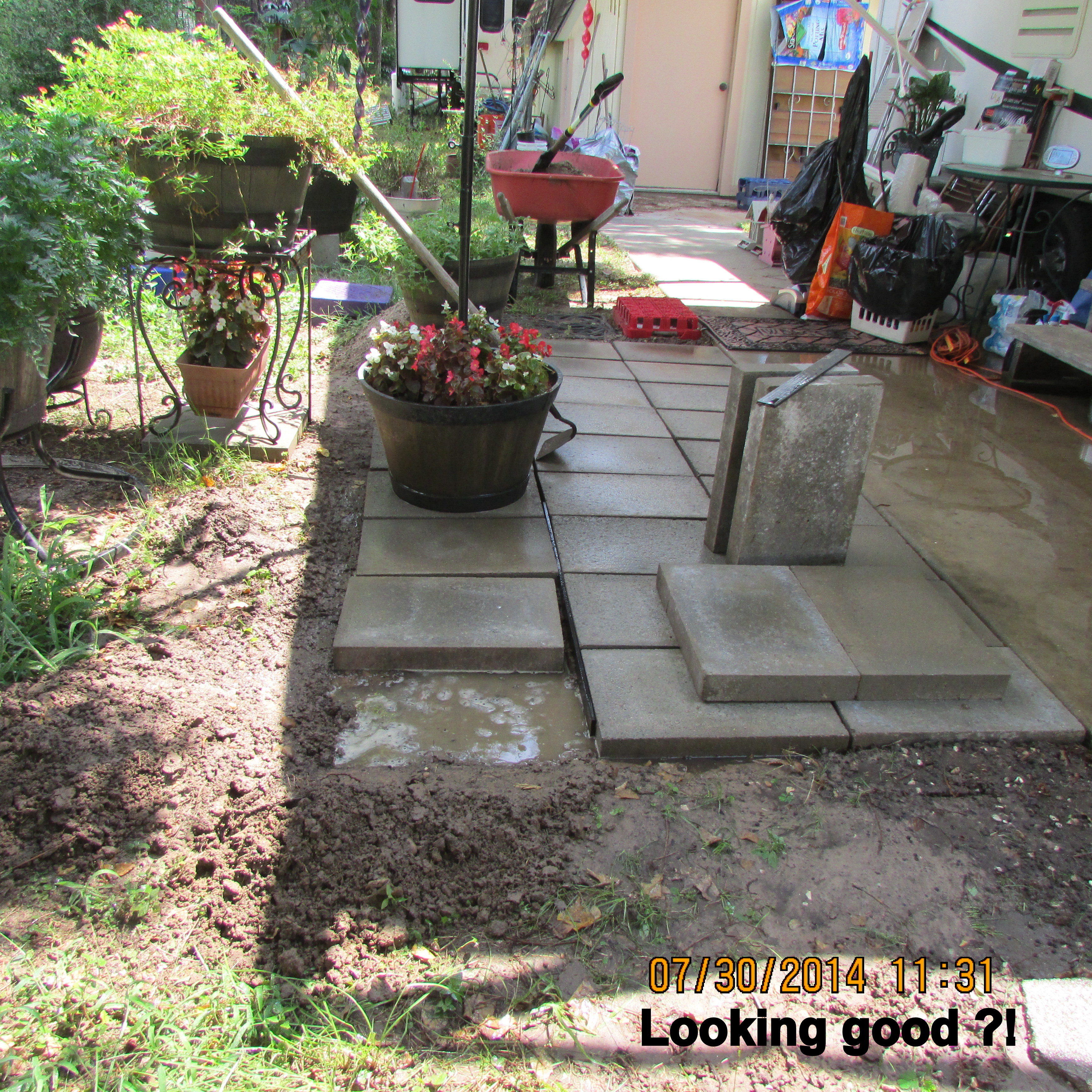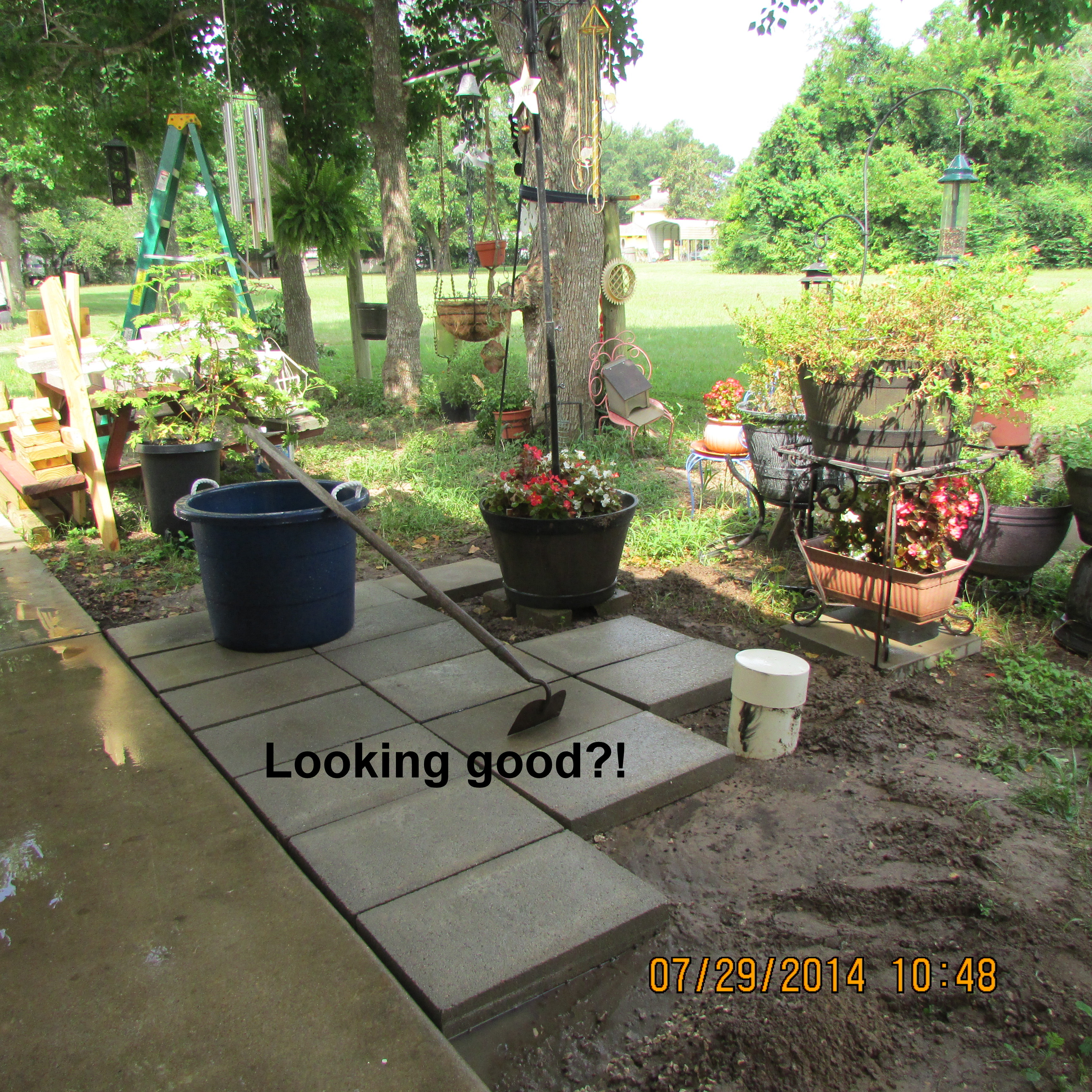 My word for today: Acute. Stress on this old body is acute but the desire to complete the project is ACUTE. Can’t stop!! It was a cool morning. Rain in the forecast–maybe as early as this afternoon. I’m hoping the rain will help settle the paving blocks. It will certainly soften the ground where I plan to lay ten more blocks.