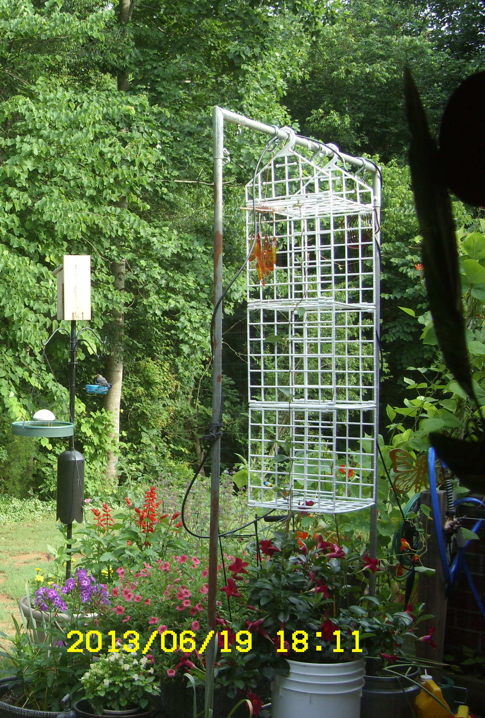 Plans for my garden are constantly evolving. This morning I began to consider where I’d put perennial plants when we have frost. (With our scorching temperatures, I have to “think cool.”) There won’t be room in the storage building!! How will I cover them?? Specifically, the Cape Honeysuckle as it is growing tall rapidly. I’ve been uncertain where to mount the galvanized-pipe structure (originally designed for my Topsy-Turvy upside-down tomato planters). Today (in my mind’s eye) I saw the answer. Move the picnic table so it is neatly aligned with the two large trees. Put the two cement bases adjacent to the sidewalk and assemble pipe. Prior to freezing temperatures, I can move the planters and cover them with a tarp secured to the pipe between trees and the galvanized-pipe structure. A flat-roof “tent” structure. On a much smaller scale, I covered Verbena plants with a tarp in North Carolina. ~~ The “picnic” table may never see a picnic!! I’ve always considered it for plants.