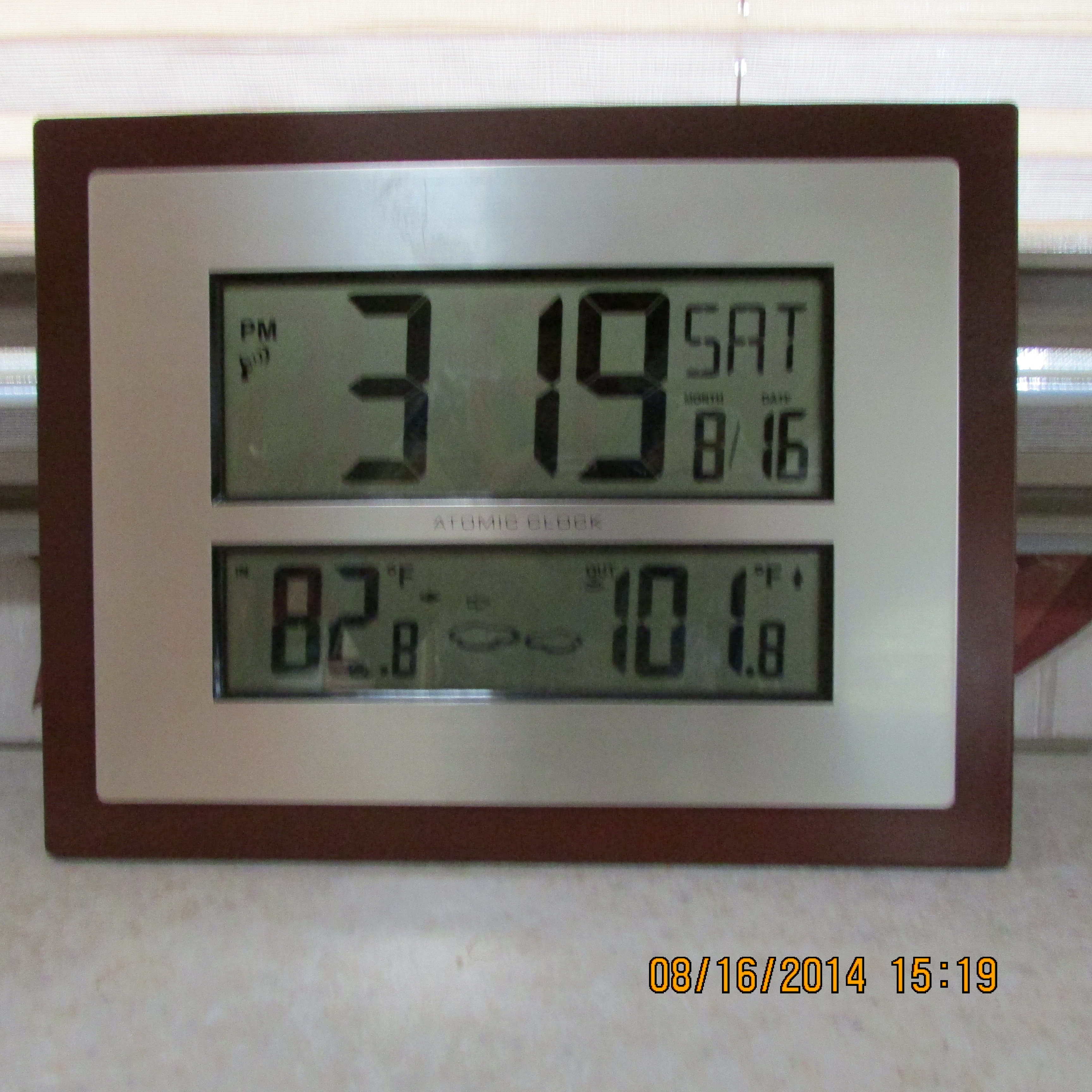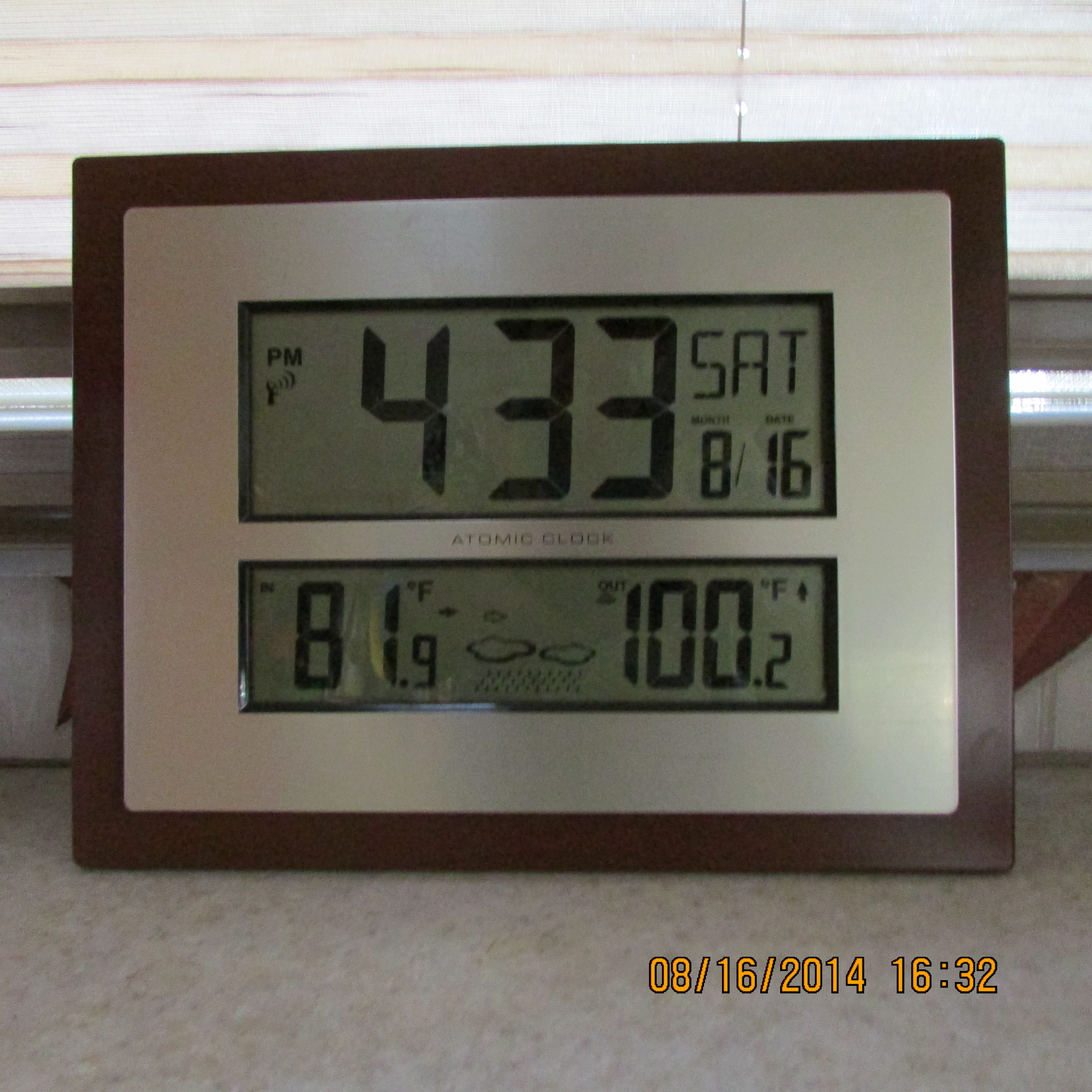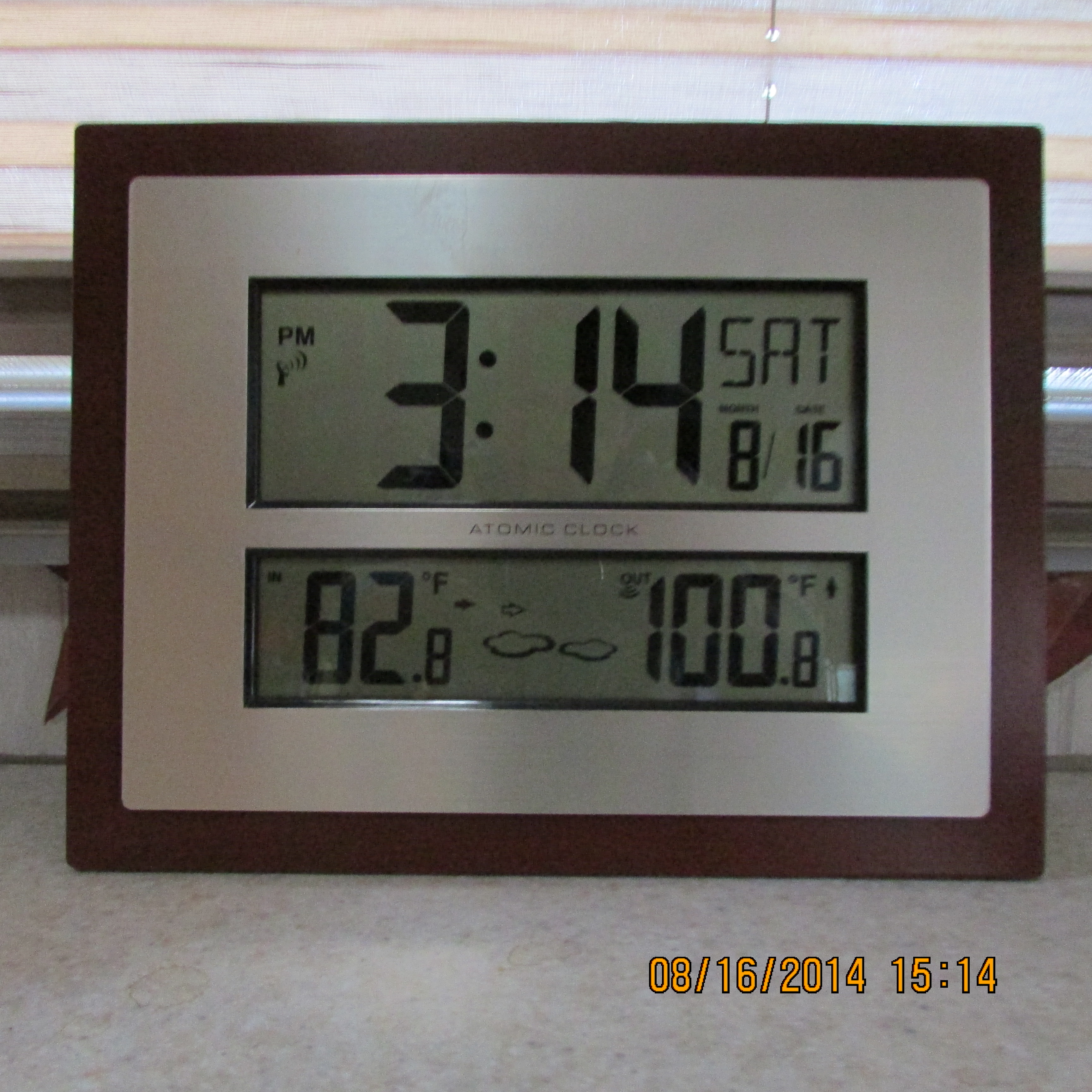 The camera is never very far away from me. (Granted, my living quarters aren’t very large!!) So when I got up from a short summer nap (contrast to a long winter’s nap), I looked at the clock and saw “99.9” degrees. The clock is temporarily on the kitchen counter because I hung purses on the coat hooks by the front door. One-by-one I’ll decide if I really want to keep a specific purse. ~~ Frankly, I don’t want to walk from my trailer to the CARE Center for the evening meal. Outside, it feels like a sauna!! ~~ Frankly, I don’t want to “do” anything!! I intensely despise the summer heat in Texas!! (But I will leave the comfort of my air-conditioned trailer for Quiche. We have a [new] young man chef preparing wonderful meals. I pray he never leaves!!)