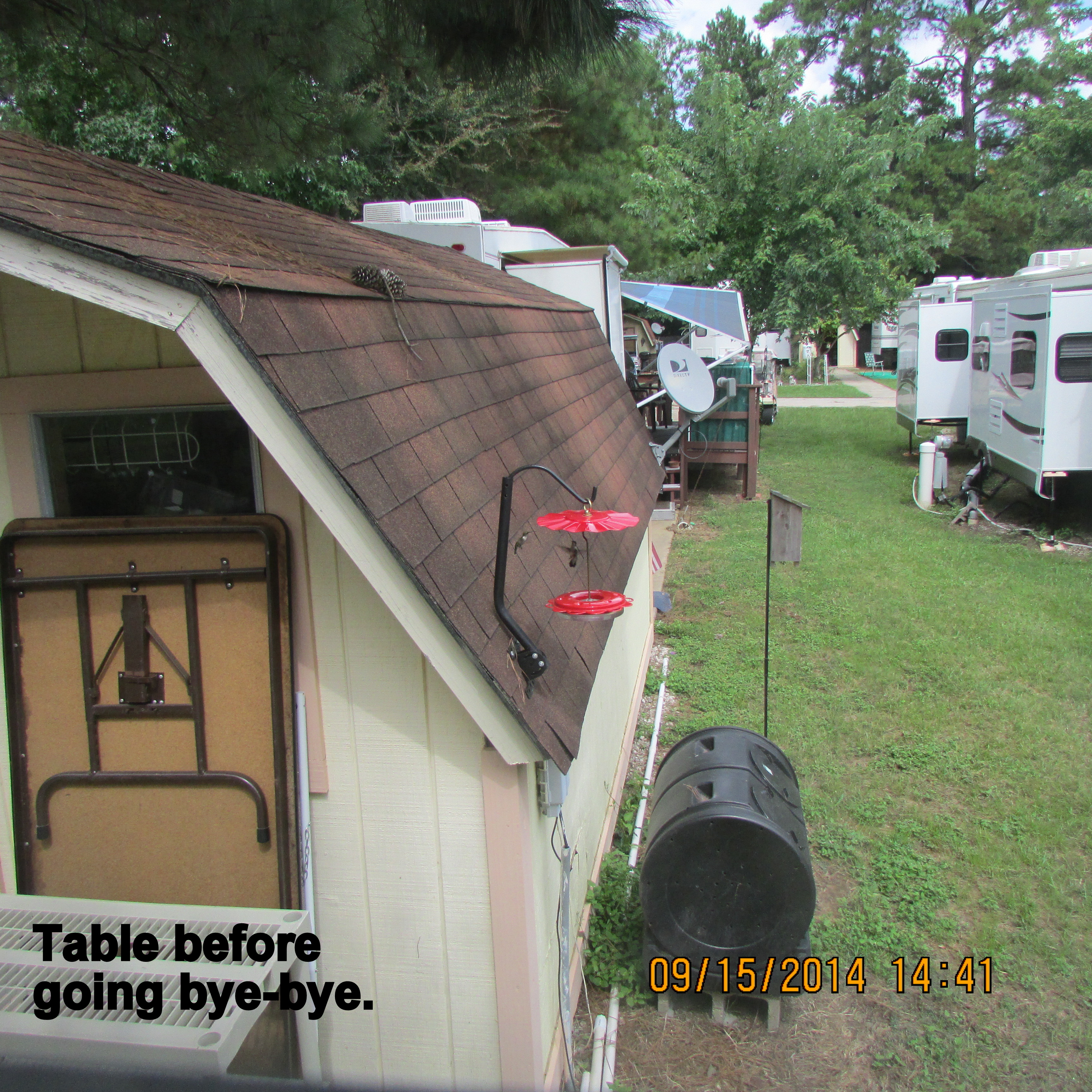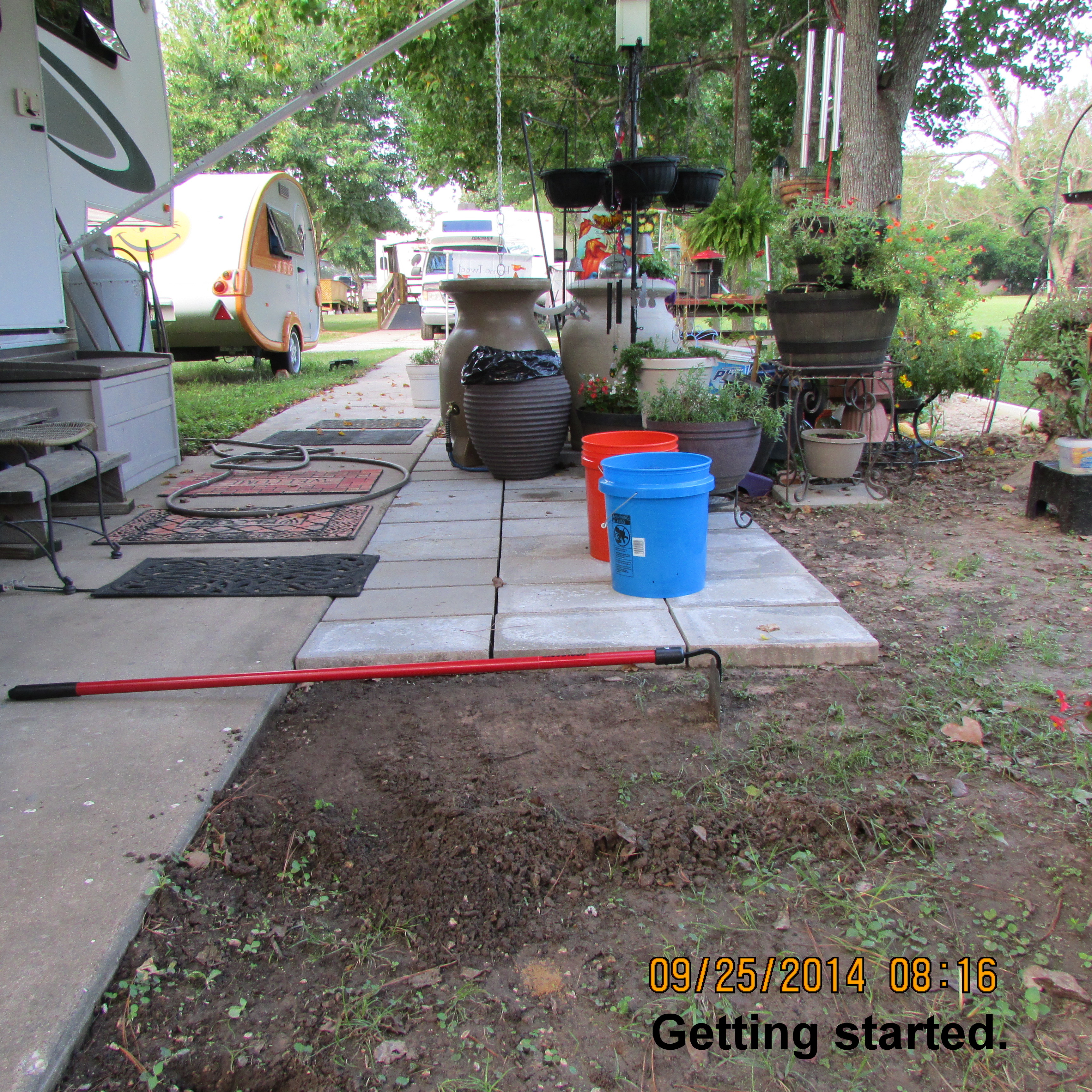 Yesterday, I very slowly flooded the area where a critter dug a hole. Later I filled in the dirt and hosed the extra dirt from the patio. Today, no new digging so I did a thorough job of cleaning up under the trailer and on the patio. Flower pots stored under the trailer were washed and put away. Likewise, tools went into the little storage building. I hung garden flags for Fall (originally on display in North Carolina).