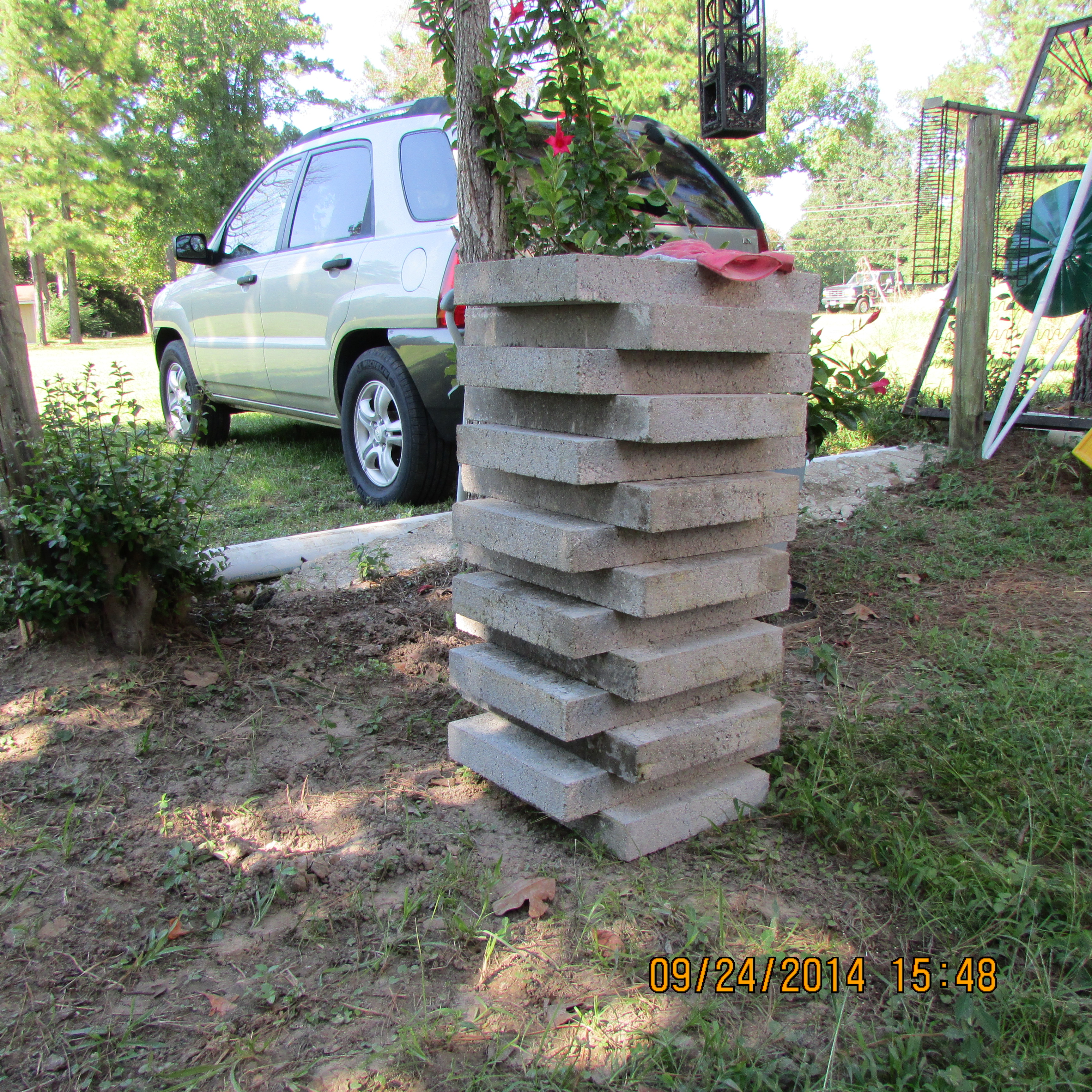 Later (actually 4:15): I bought fourteen paving blocks and will continue that project now that the weather is cooler. I had my “breakfast of champions” this morning (but not Wheaties) so I could lift and carry five hundred eighteen pounds!! (Thirty-seven pounds at a time.)