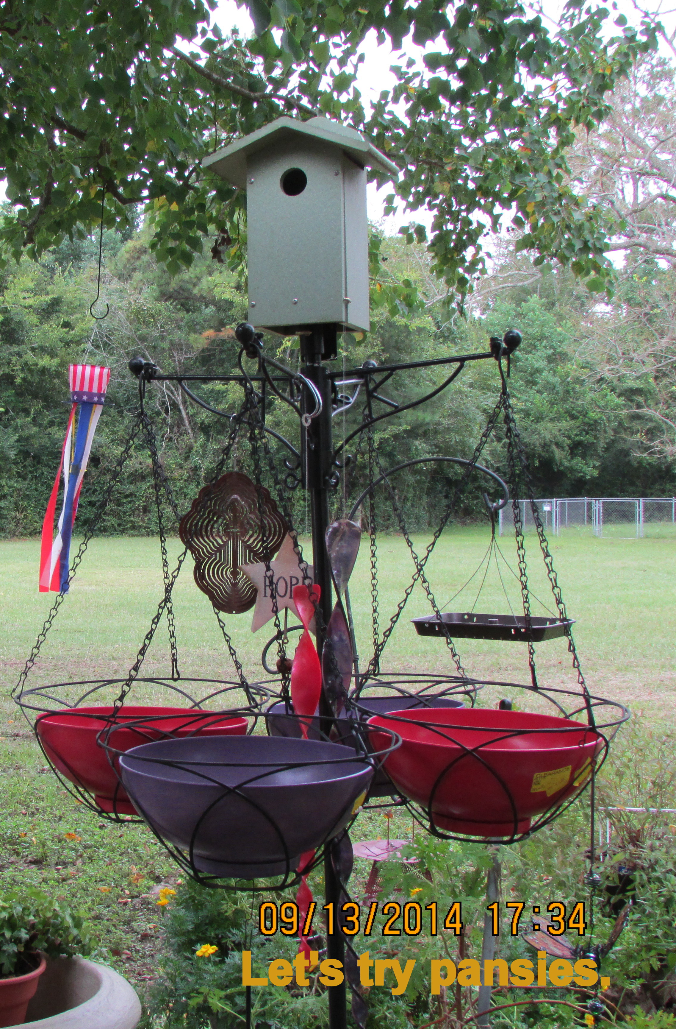 All day!! Loved my sweater!! Now (at 6:15 PM) I’m indoors having hot tea. ~~ I recycle!! Pine cones hit the ground every day and I collect them for the bottom of planters. The coco fiber will be cut into small pieces and added to drainage material in the bottom of large planters. During the afternoon, I drilled holes in the bottom of the new large planters. Drilled… with the used electric drill I bought last Saturday for $10.00. Wow, is it fast!! Until now, I didn’t realize how slow my portable, battery operated, drill is. Pulled more weeds; much miscellaneous. (Didn’t take pictures.) But, IMHO, the new planter inserts look good–for the wrought-iron hanging baskets. When the weather dictates, I’ll buy and plant pansies. ~~ Yesterday (during the rain) I promised myself (with cooler weather) I’d start laying the cement paving blocks again. But today the weeds were more important. Furthermore, I couldn’t resist bringing the hanging baskets back to the wrought-iron support and display. ~~