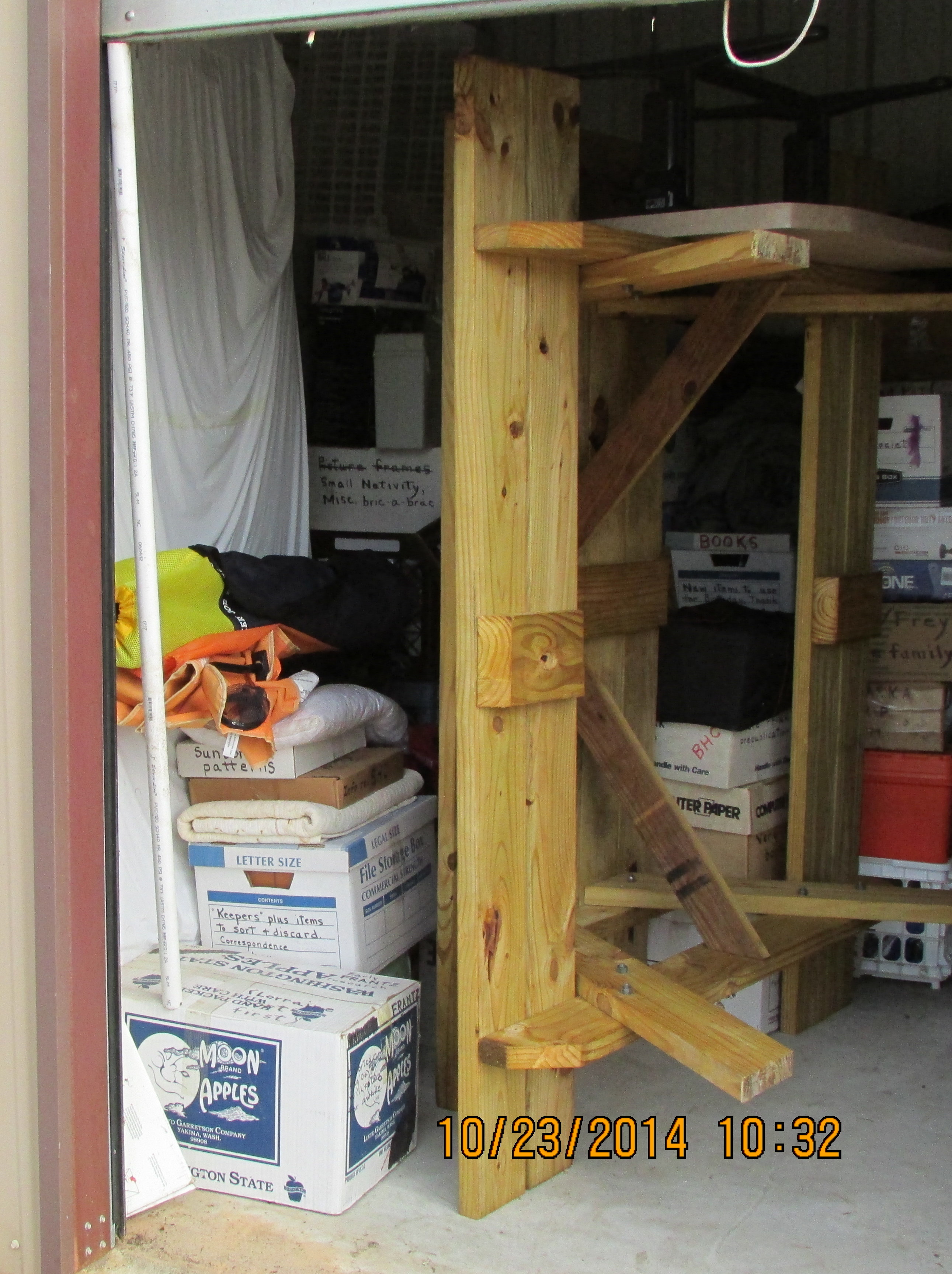 Postscript, Wednesday, October 22, 2014: Change of plans!! Recently, I bought raffle tickets to support our local SPCA. I won this man–made-in-the-USA picnic table and a friend was kind enough to transport it from site to site. Until next March, it will be stored in my large mini-storage unit. There went my plans to transfer things into a smaller unit!! Oh well, it’s only money!! I’ll adjust my budget. ~~ Can you see that monster in my already overcrowded yard?? “No way!!”