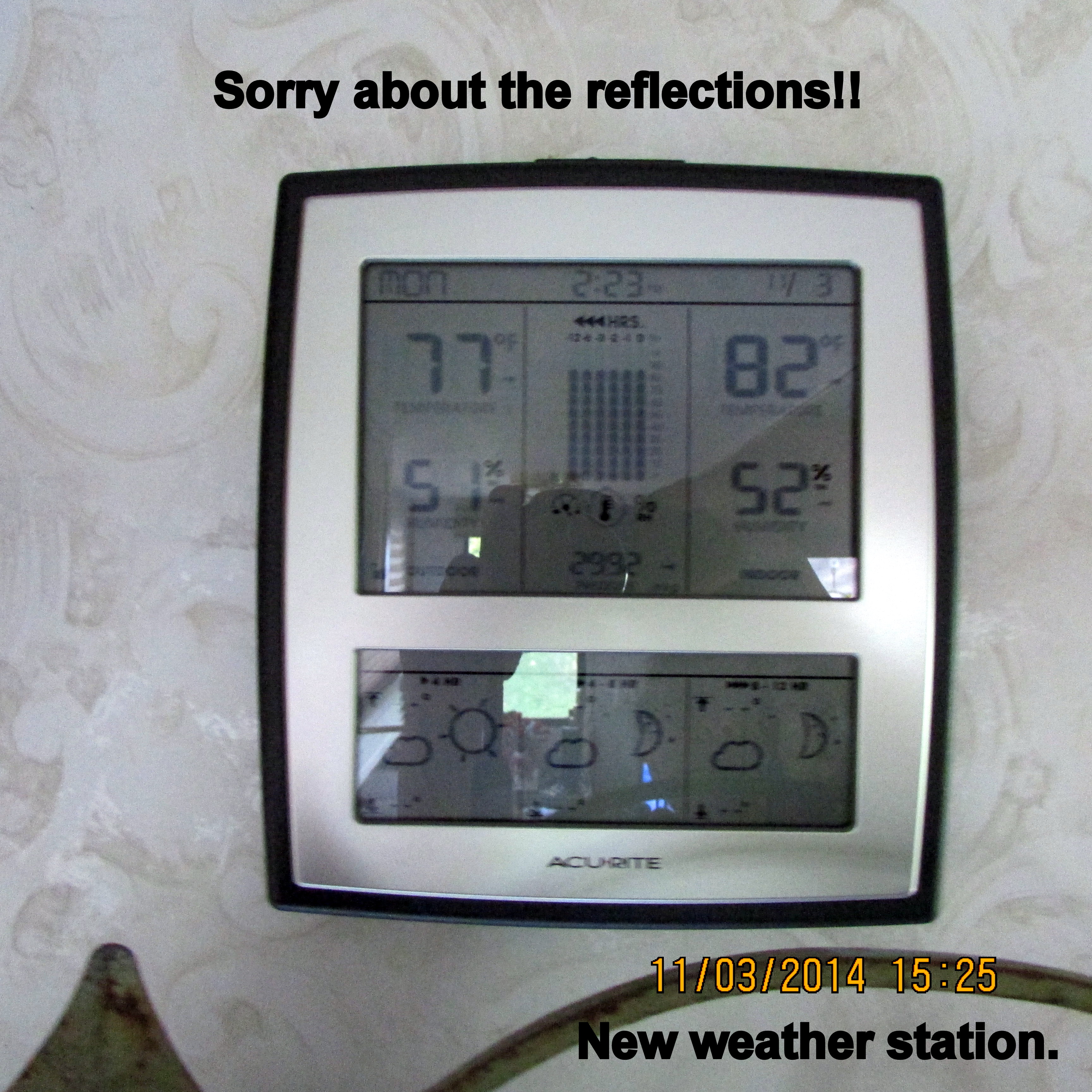 Another impulse purchase: AcuRite weather station. I was increasingly suspect of the outside temperature on the clock (with brown wood frame). Without television weather reports, I feel lost… and will appreciate this new station that will provide humidity too. Yes, I can always check for weather on the computer!! But I like to see what’s happening in my own yard!!