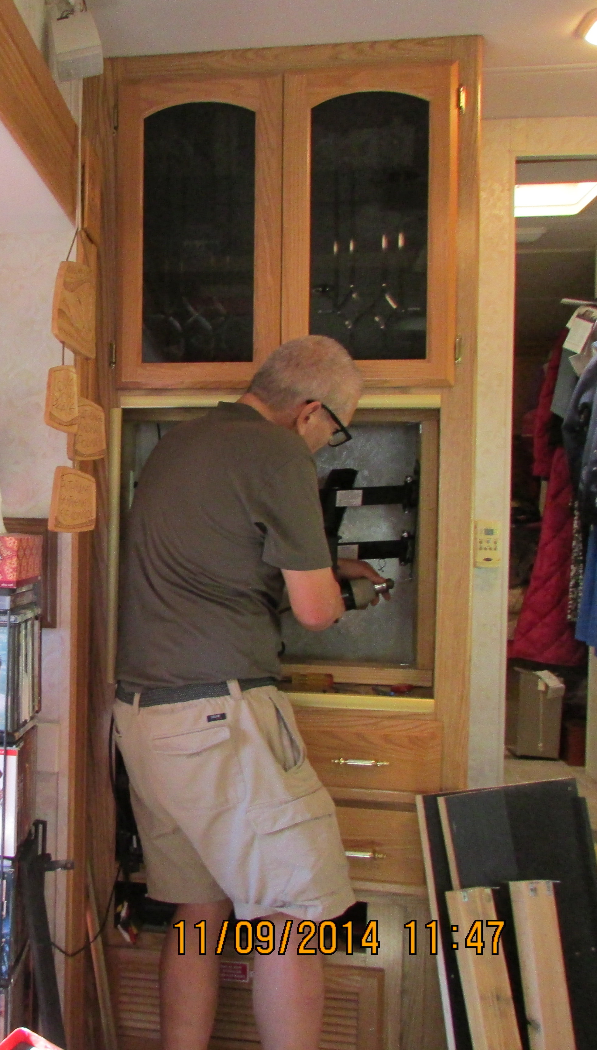 Last night I mentioned to an acquaintance that I need a handyman for a couple of projects. Without blinking an eye, he asked if nine o’clock this morning would be convenient. Dave arrived precisely at nine o’clock. We tackled the project of moving the television from one type of mount to a very flexible mount. The pictures tell the story. ~~ Previously, with the television recessed into the cabinet, it was difficult to understand what people were saying. Very muffled; changing the various setting on the TV did not improve the voices. Late this afternoon I experimented; the sound is very good now. ~~ I am so thrilled!!