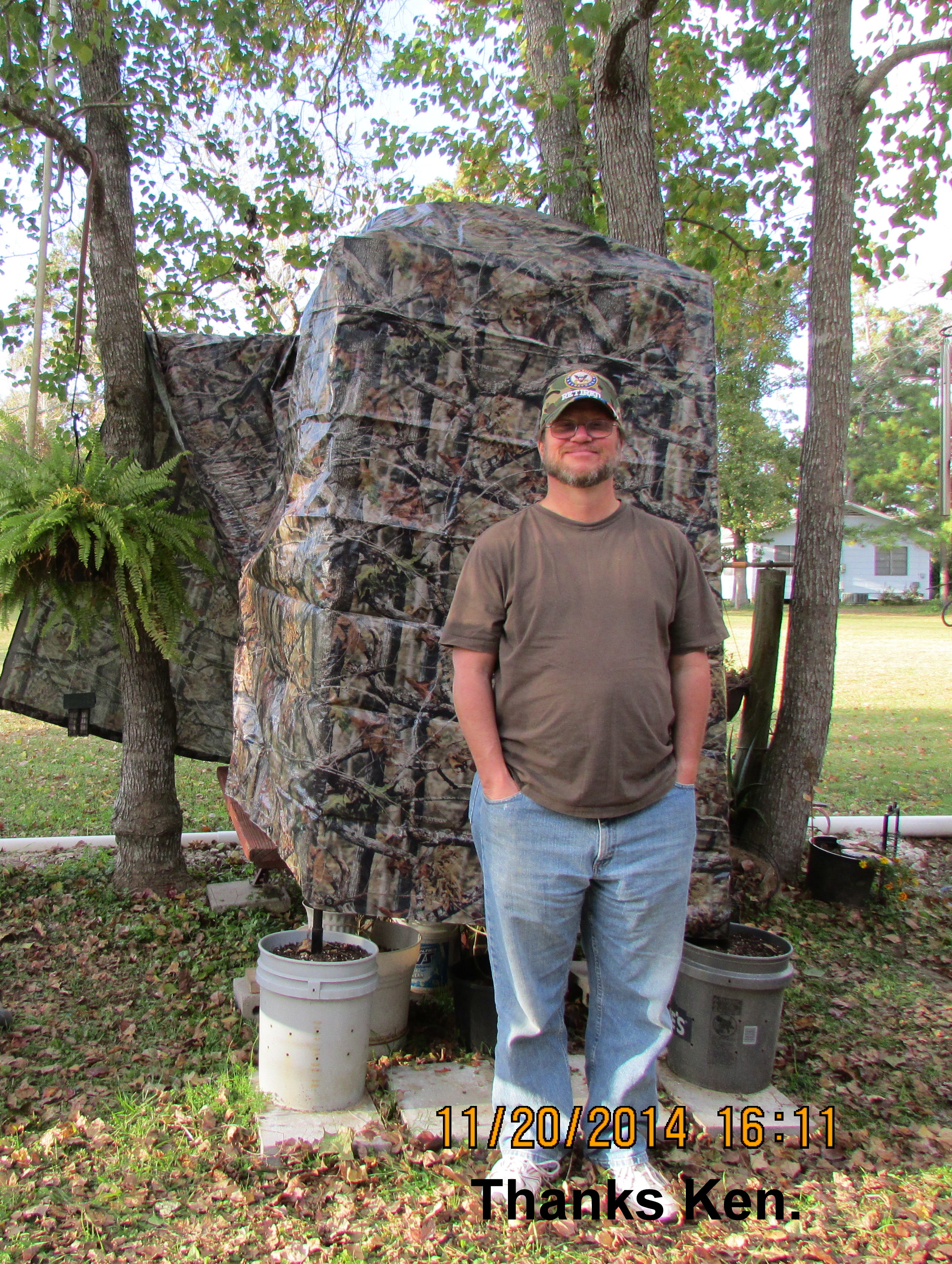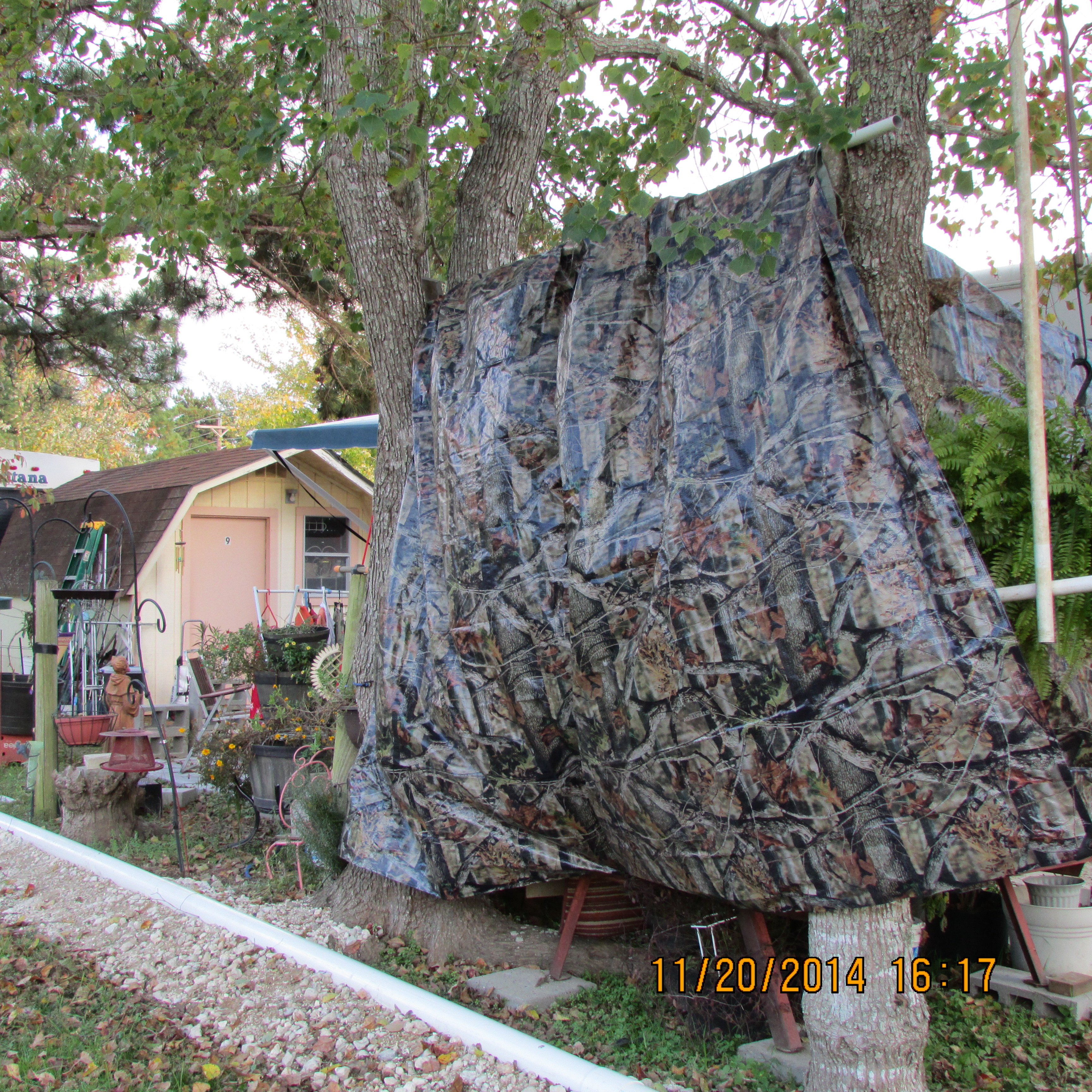 The day was exceptionally nice–and warm. The temperature reached 70 degrees (or more here; 76 degrees in Houston). I should have worked in the yard and storage building but prepared previous message Keep it simple. I had three visitors (extremely unusual) and we sat on the patio and chatted. One hour into our conversation, I suddenly asked Ken if he would help me with a project. He hesitated…, skeptical? I pointed out my proposed shelter and said I need help spreading the large tarp. He was agreeable… and it did not take very long. The pictures tell the story. IMHO, it looked good. Next time we have some freezing temperatures, my perennial plants will be safe.