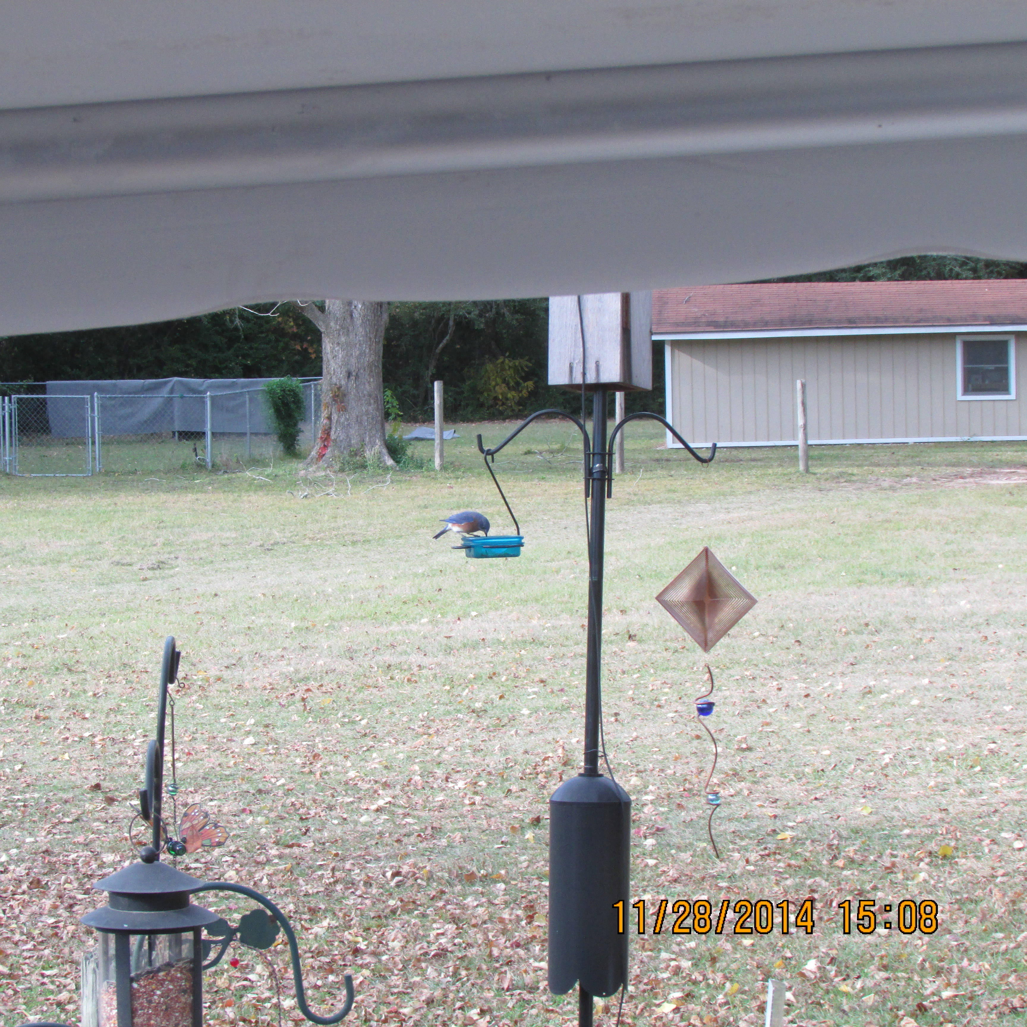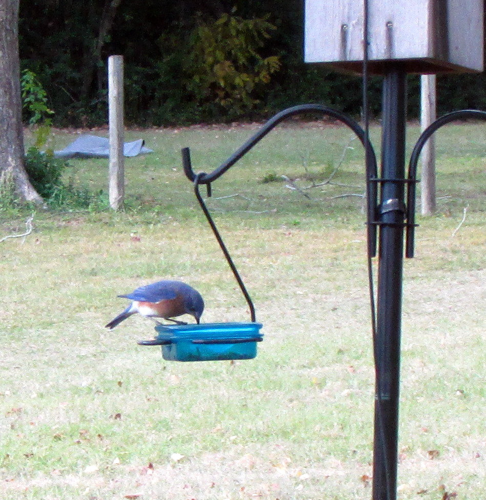 Oh joy!! This morning, I saw a Bluebird for the first time in months. It flew by the area where a feeder formerly hung. I was so excited, I quickly went to the storage shed for the feeder–and dried mealworms. I hung them… and watched (off and on) all day. I was rewarded–at 3:08–with this picture. My perfect “going away” present. I love Bluebirds!!