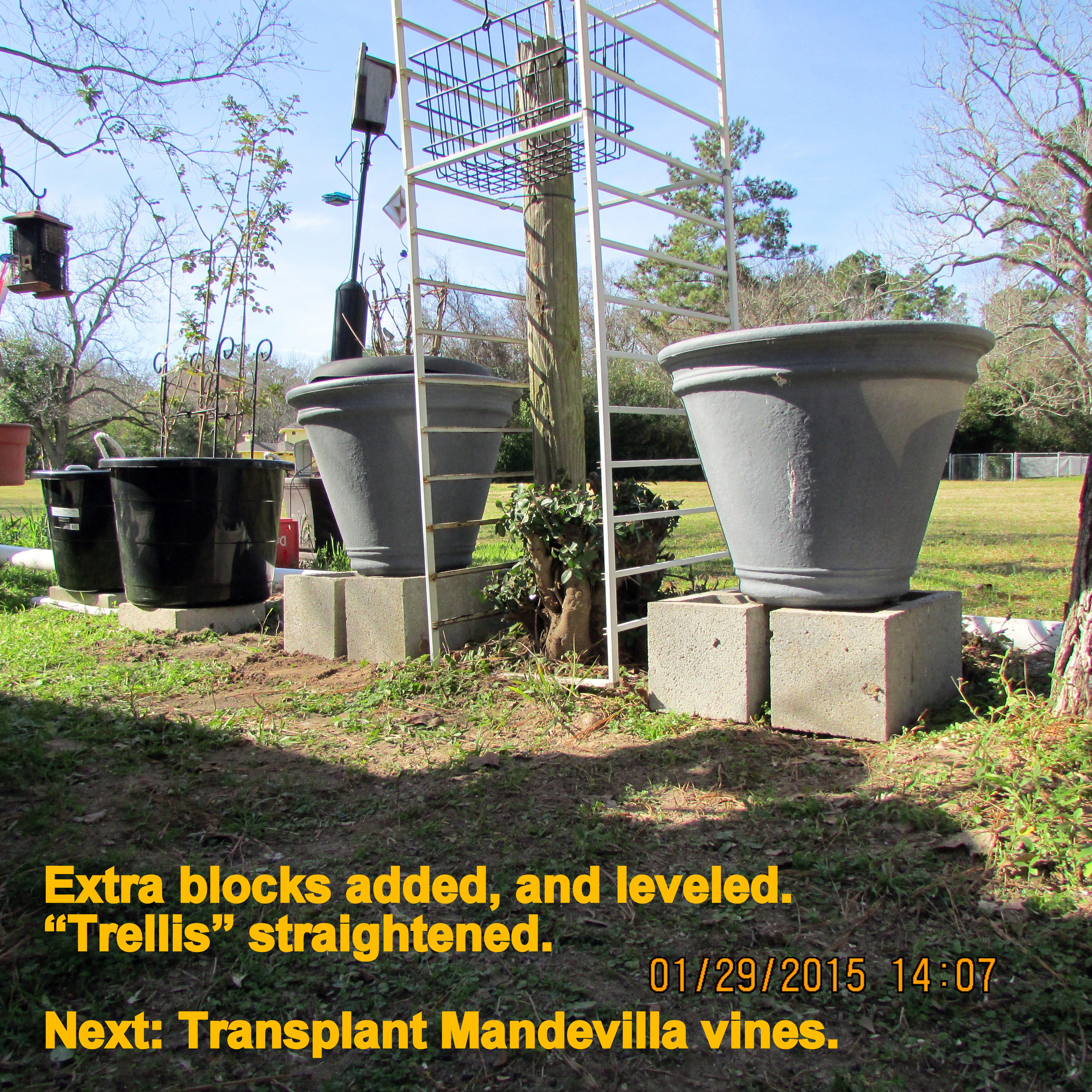 True to my earlier comments, I elected to work in the yard. (The pictures were an afterthought. I probably started before noon.) Getting that white frame “trellis” over the fence post and around a gnarled tree stump was a major challenge!! Had I planned my pictures, I would have a “before” picture with all the subsequently removed new growth on that tree stump. I’ve doused the stump with root killer and will continue to trim… and douse… until it is no longer a nuisance. ~~ Age-wise, I did too much?!?! My arms and shoulders ache!! ~~ The simulated whiskey barrel planters were arranged, and rearranged. I want similarity with variety of size and elevation. ~~ Having moved plants from the shelter, I pray we don’t have any more freezing weather. In a few days, or a few weeks, I’ll drill holes in the bottom of the large tubs and transplant the Mandevilla vines into the larger containers. (First, I’ll retrieve new planters from the storage unit so I can drill all at the same time.)