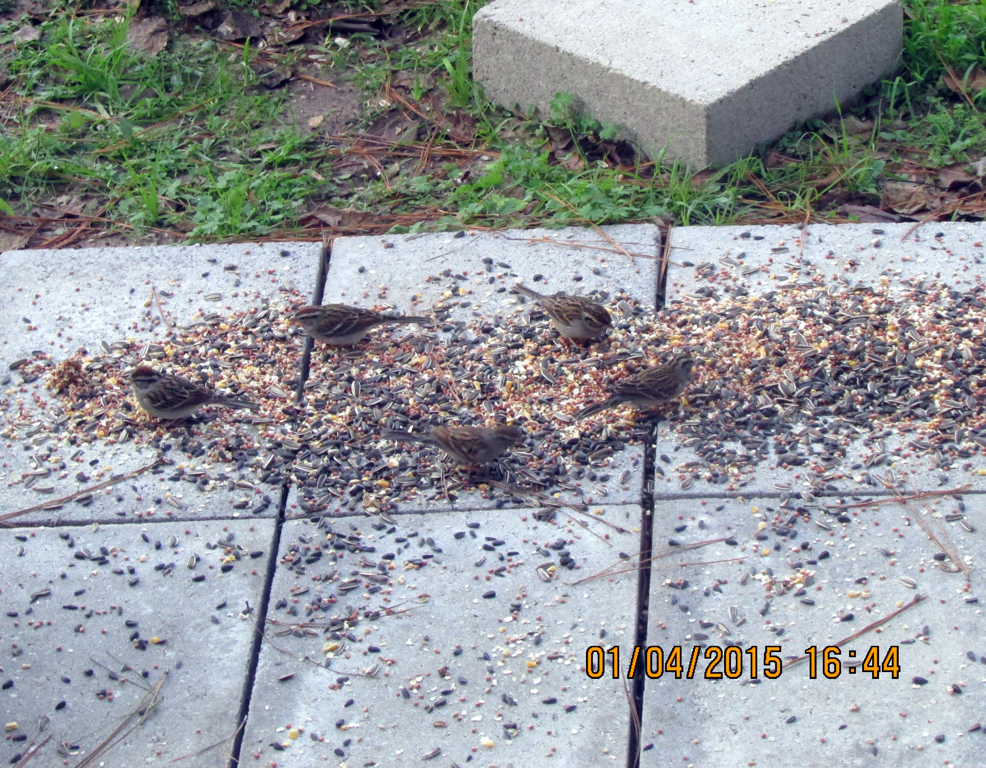 This is curious!! That seed was wet, and dumped from the feeders before refilling the feeders. But I sprinkled it on the patio “in case” the birds or squirrels might want it. No sign of birds at the hanging feeders. Isn’t that strange??