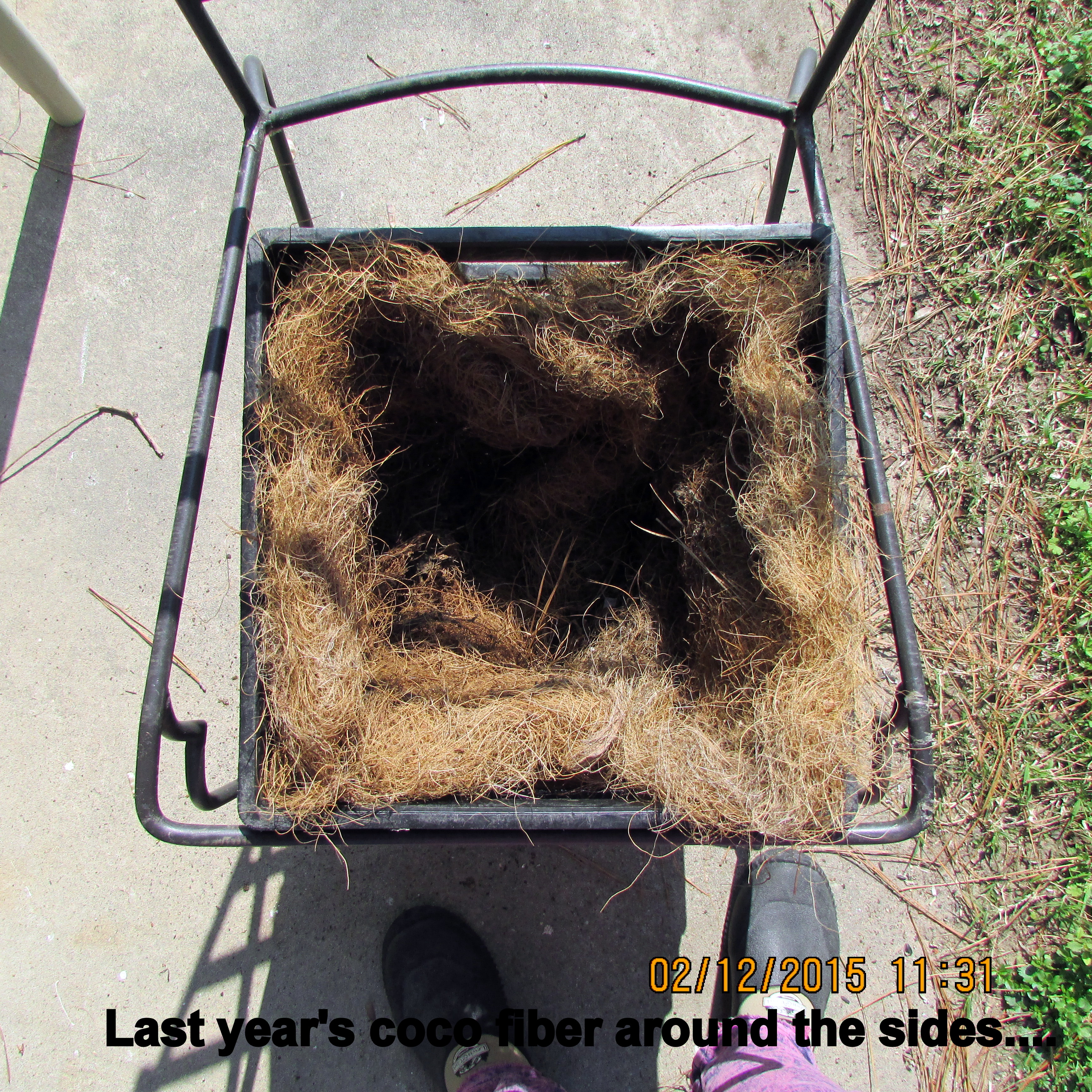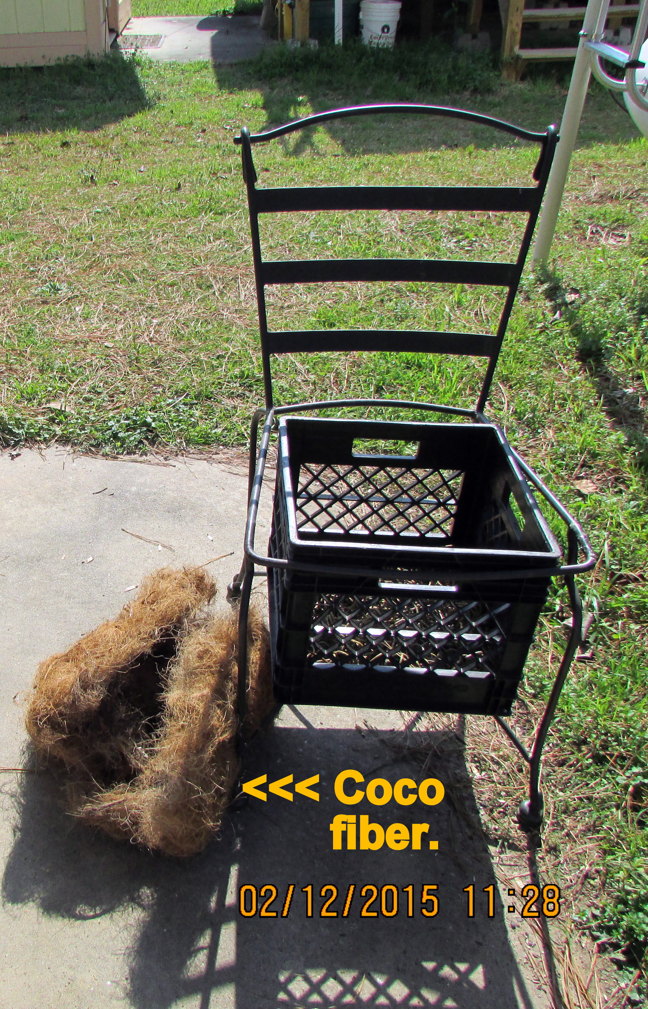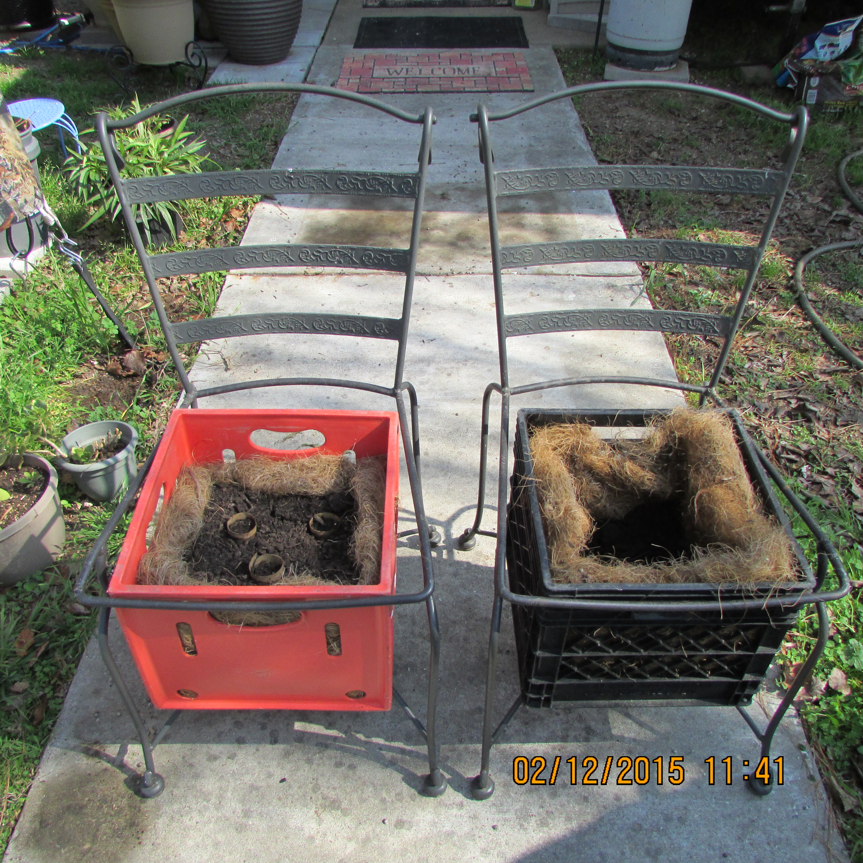 On a chilly morning, while wearing a jacket, I started a project I’m labeling an experiment. The plastic webbing was cut away from the chair–and inserted in the bottom of the crate. Two objectives: Cover the bottom of the crate, plus additional drainage benefits. As I said, “an experiment.” Next: Coco fiber around the sides. Coco fiber did not work well here in Texas last year (okay in planters in North Carolina). I’m recycling the used fiber. Then I added the last of a bag of organic planter soil (from last year). The crate-planter needs a lot more soil. I intend to insert a Tristan Strawberry plant in this peculiar chair-planter. See the fraternal twins (ha): Cucumber seeds planted in orange-color crate. ~~ “An experiment” because the soil in both crate-planters may dry out too quickly (as the soil dried out too quickly in coco fiber Texas hanging flower baskets). I’m hoping the roots of the plants will be very happy with good drainage and ventilation. I’m hoping…. ~~ I can re-position the chairs for sunshine or shade depending upon the weather. Trust me: You’ll learn more about this experiment as the months go by.