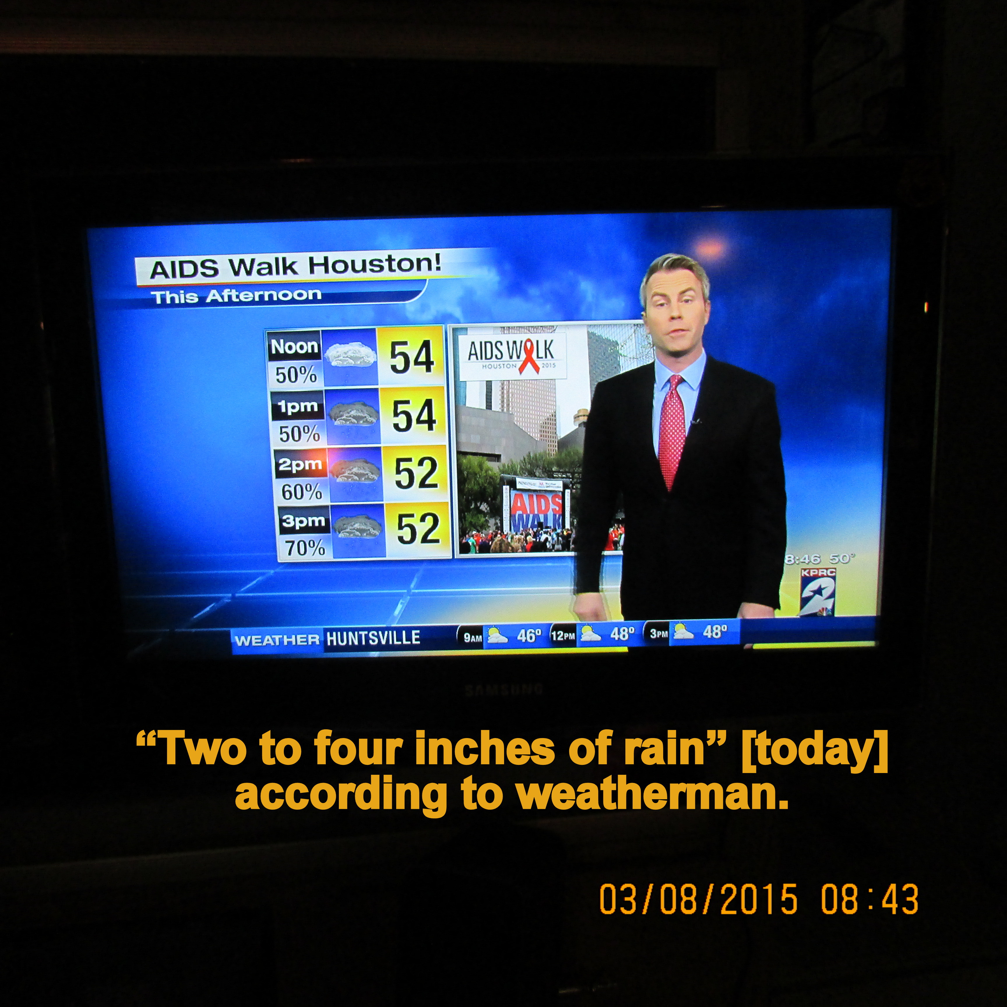 Postscript, Sunday, March 8, 2015, 9:00 AM: I awakened to hard rain at 1:45. Several days of rain expected; two to four inches today. Had I known, I wouldn’t have started the “fold the tarp” project.