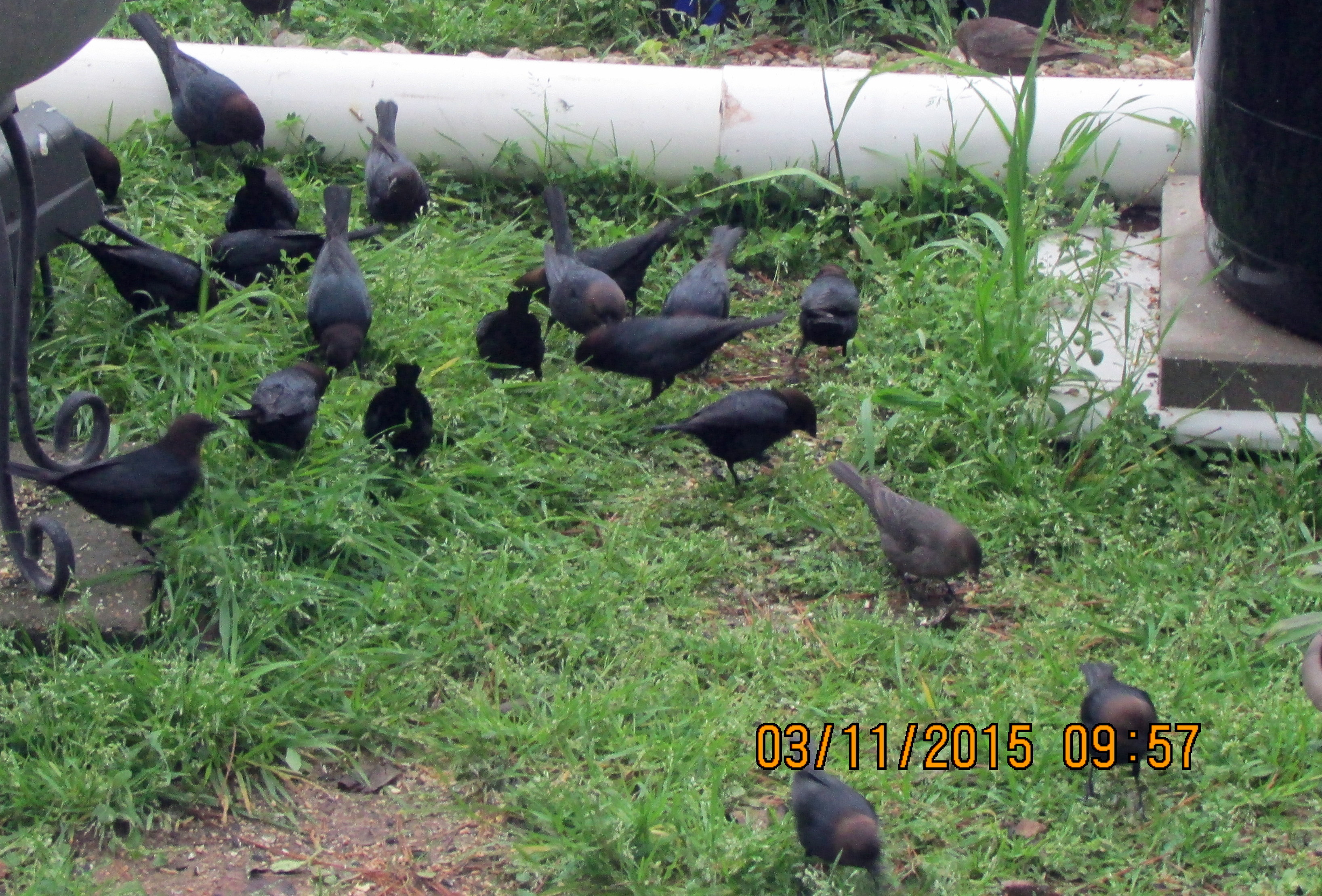Peeking out the window; “lurking”; camera in hand. I’m fascinated by the birds!! I’m not afraid of them; they don’t attack me (remember Alfred Hitchcock’s movie The Birds?). Grackles (I think they are Grackles) have taken over the Universe!! Cardinals, and Finches, can’t get to the feeders. Even the Robins leave the field when the black birds descend like a cloud. The invaders are bullies; they push and shove. Or, are they just extremely hungry?? ~~ At this rate, I’ll go through a fifty pound bag of bird seed in about one week!! ~~ On the Internet, trying to correctly identify, I am confused. These might be Cowbirds.