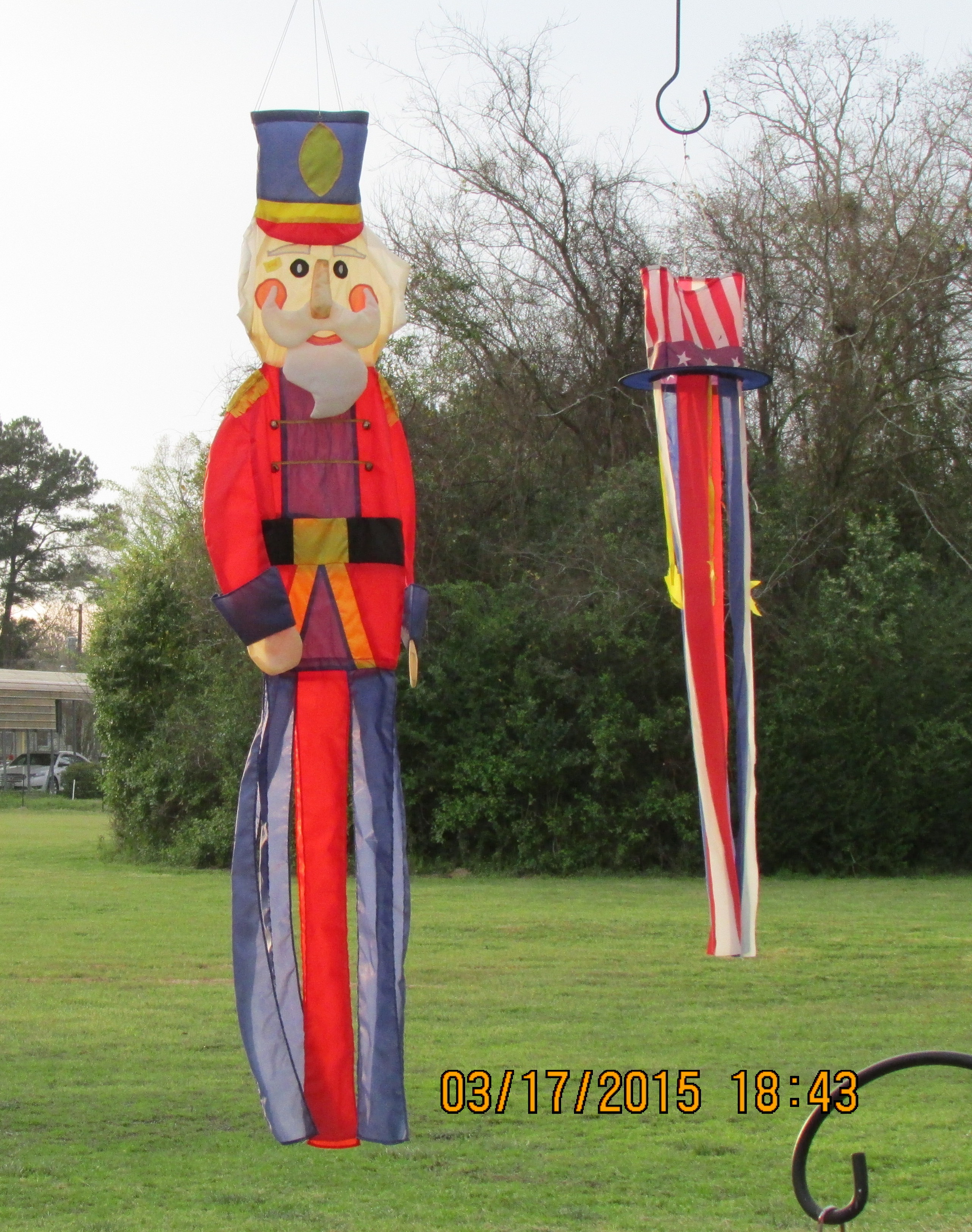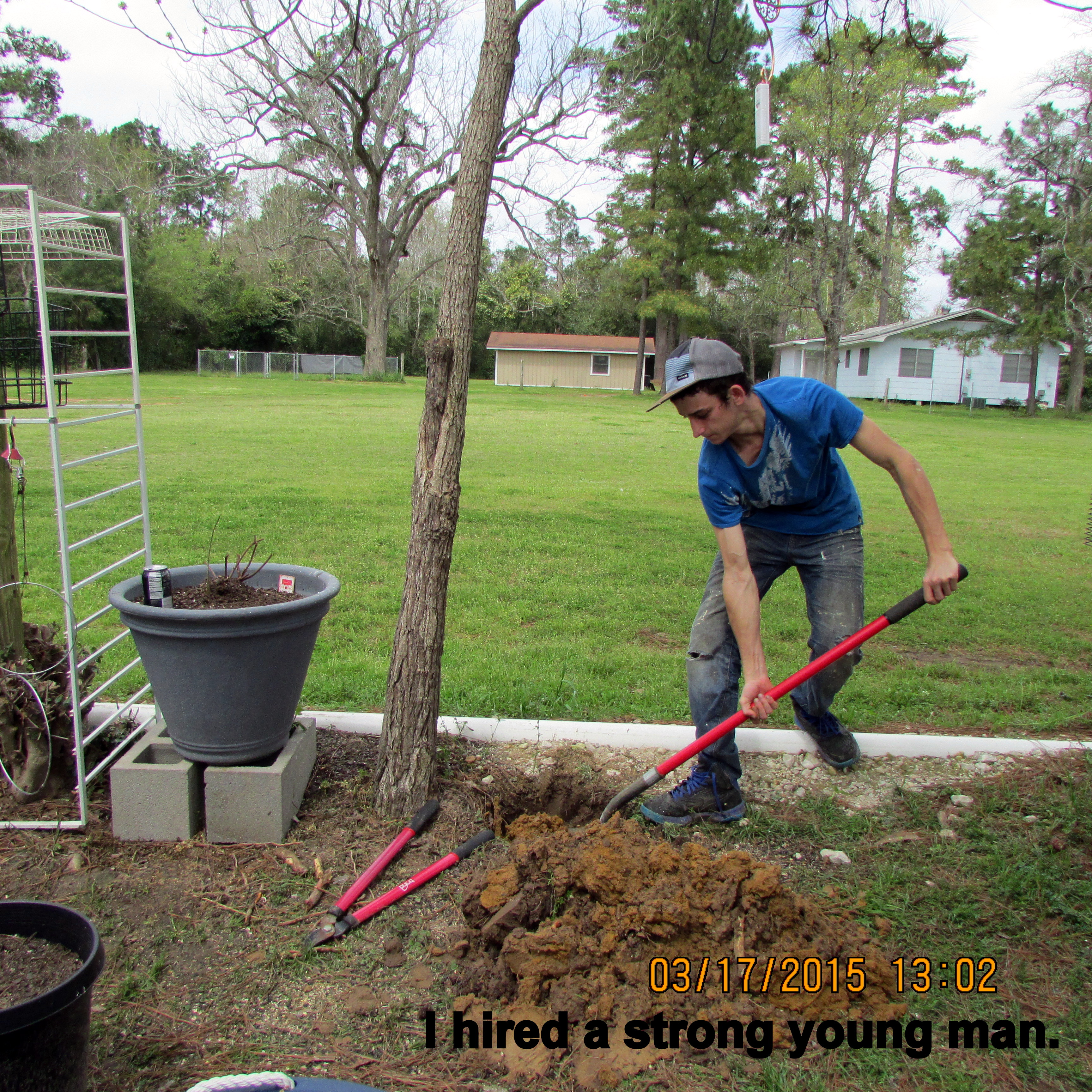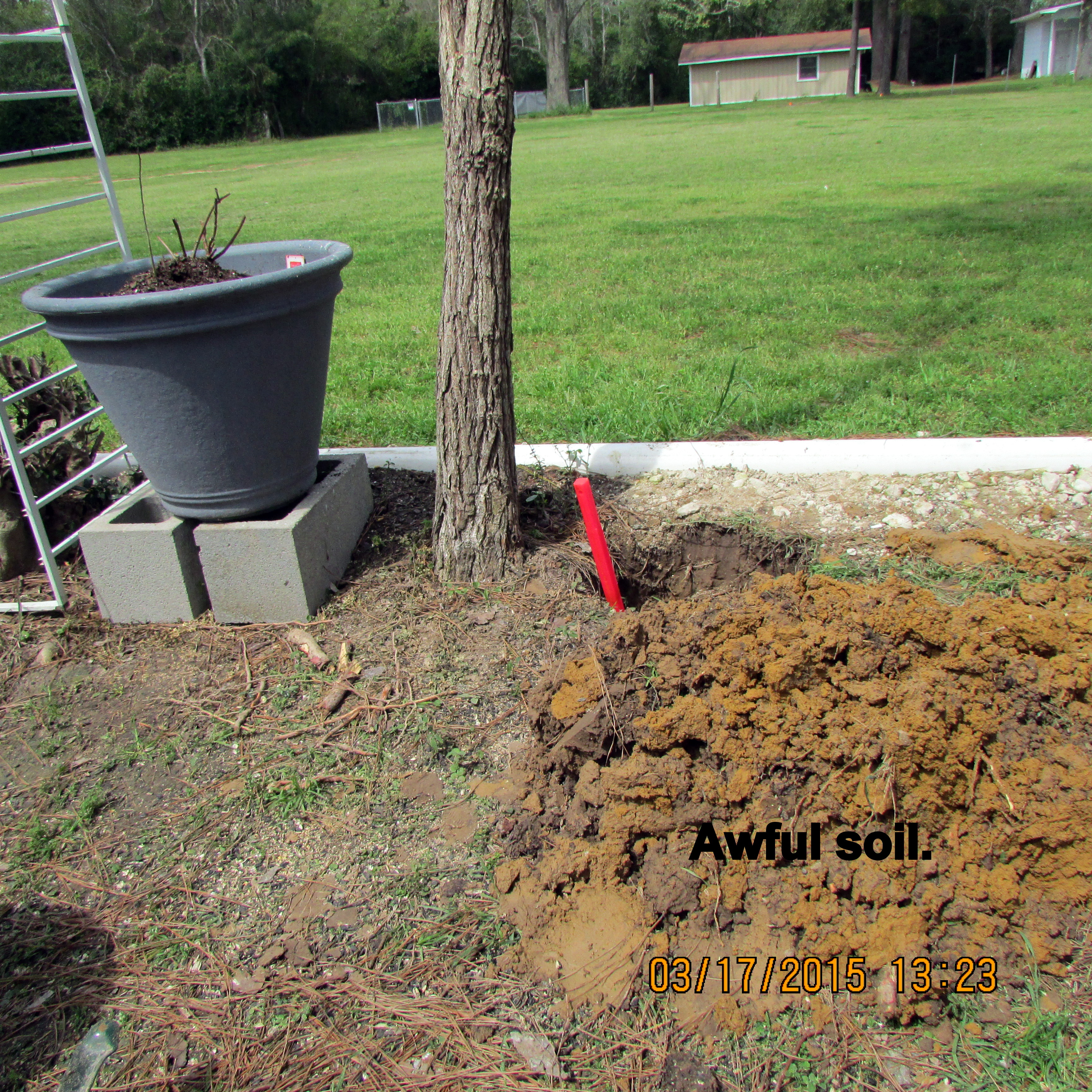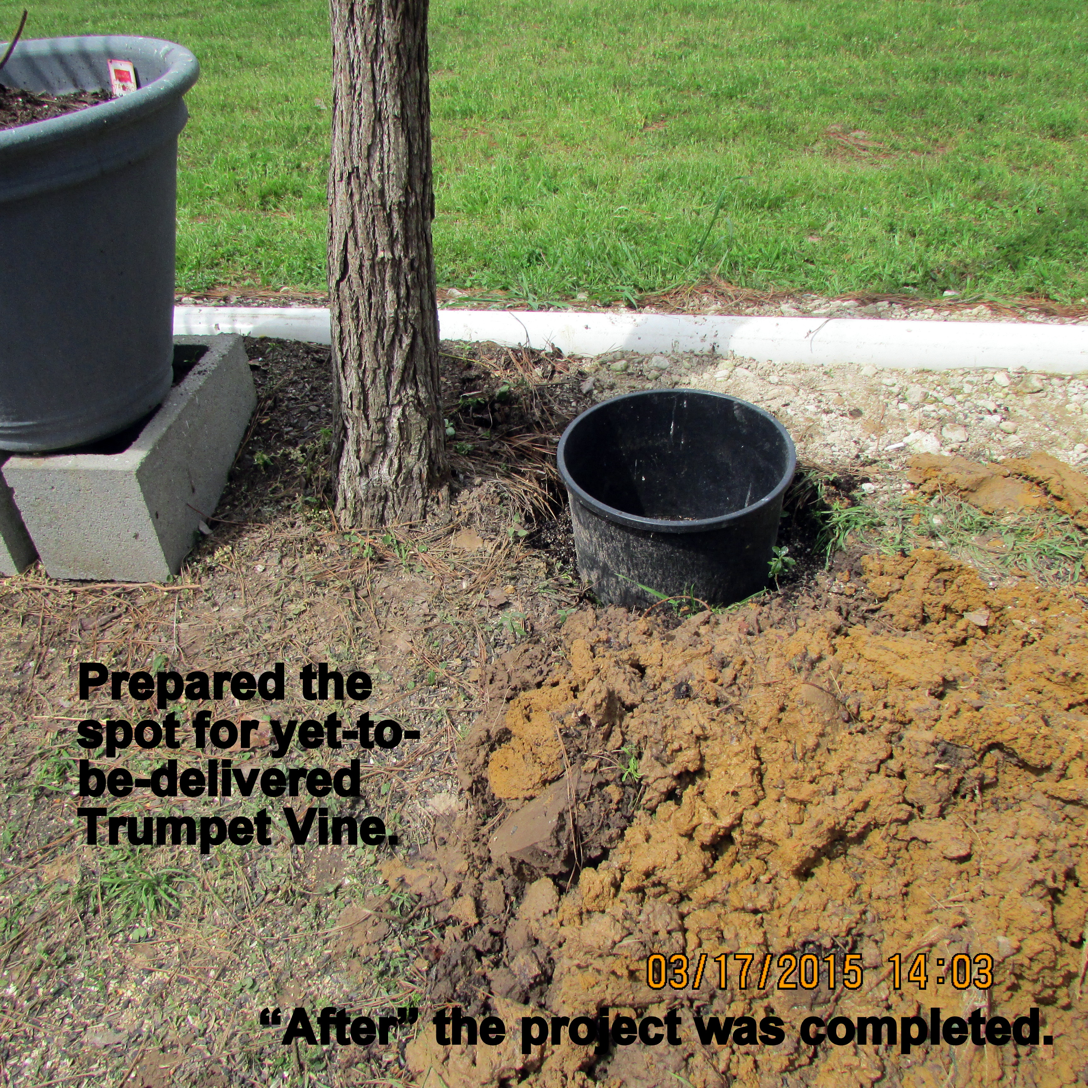 Working in the storage unit (down the highway) was my planned activity for the day. However, a long-awaited helper became available so my focus was on “a hole in the ground.” I’m preparing for the yet-to-be-delivered (Internet purchase) Trumpet Vine. ~~ Enjoyed my breakfast “tea” while sitting on the patio. ~~ Puttered in the yard, pulling weeds, filling bird feeders, etc., until our delicious noon meal. Corned Beef, cabbage, potatoes, carrots, etc., and all the residents wearing green for St. Patrick’s Day. ~~ I’m preparing this blog between four and five PM and must confess that I am as tired as if I had dug that hole myself!! Well, I did “fill” the hole!! Pine cones in the very bottom for drainage, composted leaves and pine needles in the middle, last-year’s planter soil to ground level. I’ll use fresh planter soil in the planter around the Trumpet Vine. This should, hopefully, be a good start for the plant?! Why did I do it that way? I don’t know; it just seemed like “the right thing to do.” I’m counting on the vine to be a beautiful asset to my garden. Speaking of assets: I think the new (used/free) wind-sock is a nice addition. ~~ (I’ll remove the awful soil later.)