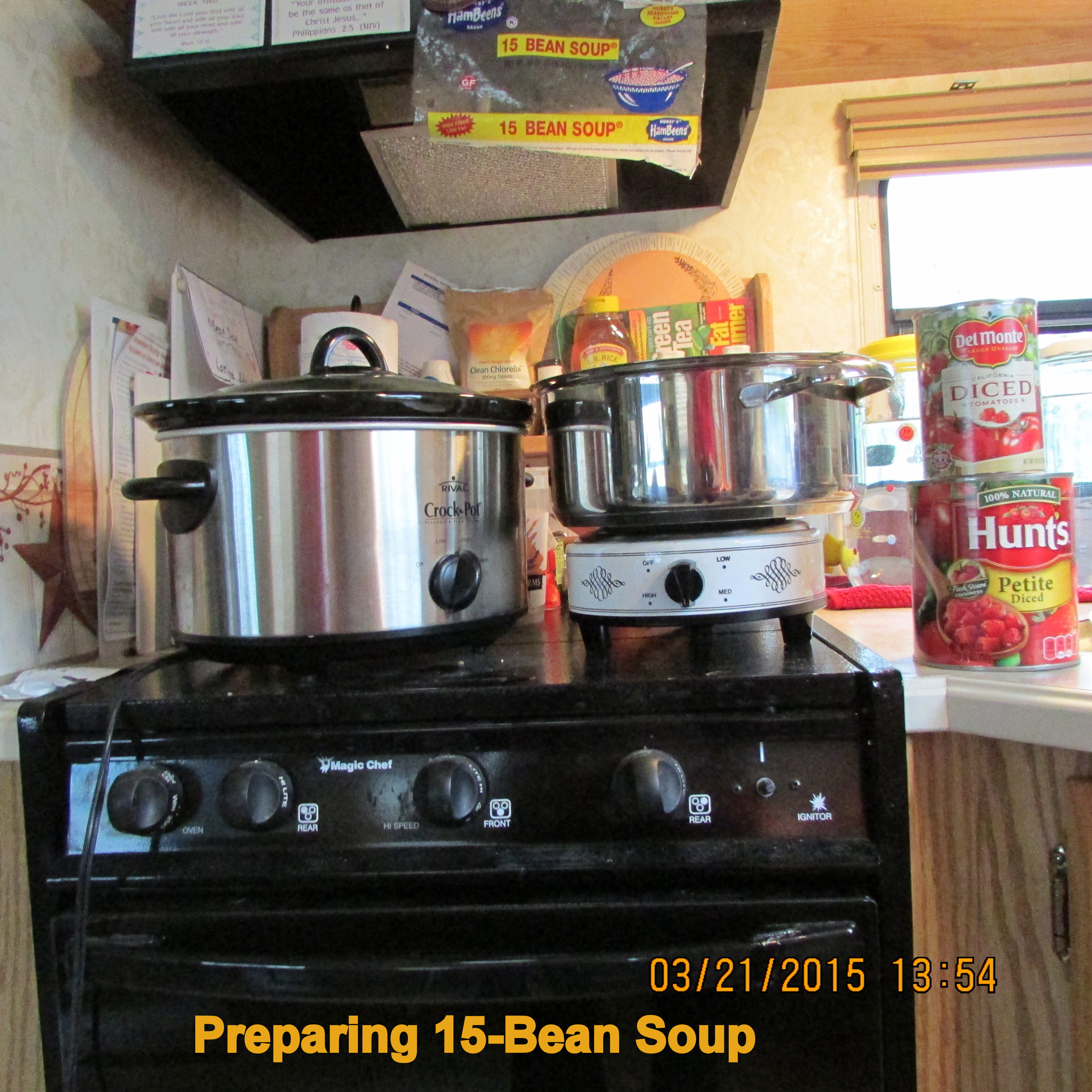 It is 15-Bean Soup for the “Soup Fest” Sunday evening at the Activity Center at Escapees Rainbow’s End RV Park. That event is the Kick Off for one week of activities for the CARE Health Fair. I’ll try to keep you informed as events unfold.