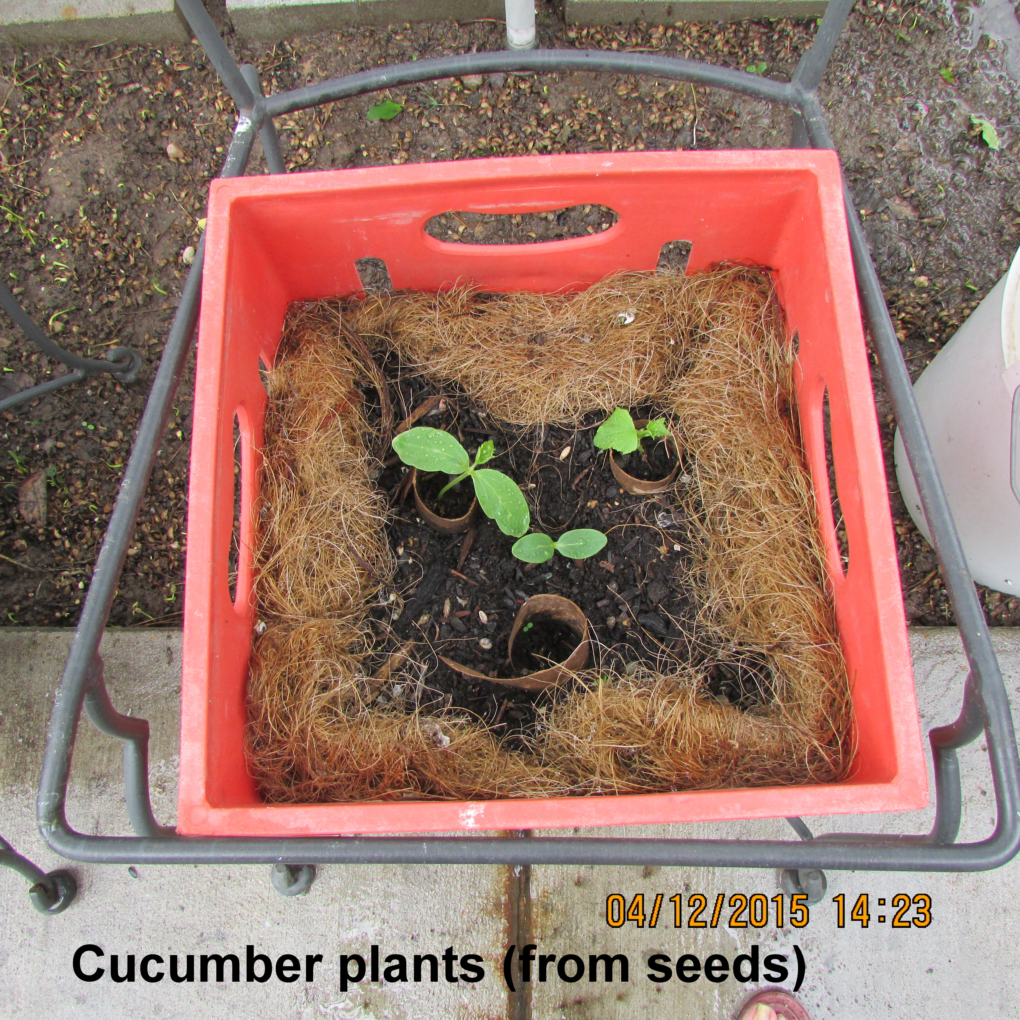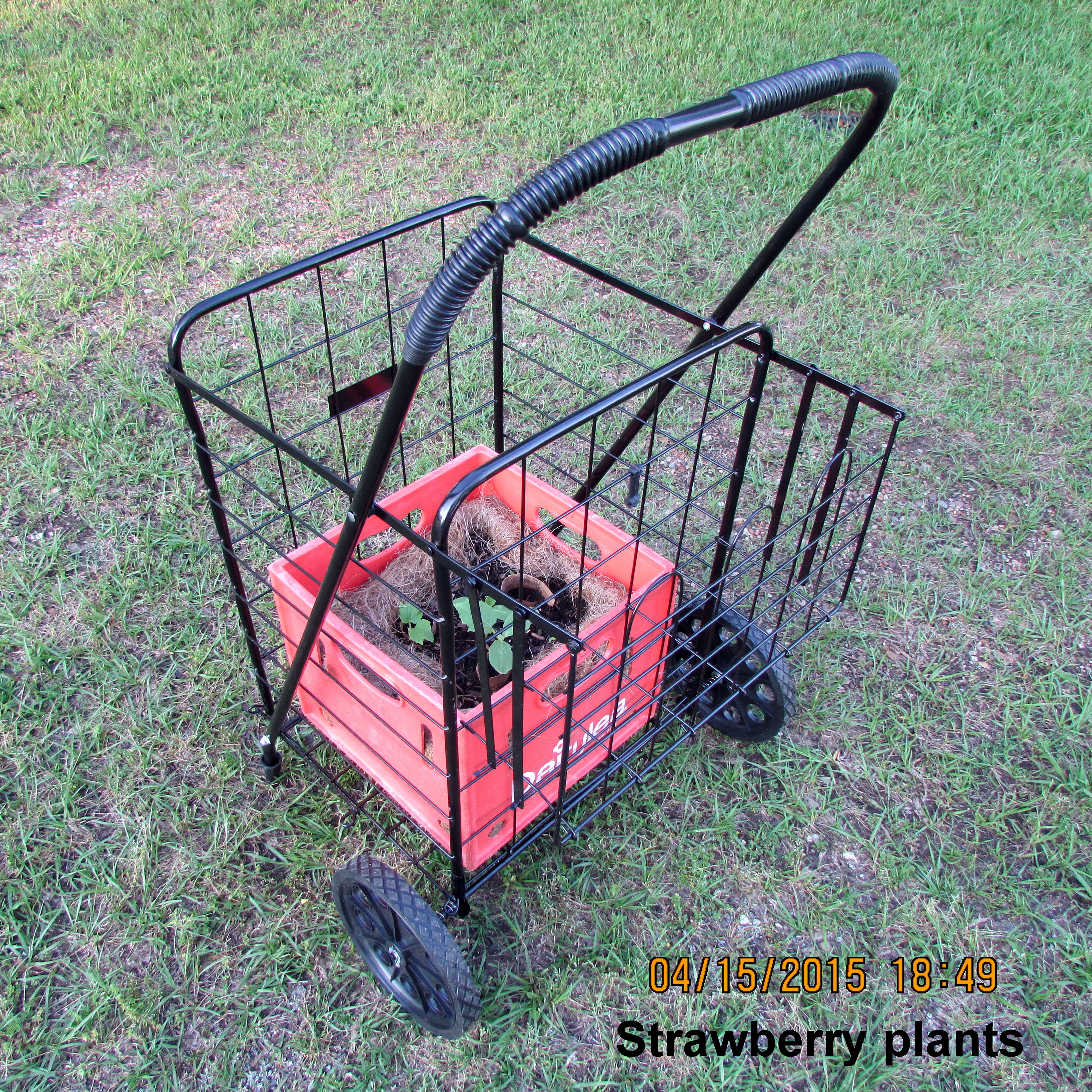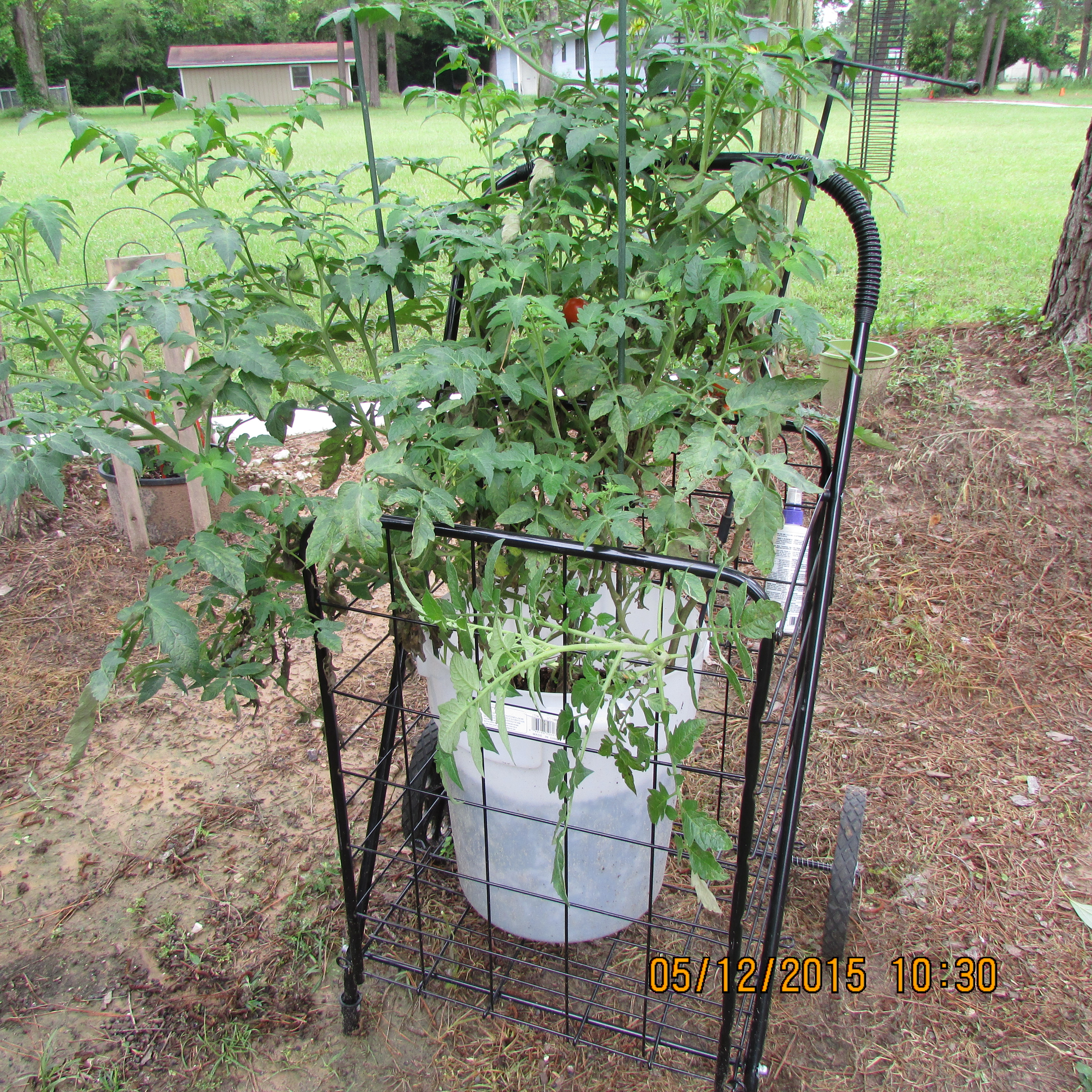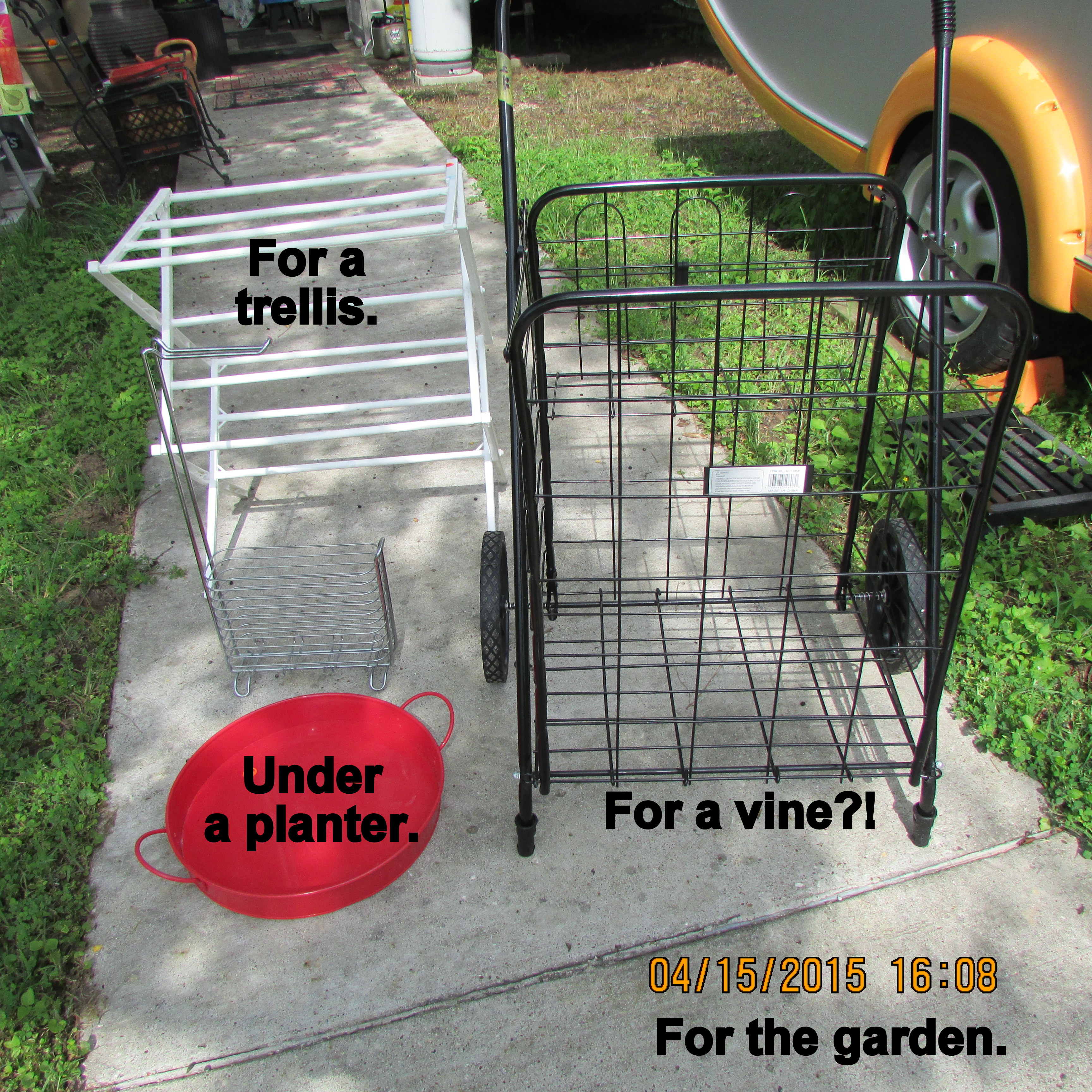 Yesterday I bought a nice new shopping cart for $4.00 (at our CARE Garage Sale). At first I planned to transfer the cucumber planter to it but “changed my mind” and moved the tomato plant instead. The plastic clothes drying rack will serve as a trellis; the red tray will go under a planter. I’m always shopping for things for my garden.