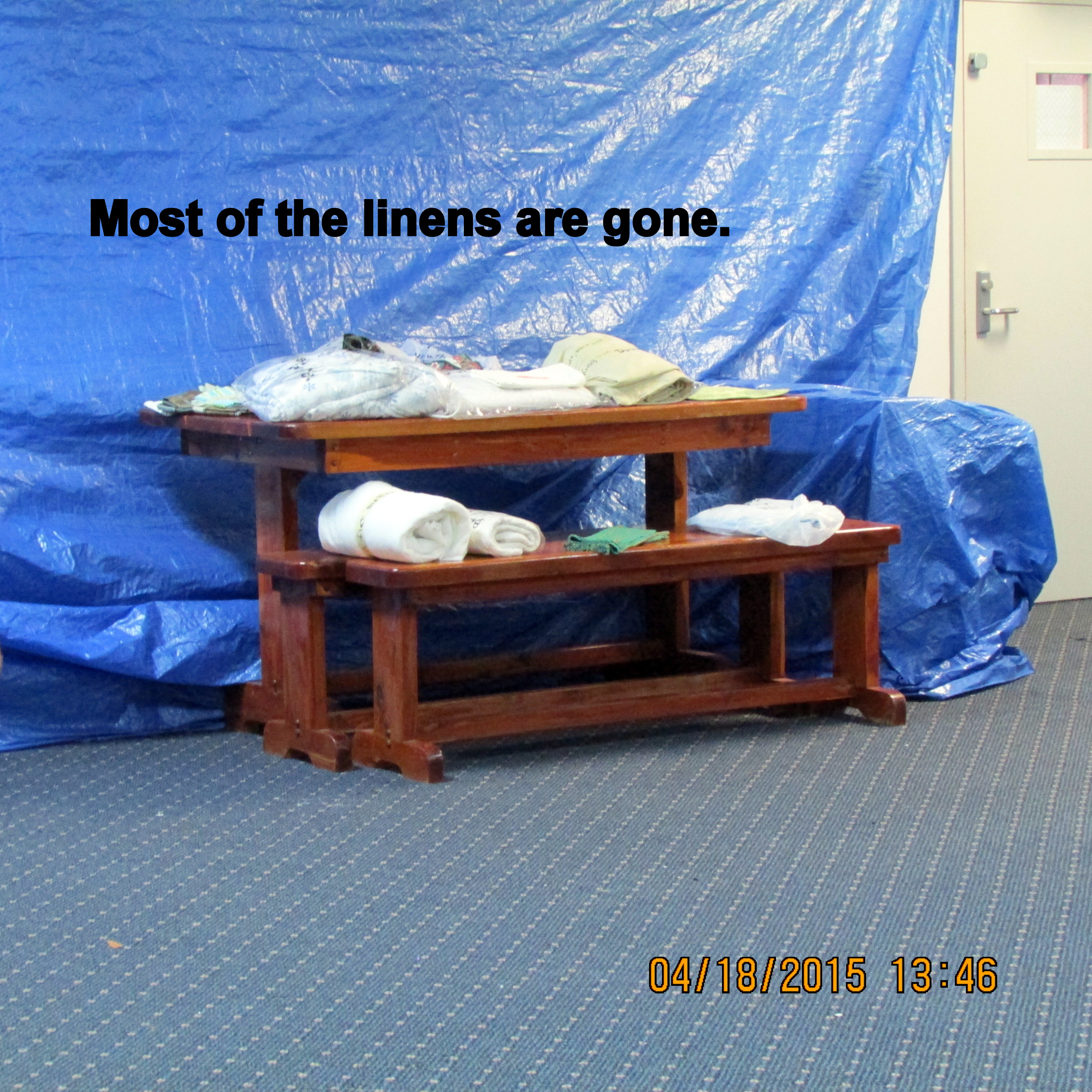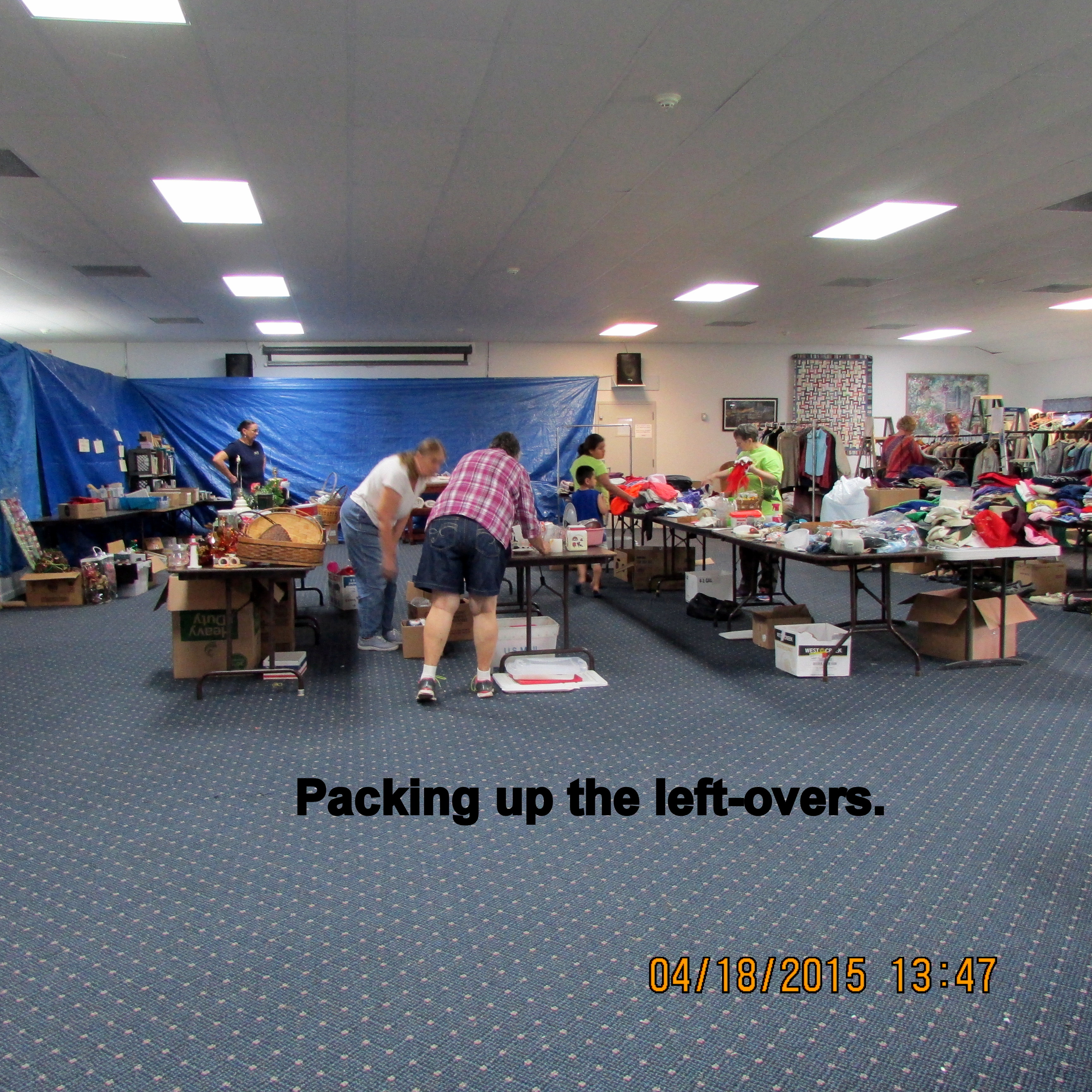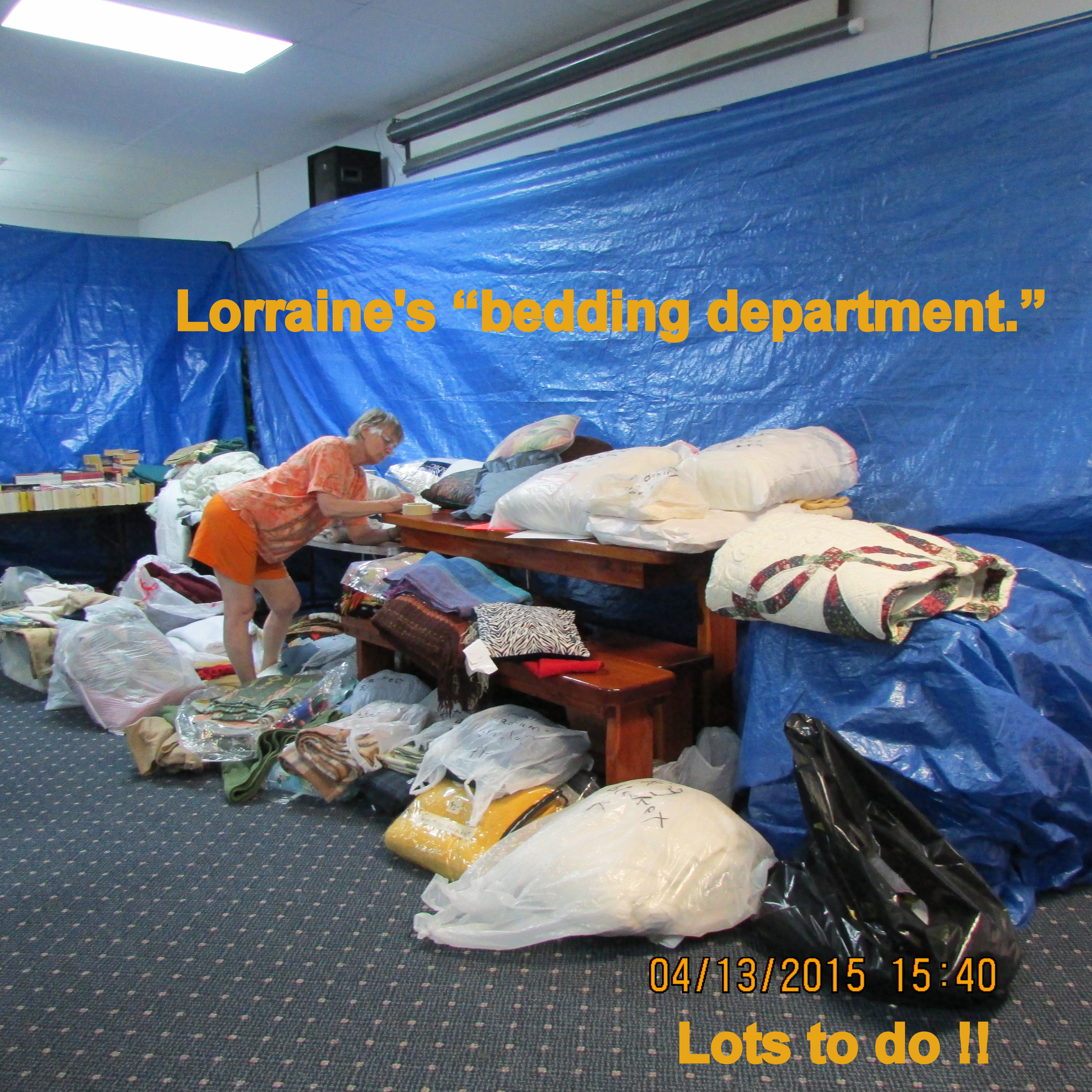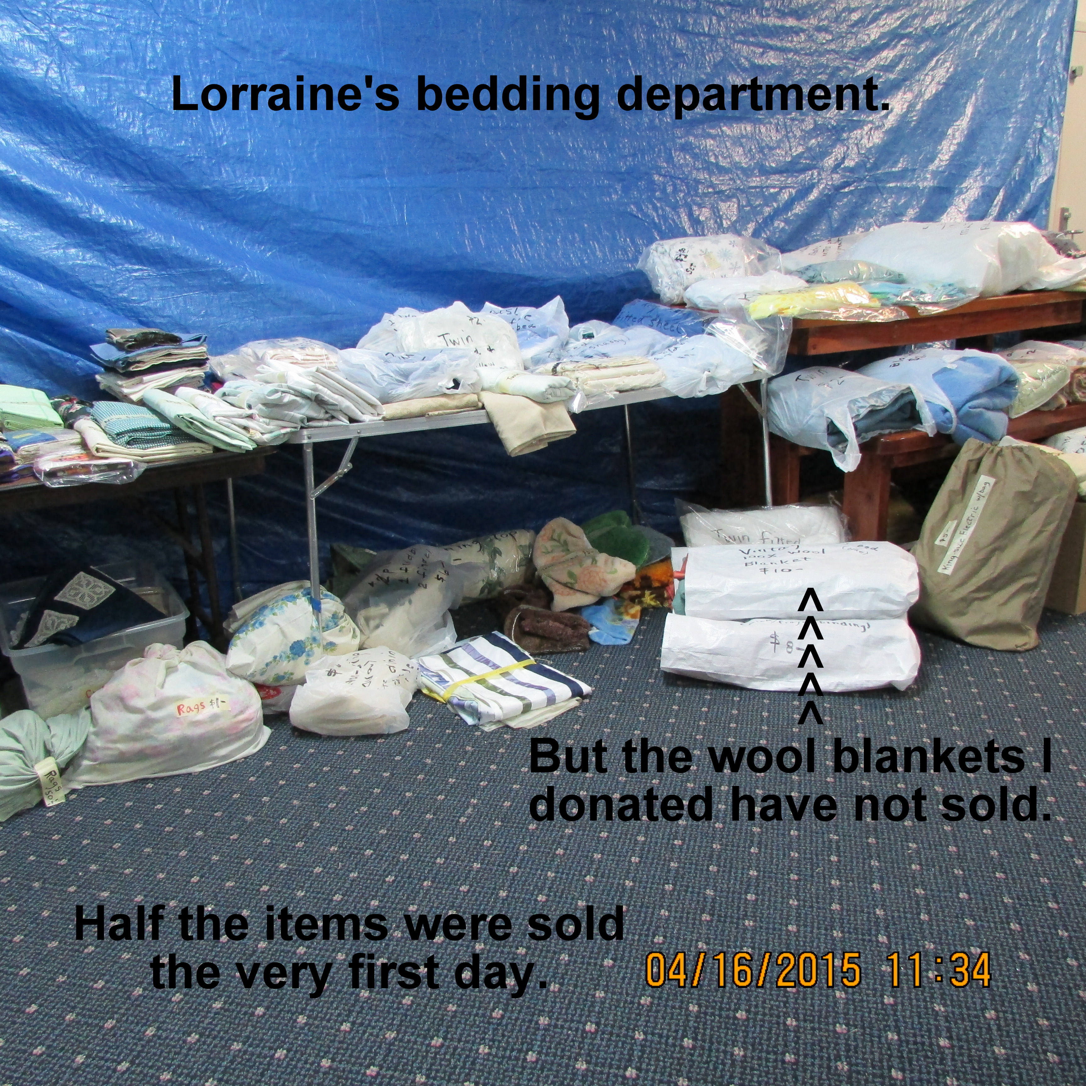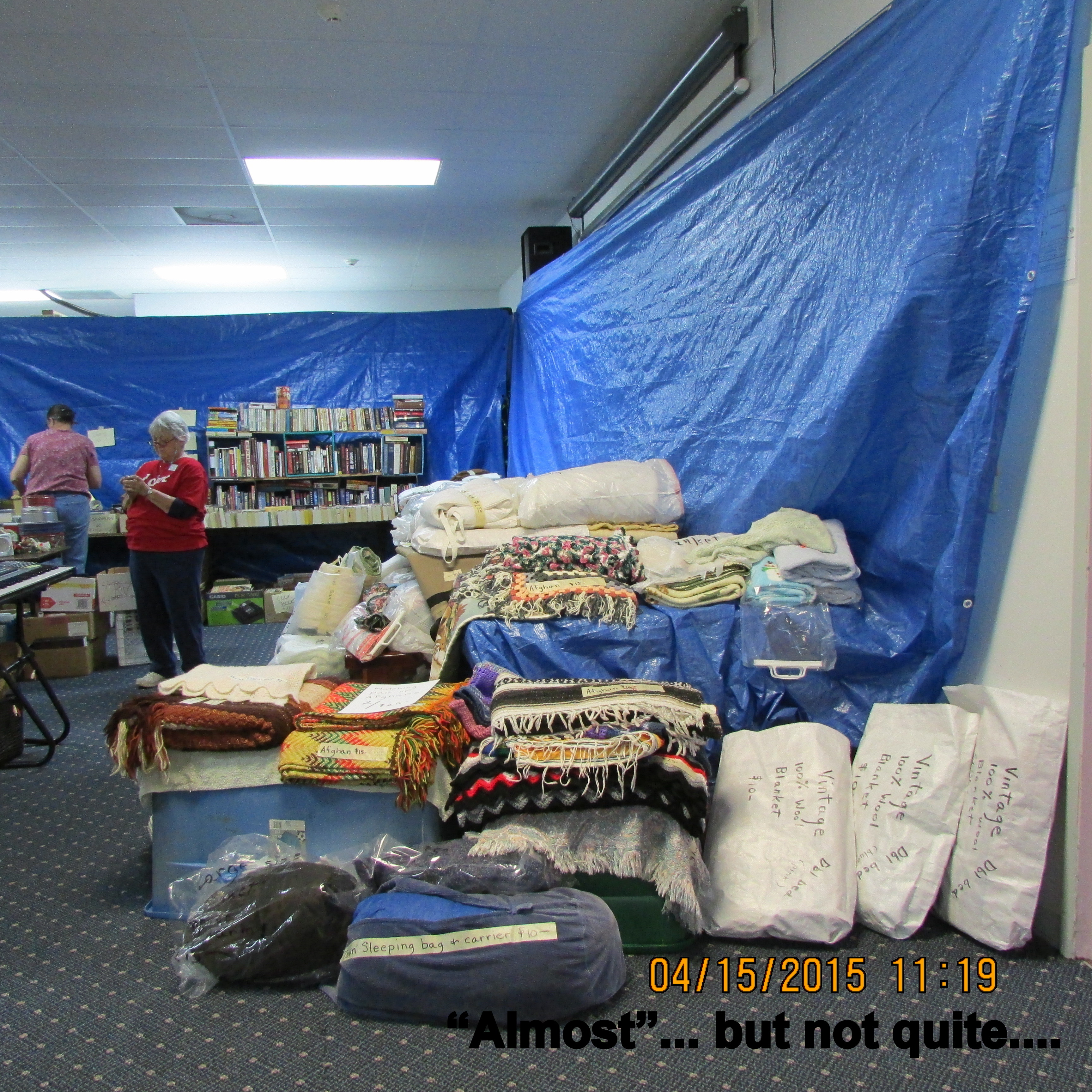 Half the bedding items sold–in my corner of the CARE Garage Sale. Despite serious rain storms, we had lots of customers and consider it a very successful day. One-and-one-half more days….