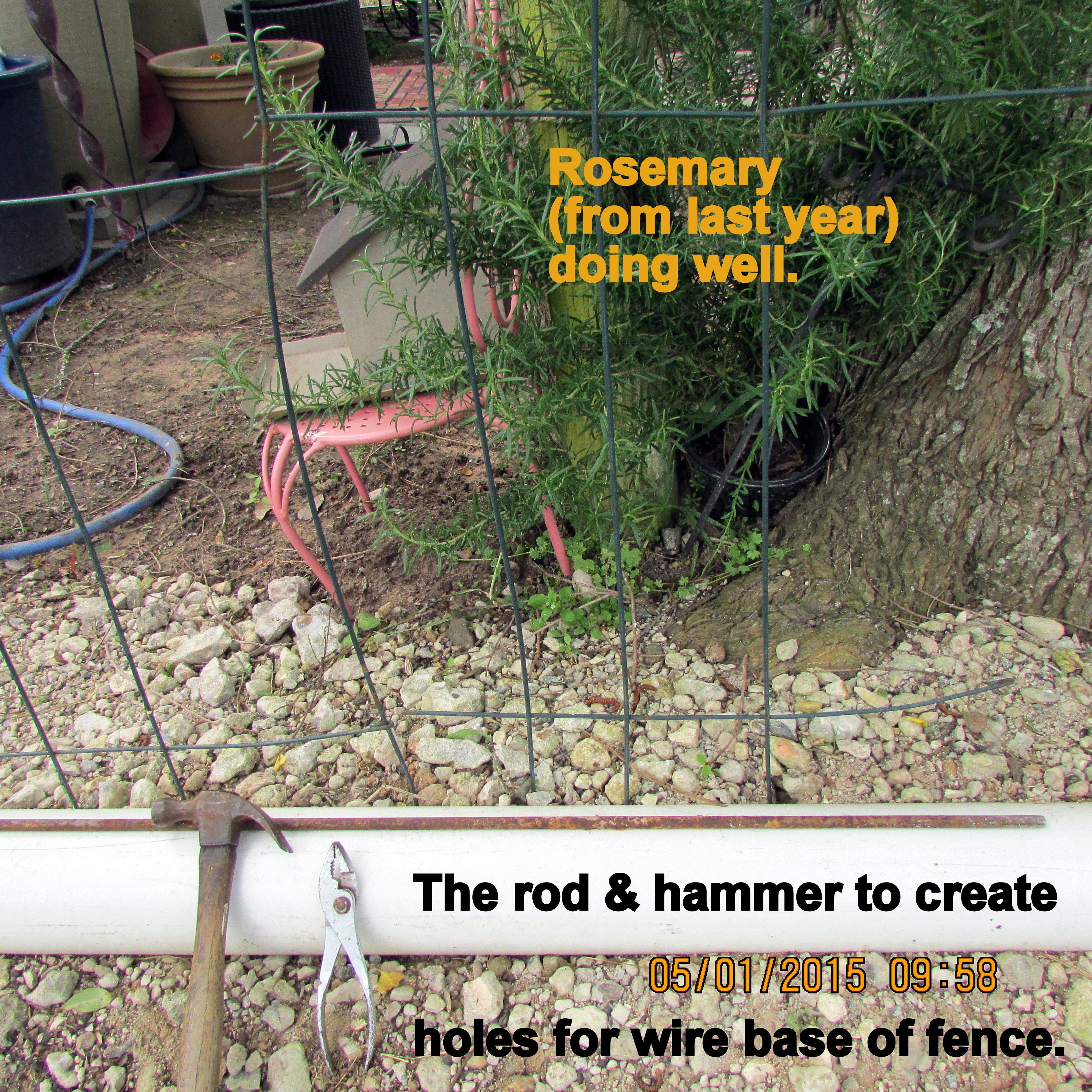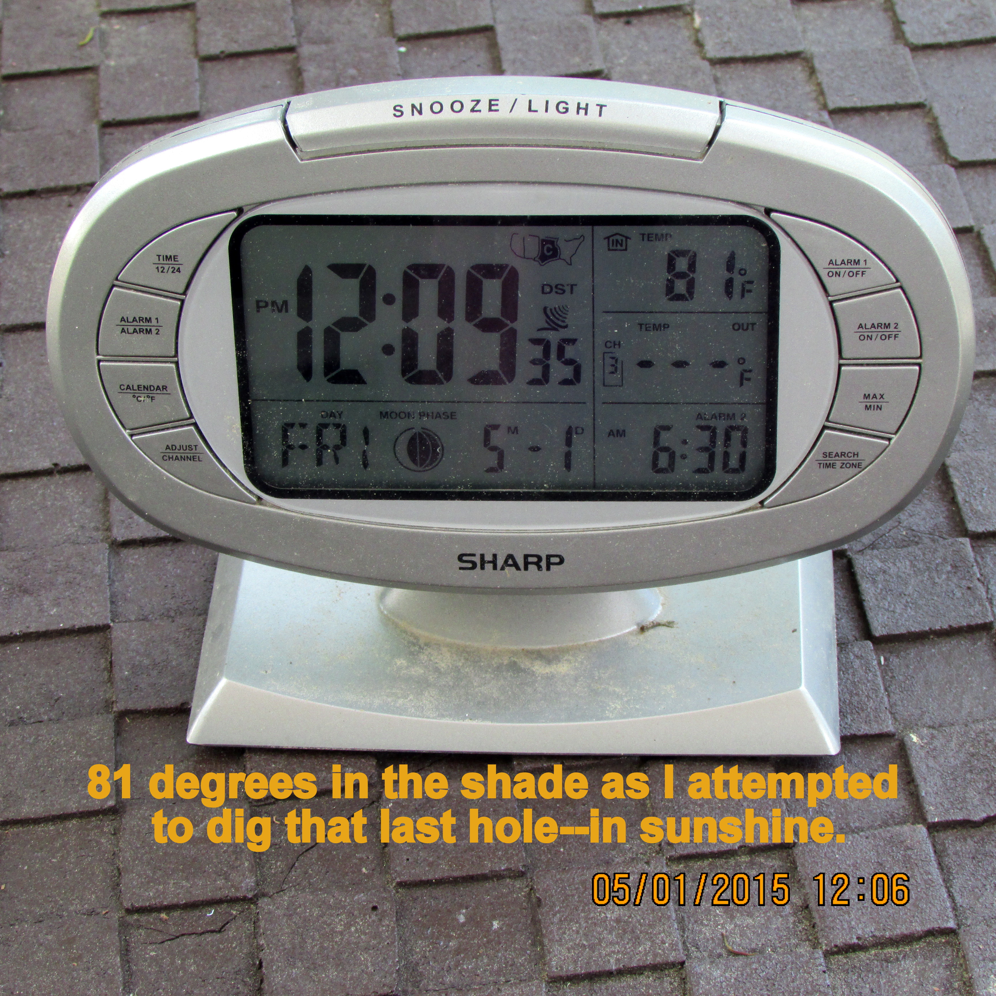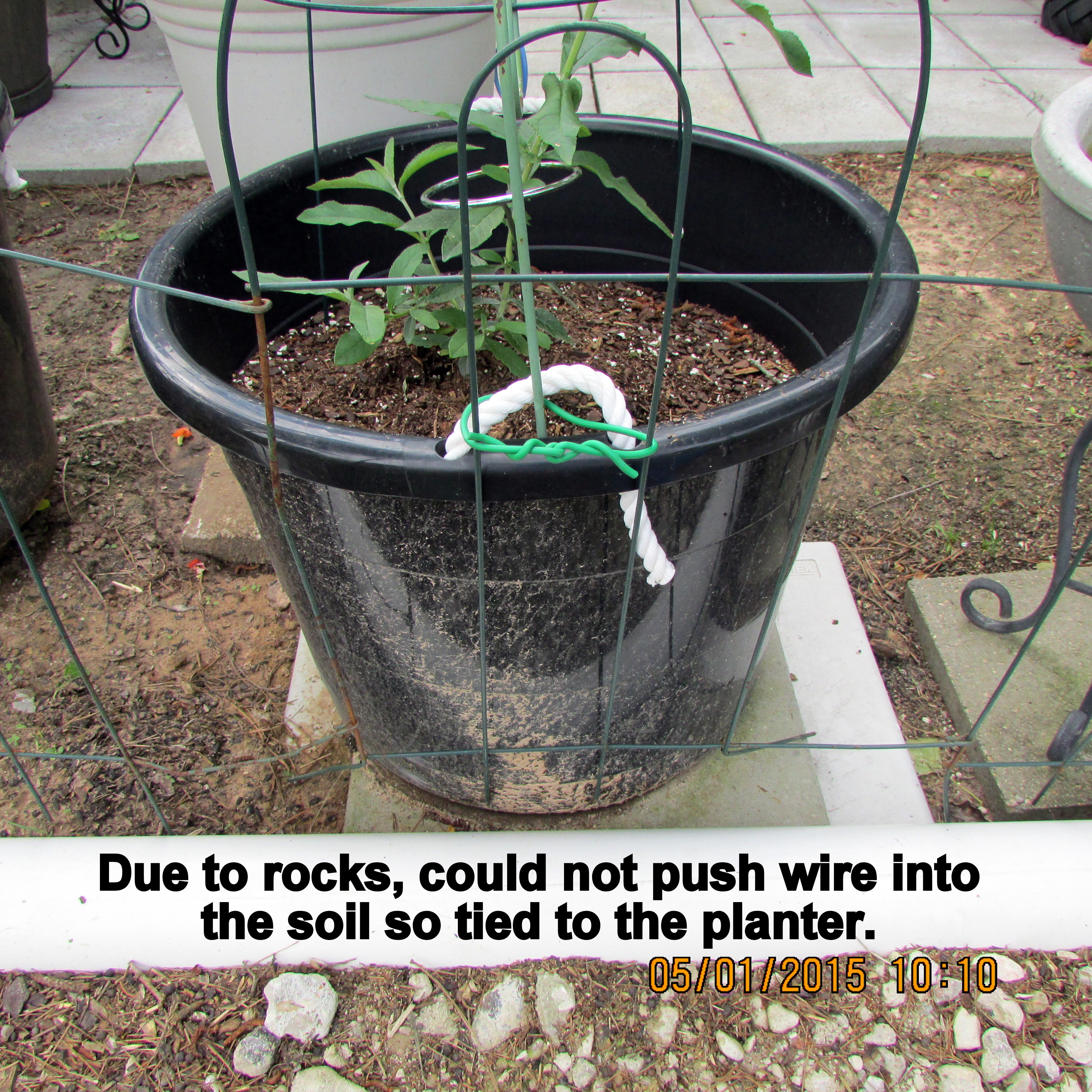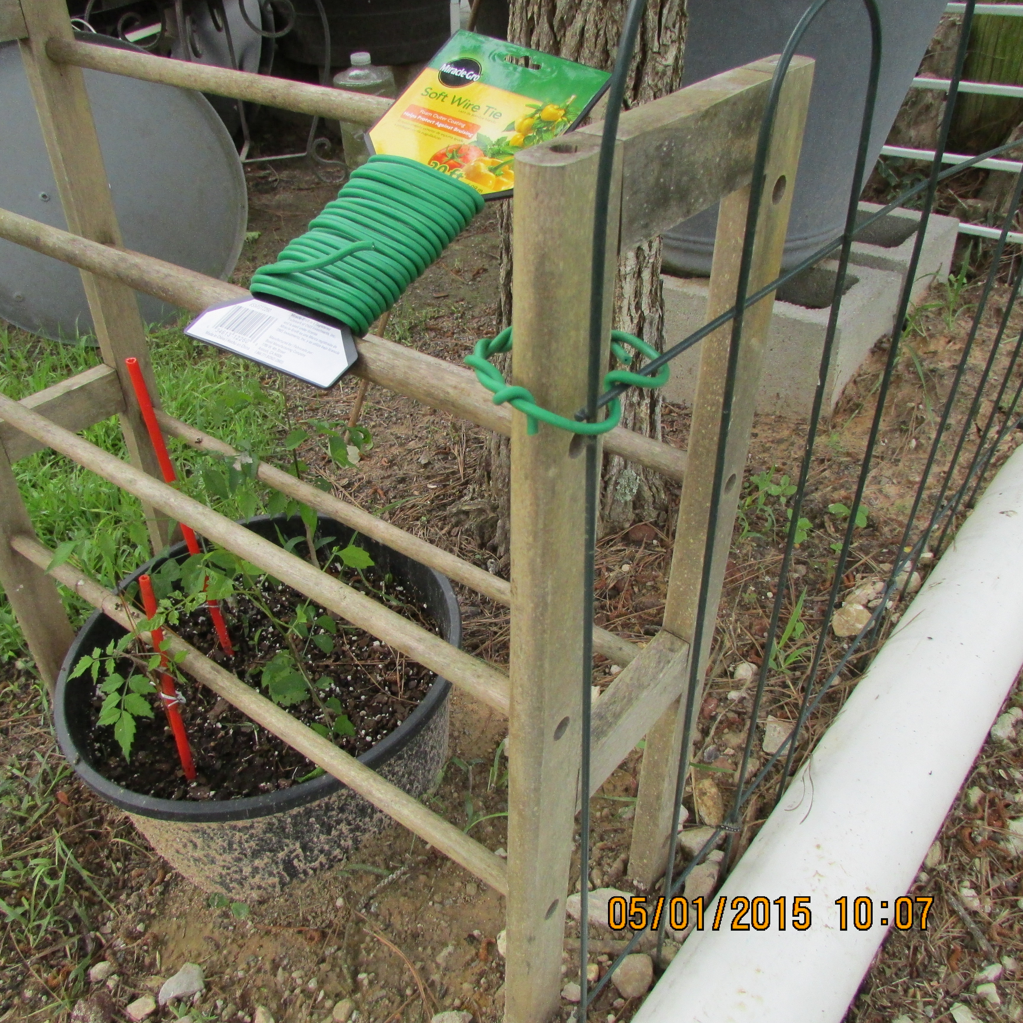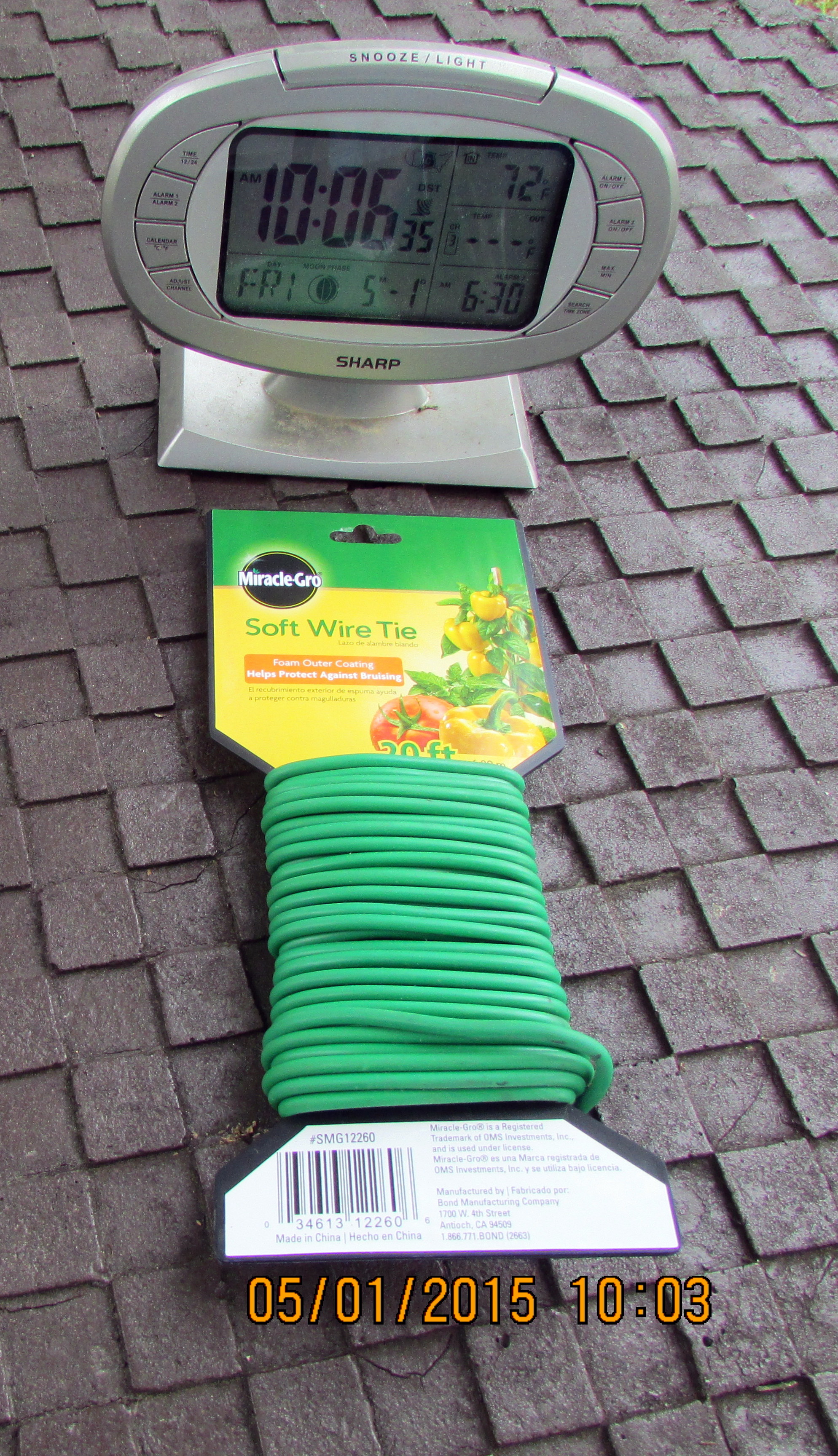 Break time (eleven o’clock); 73 degrees outdoors and 73 degrees outdoors. ~~ My only expense: Miracle Gro soft ties for $2.99. ~~ Hey, it isn’t “perfect” but I’m probably the only one that will notice?! Furthermore, the fence is old, and bent, with rusty spots. ~~ More later.