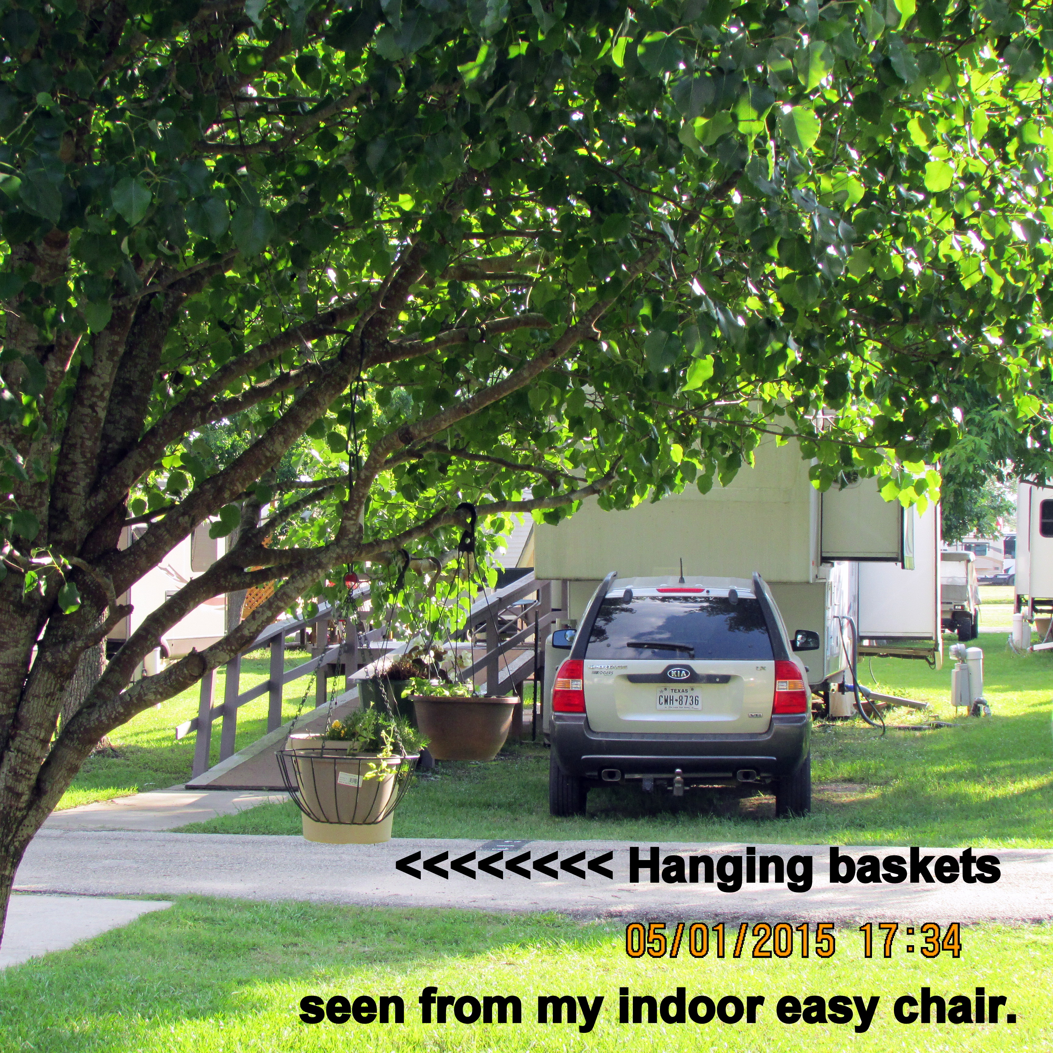 5:30 PM: After a nice nap in my lawn rocking chair–on the patio–I filled bird feeders, rearranged hanging baskets of flowers, and trimmed limbs on a nearby tree. Now I am so-o-o-o tired I haven’t the energy to fix supper. I didn’t sign up for meals in the dining room. I expect to sleep very well tonight!!!!