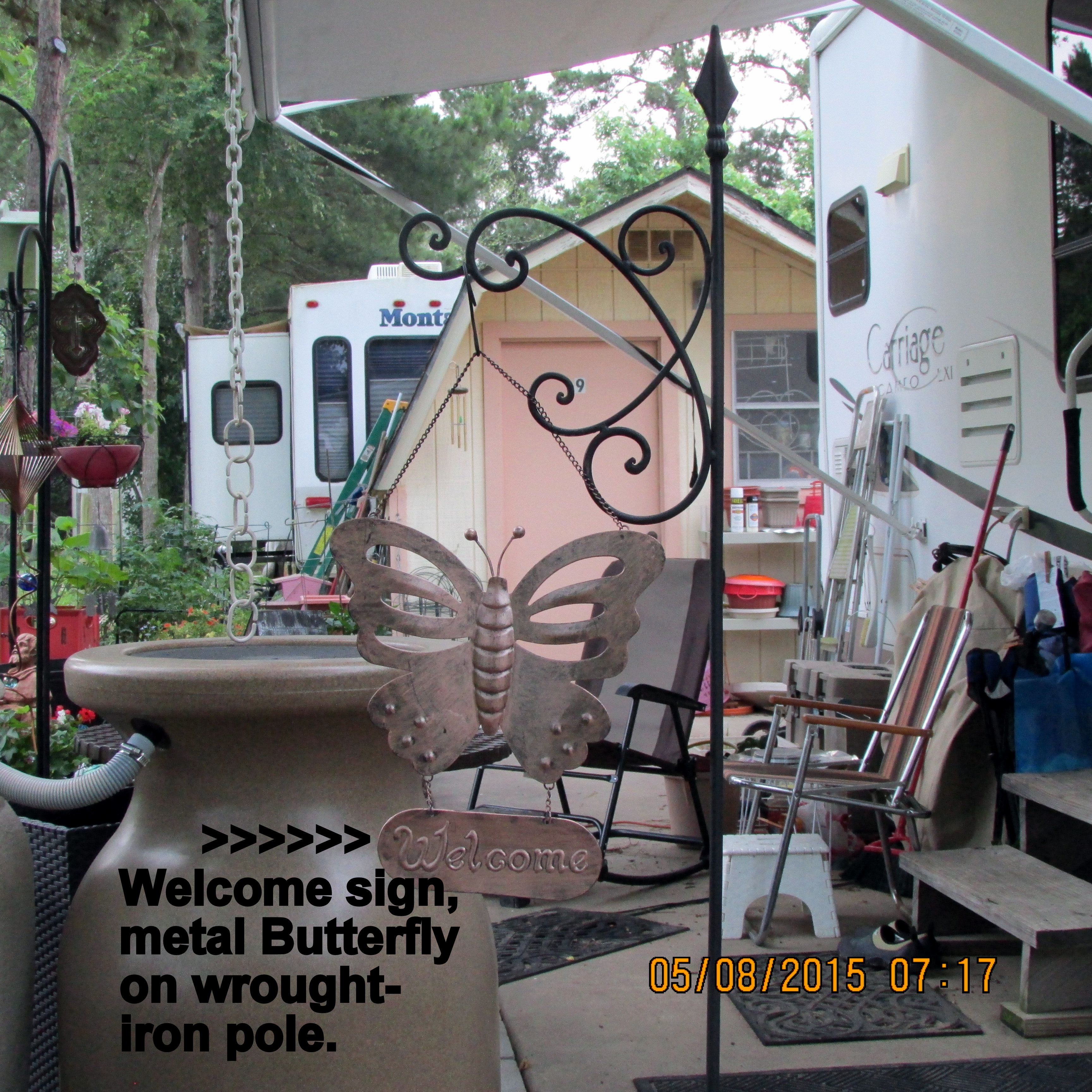 Postscript, Friday, May 8, 2015, 7:30 AM: OK, OK, three pictures of repaired yard decorations. ~~ Finally, the wrought-metal poles and Shepherd’s Hooks have a location. Gratefully, the area to the left of the storage building has very few “to do” items. ~~ “Yes, I admit my yard is cluttered!!“