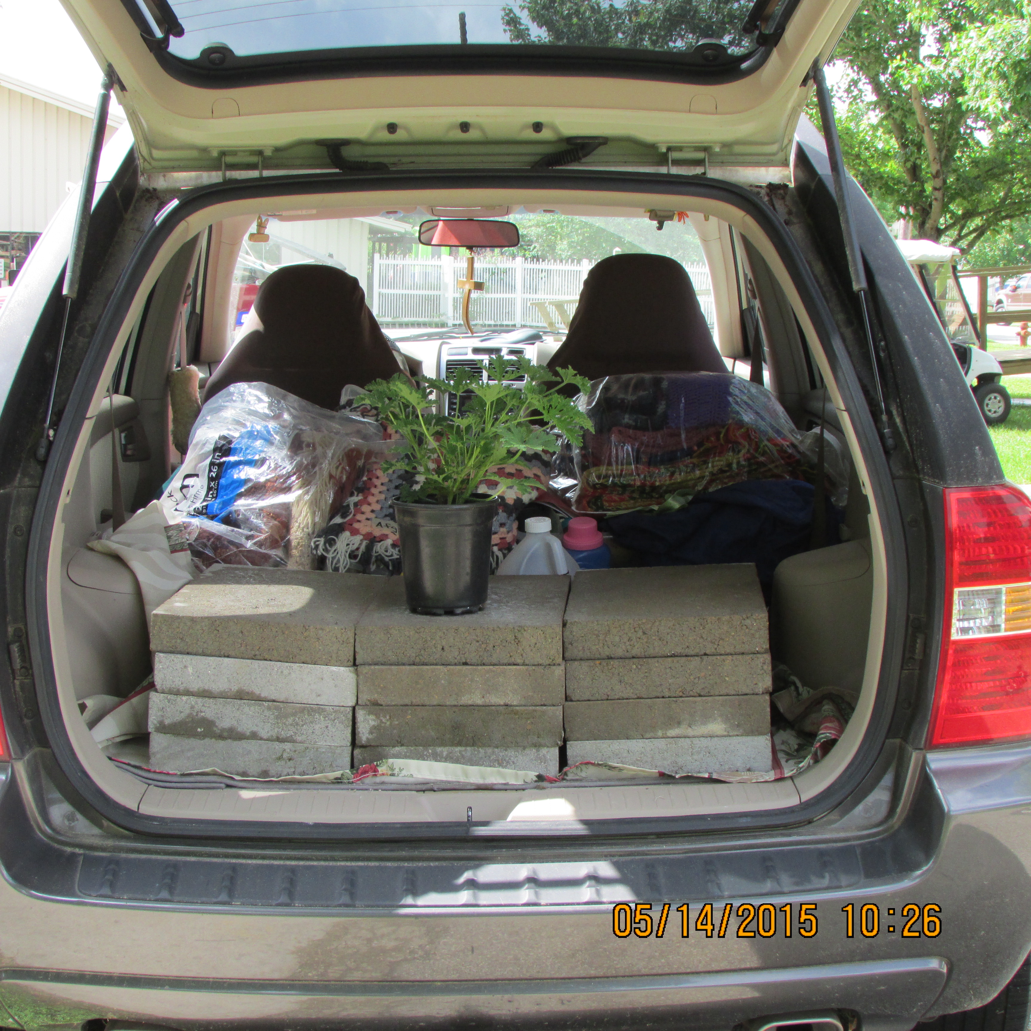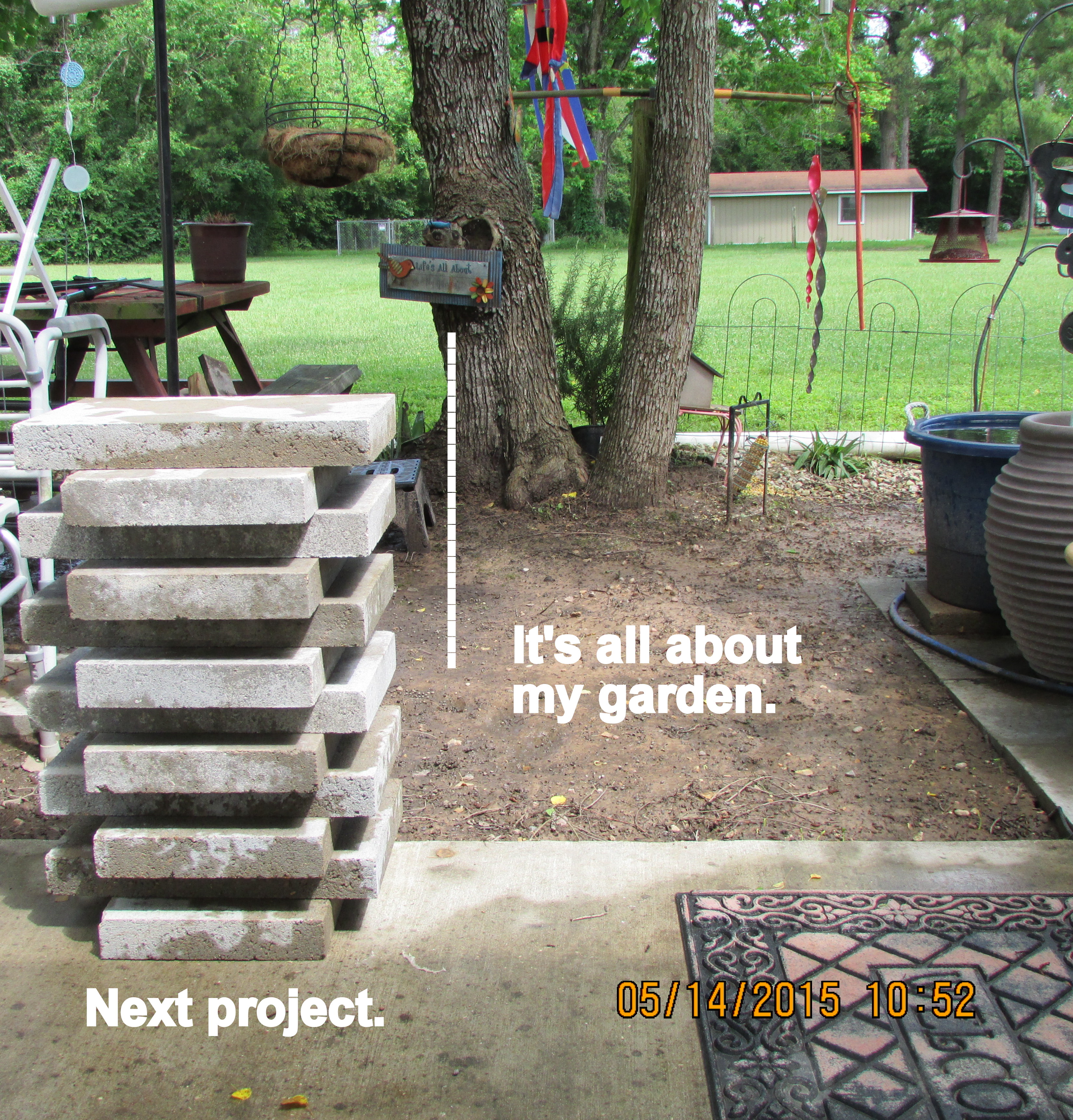 Twelve more blocks: Four hundred forty-four pounds (thirty-seven pounds each). In that blank area, I have a choice: Weeds, mud, or cement paving blocks. I prefer the latter.