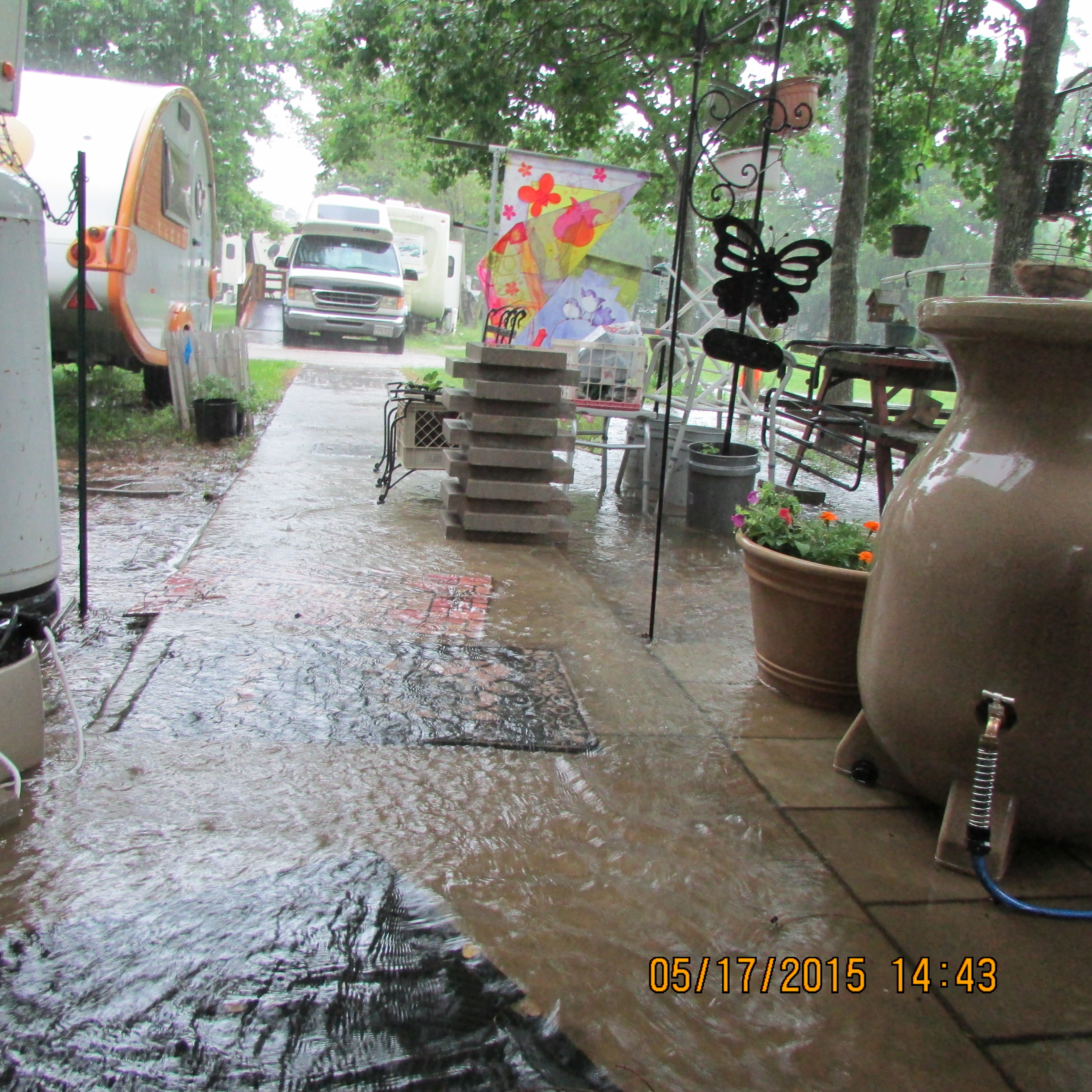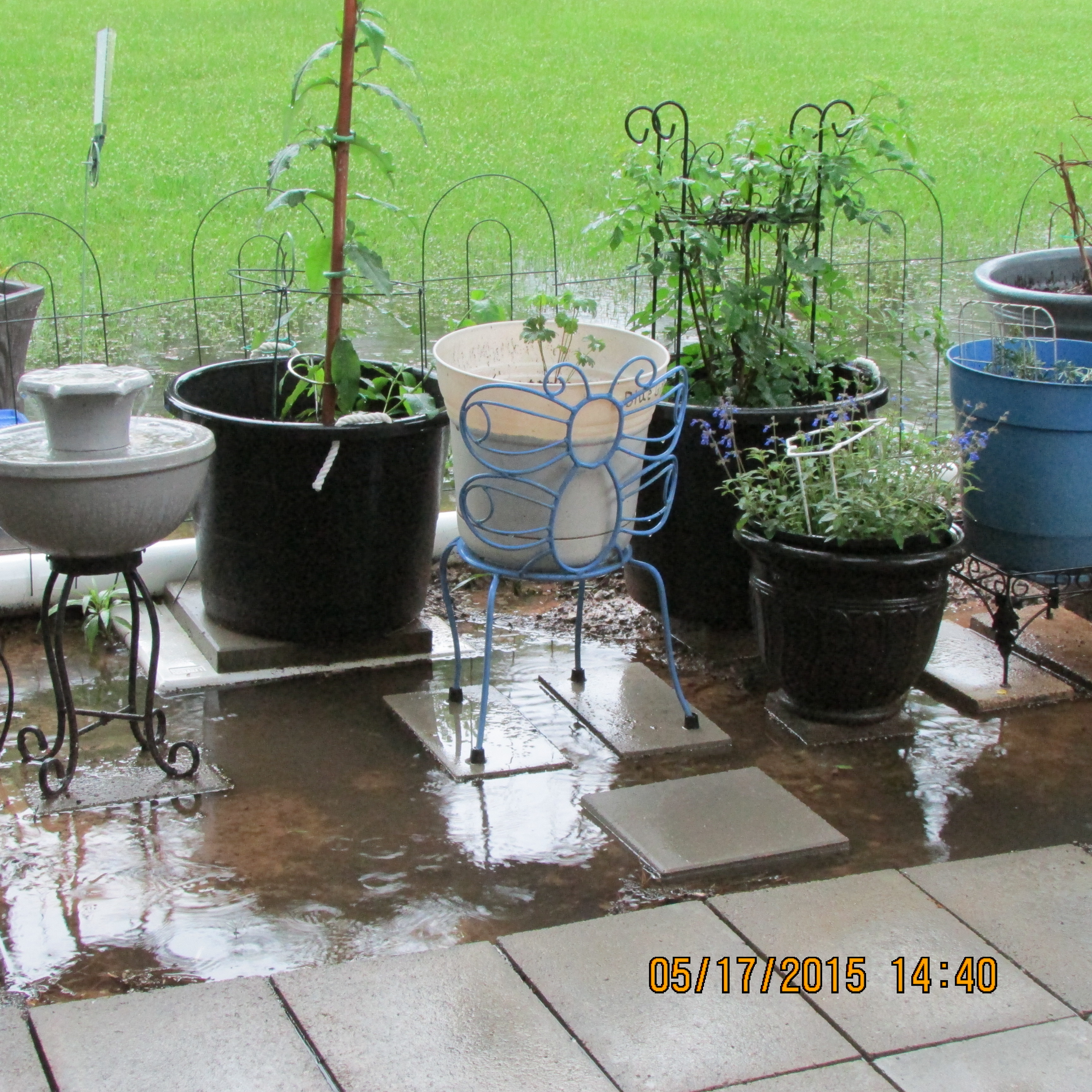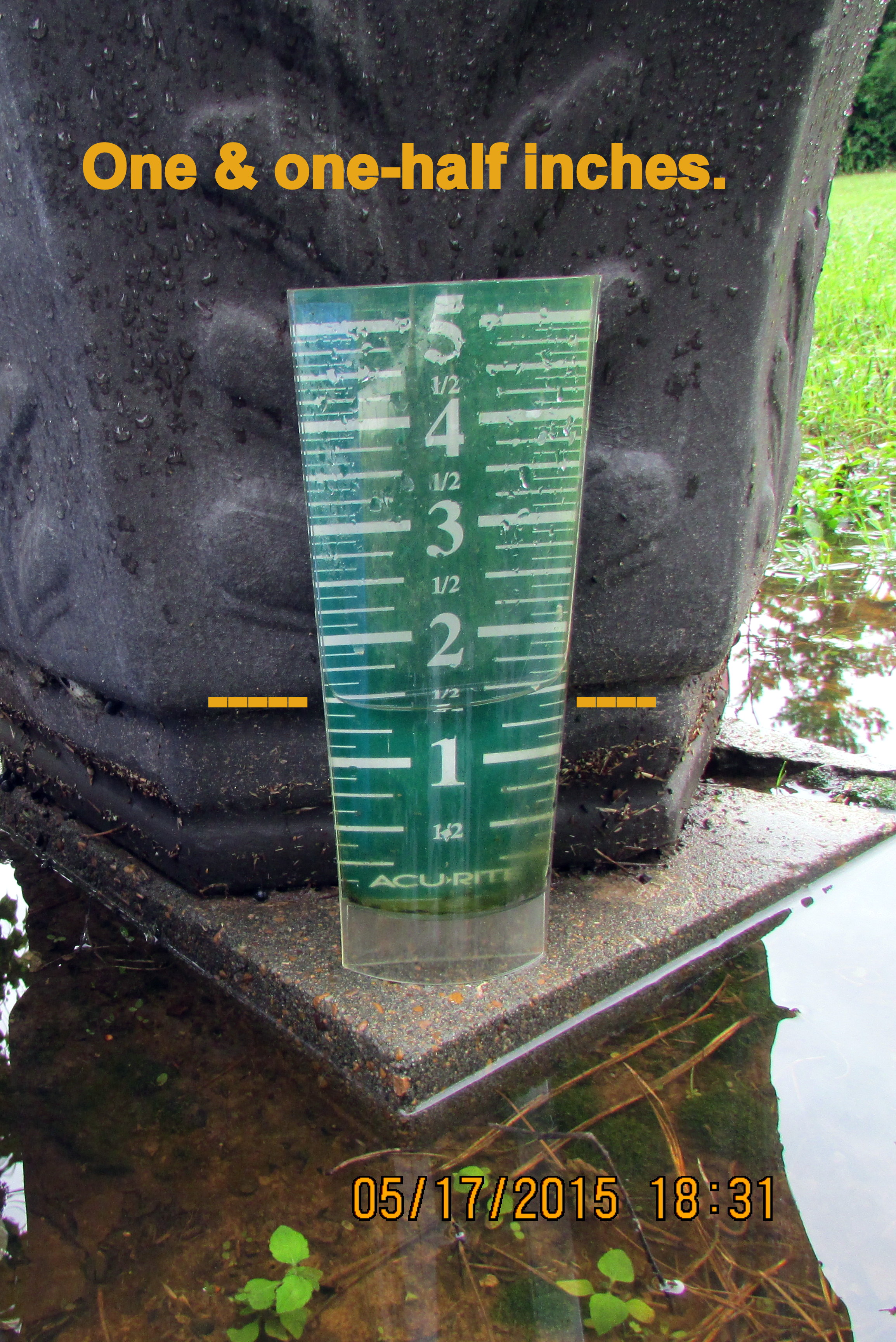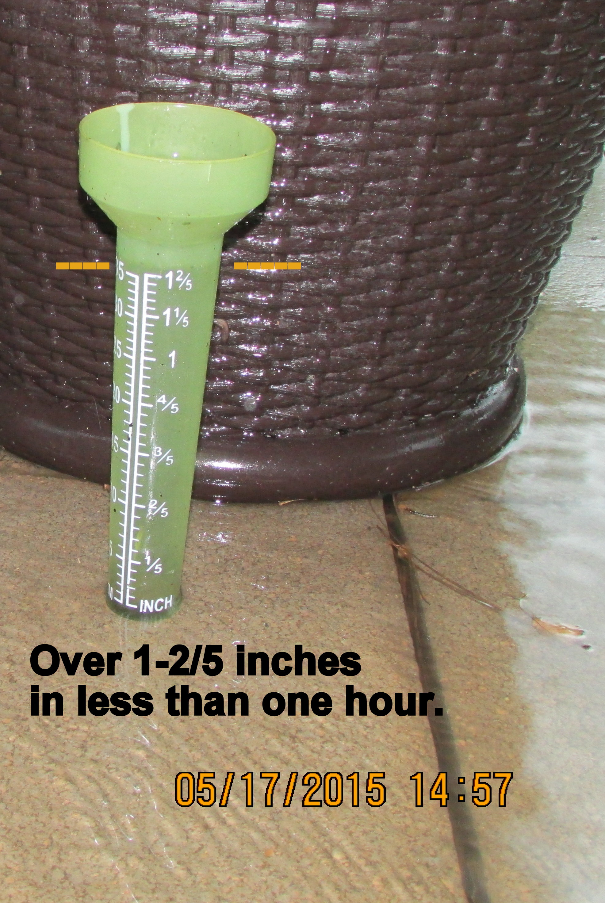 Good news: The storm has passed over and no damage at CARE (that I am aware of). Claps of thunder sounded extremely close. Pictures tell the story: Over one-and two-fifths inches of rain in less than one hour. ~~ Bad news: I’m praying the Hummingbirds never go near the trailer home of a dear, sweet, thoughtful, kind, loving neighbor-lady!! Isn’t it awful to wish bad things for good people?? She made nectar one cup sugar to one cup of water–in the microwave!! No, no, no!! Horrors!! The recipe is one cup of sugar and four cups of water–and bring to a boil on the stove. IMHO, do not “nuke” the water with radiation.