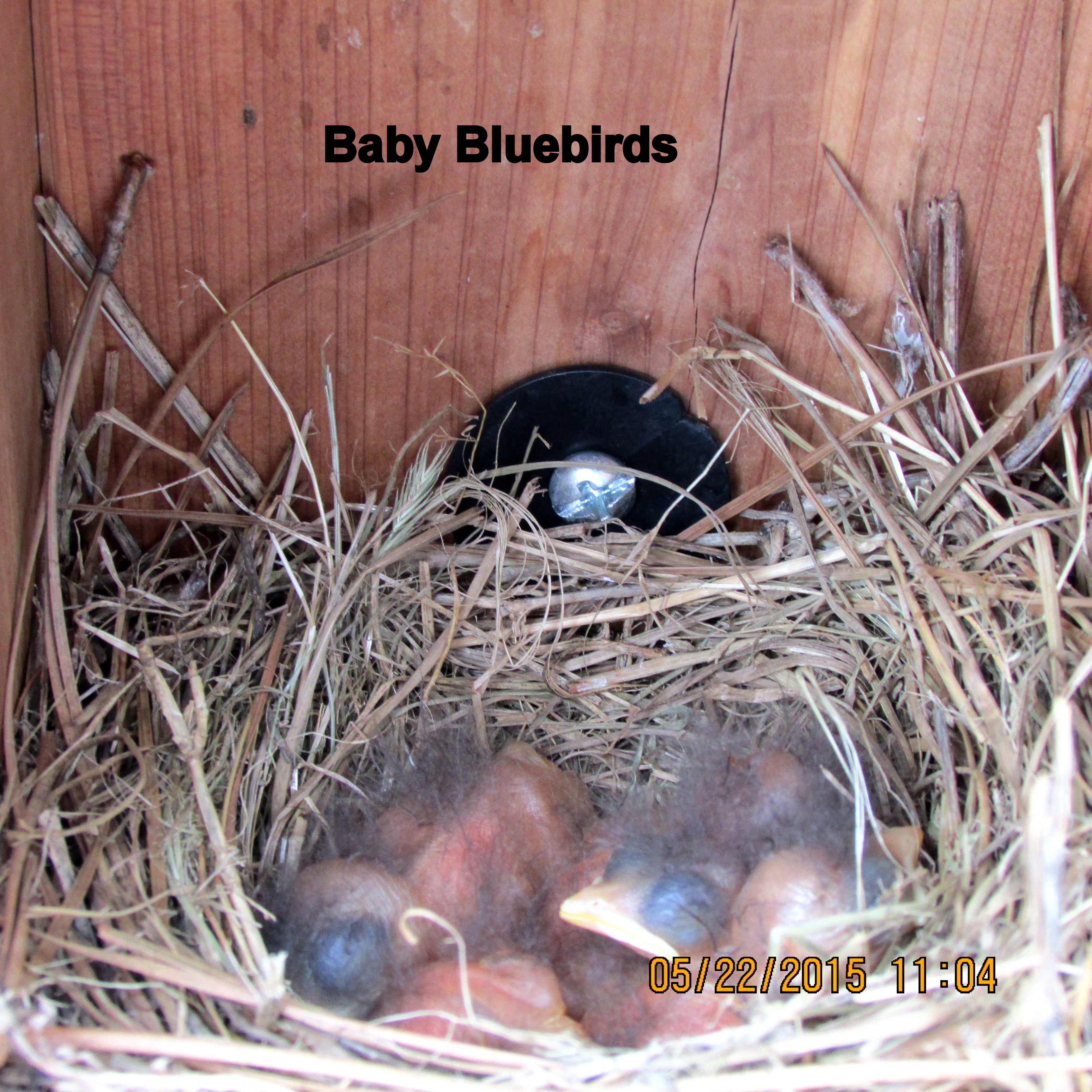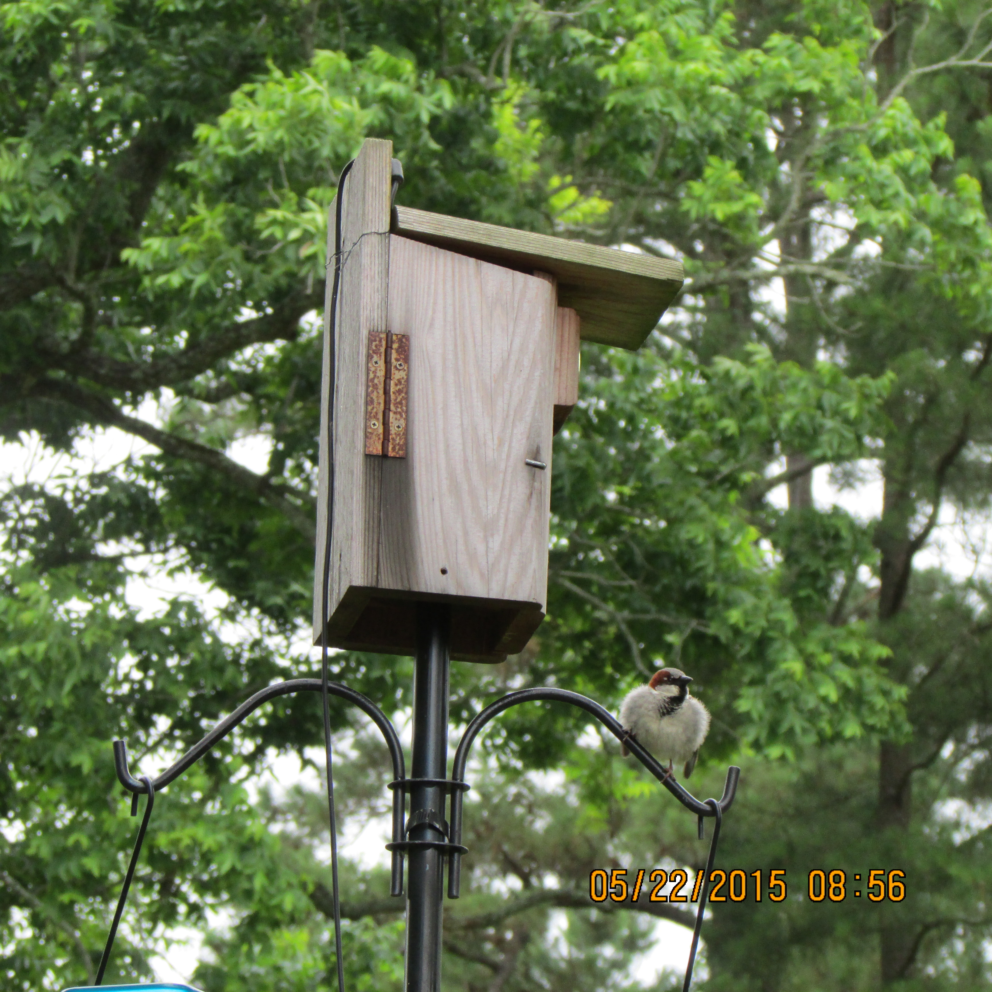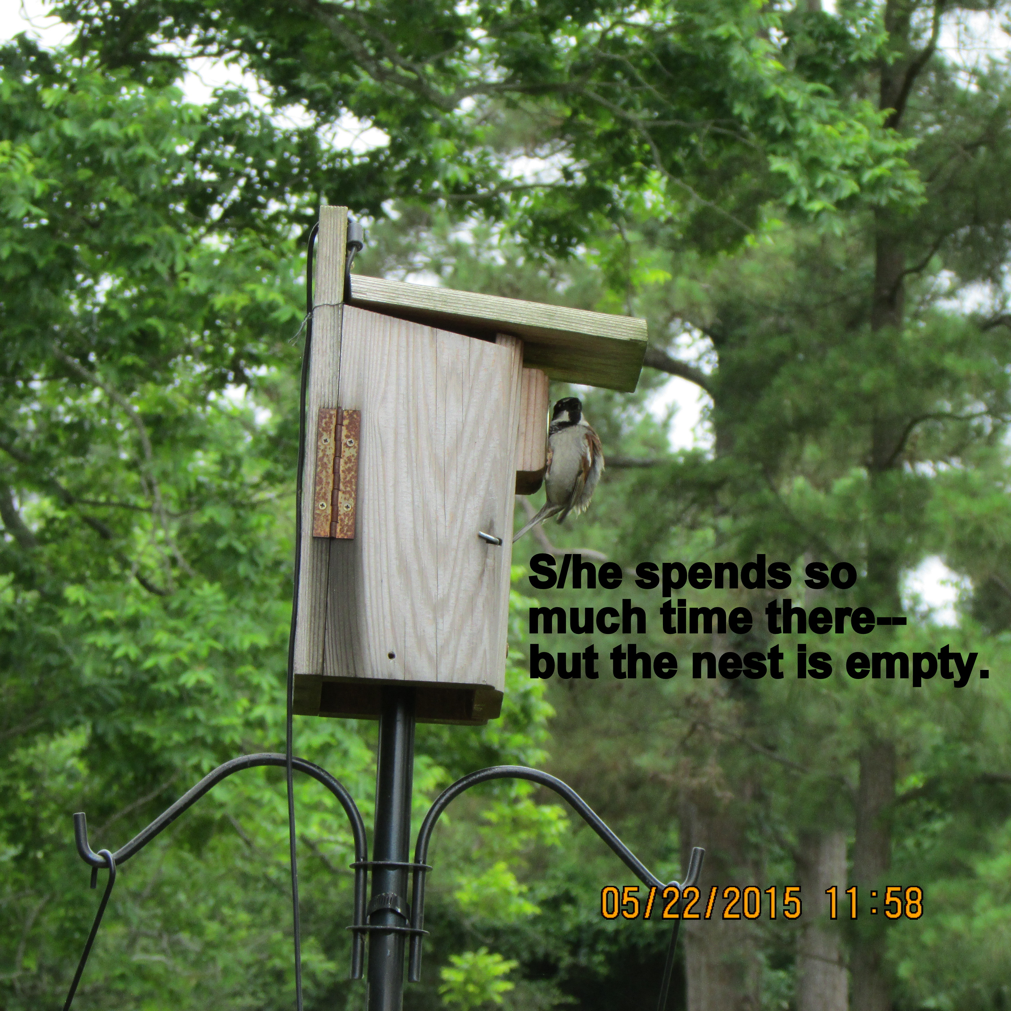 Baby Bluebirds in the nest, in the bird house outside my kitchen window. ~~ That House Sparrow is a mystery to me. He spends **all** his time perched on the bird house or wrought-iron hooks. I imagined there were babies in the nest. I carried, and climbed, a ladder… and maneuvered the camera so I could get a picture. Empty!! Why does he continue to “hang out”??