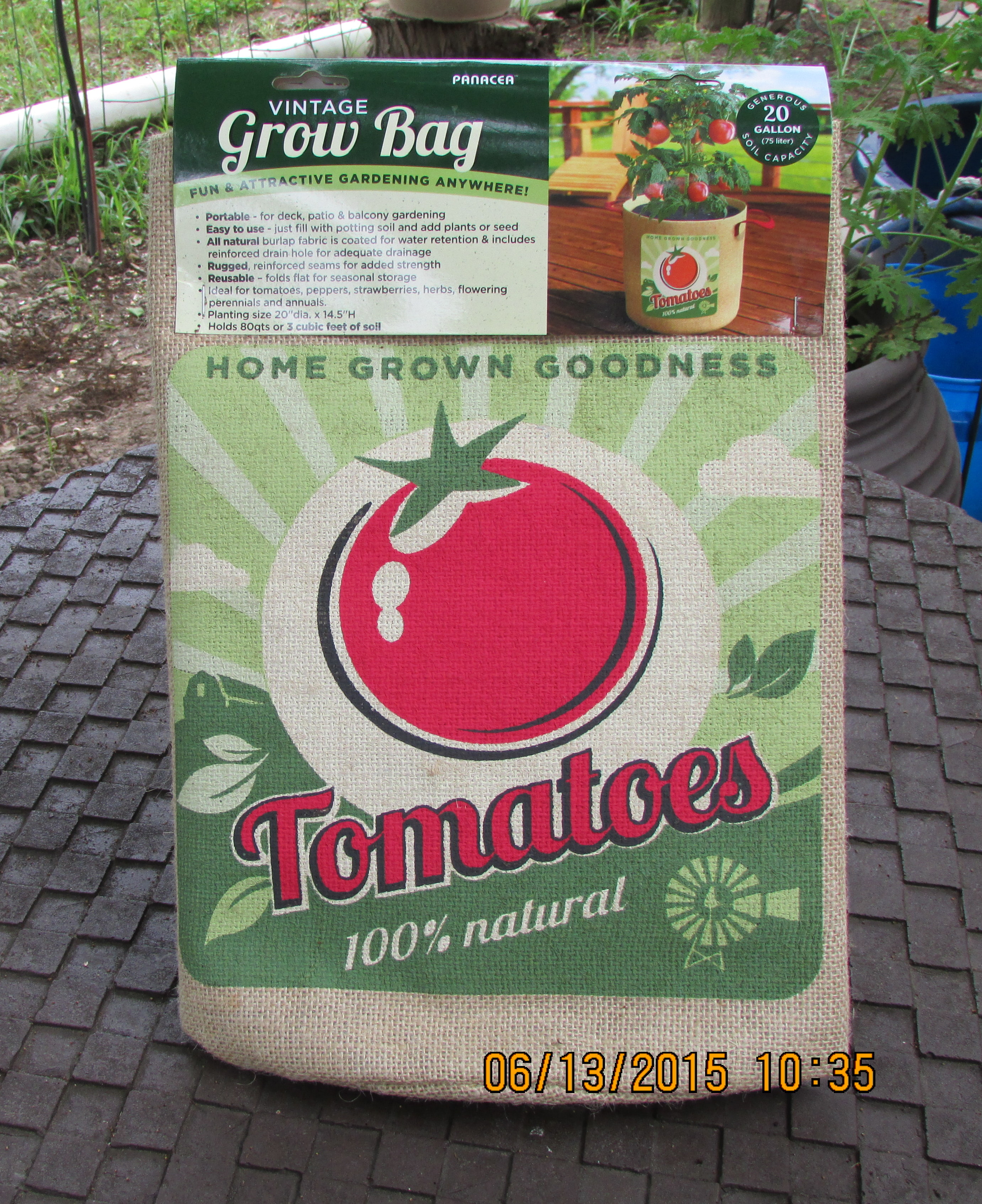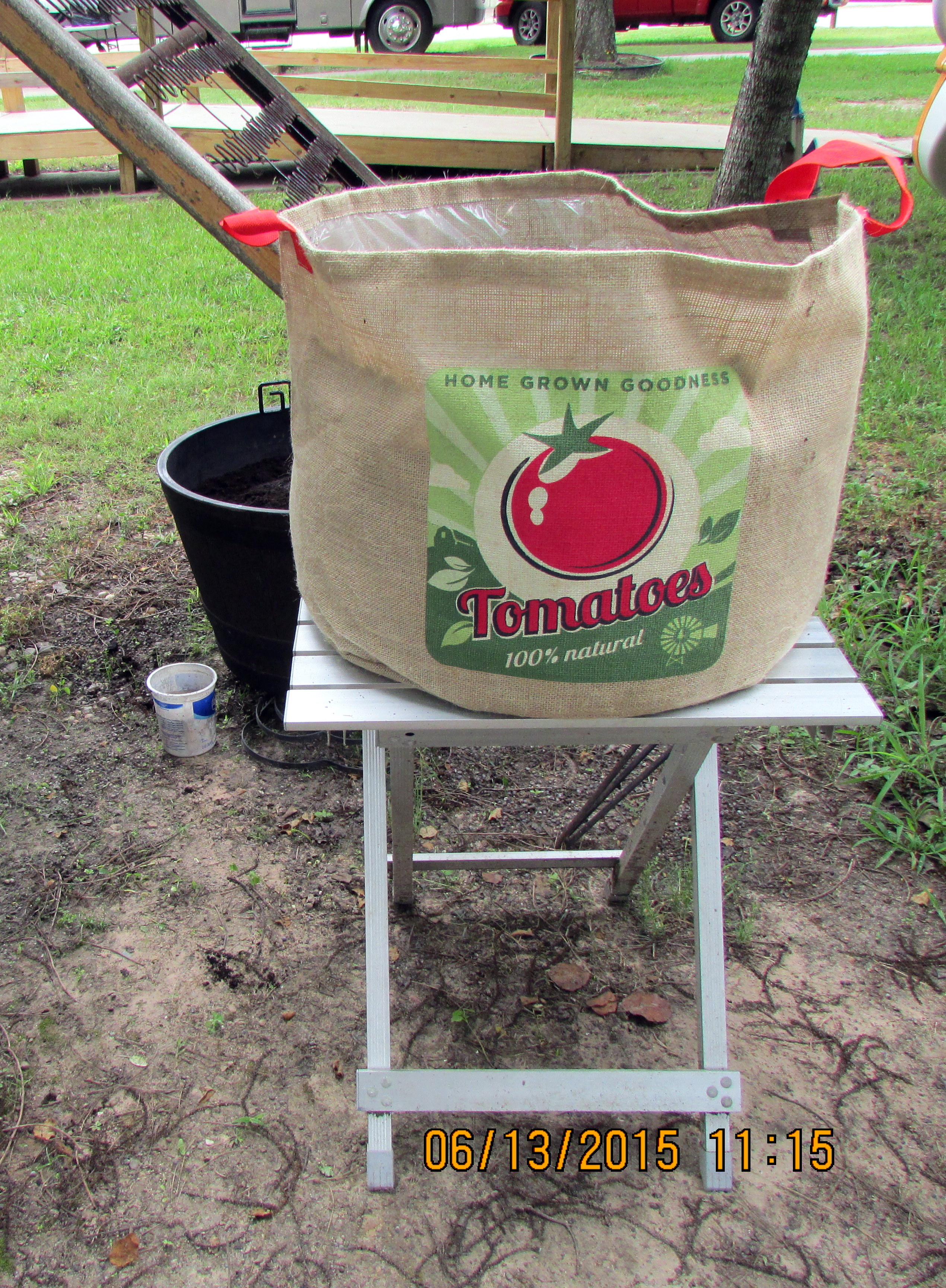 Veggie plants are growing poorly in the smaller containers. Perhaps the “giant climbing tomato” will do better in a larger planter?? We’ll see. The burlap-bag tomato planter was an impulse purchase at Tractor Supply. It’s cute–and large!! Two bags of planter soil “large”!!
