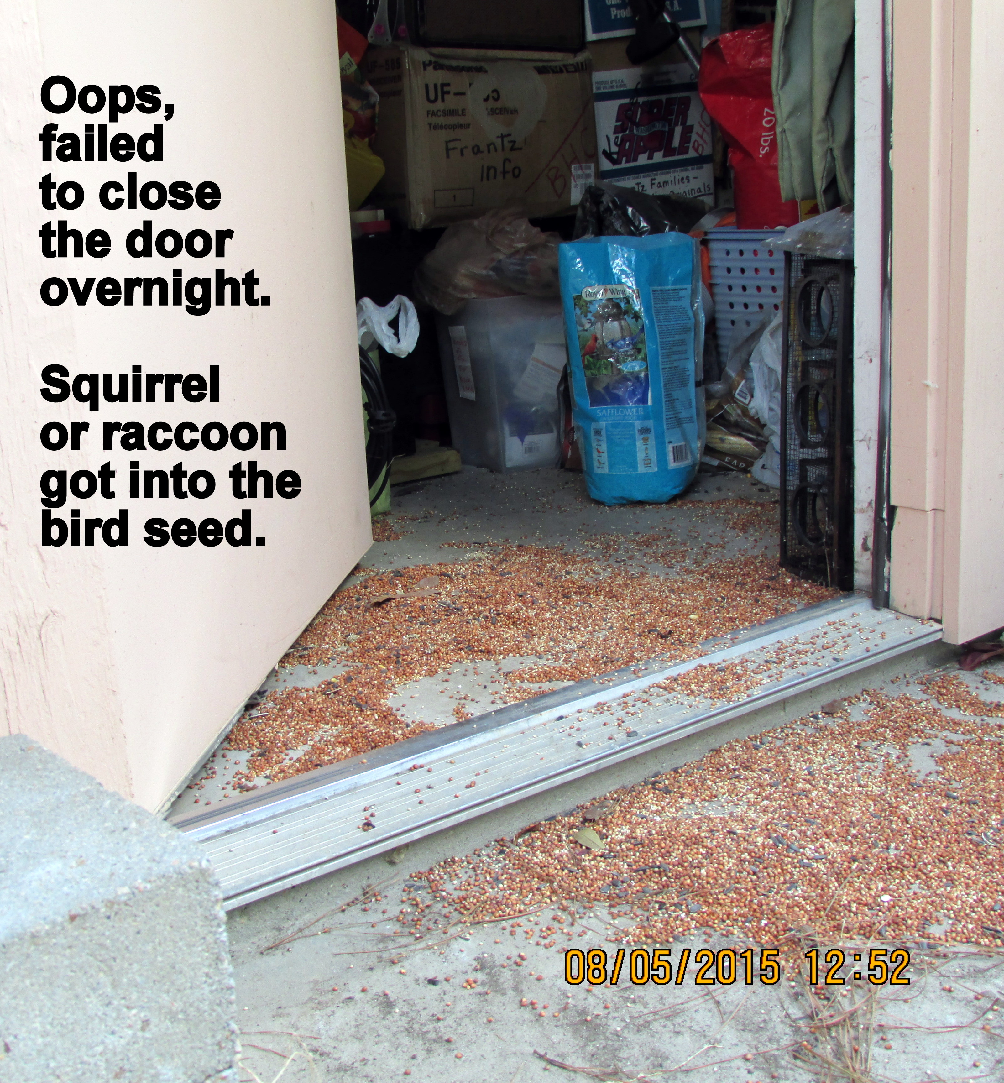 Because the “landlady” failed to close the door to the storage building (last night), some little critter(s) got into the bags of bird seed. So-o-o, in 97 degrees temperature, I had to clean up the mess.
