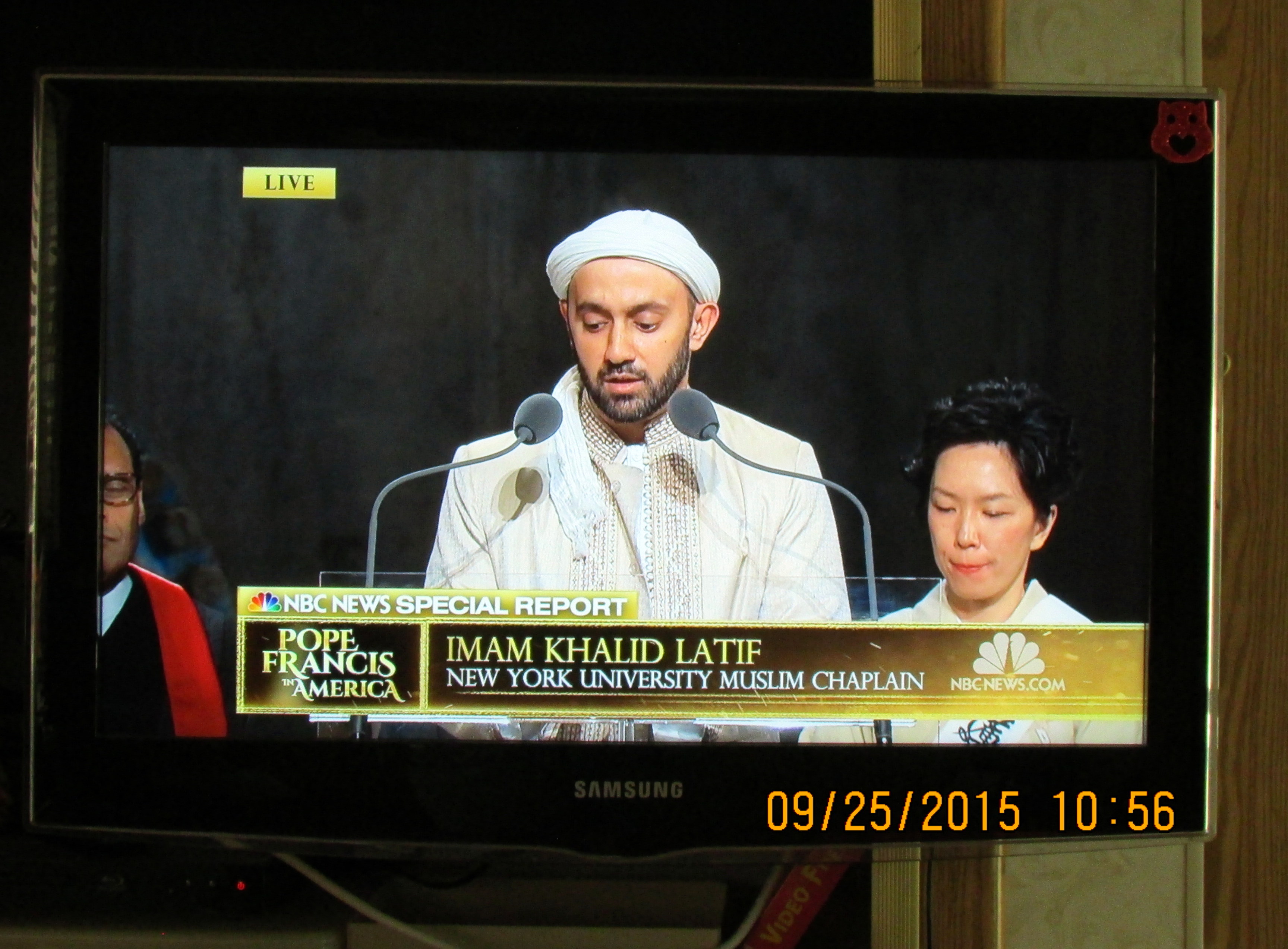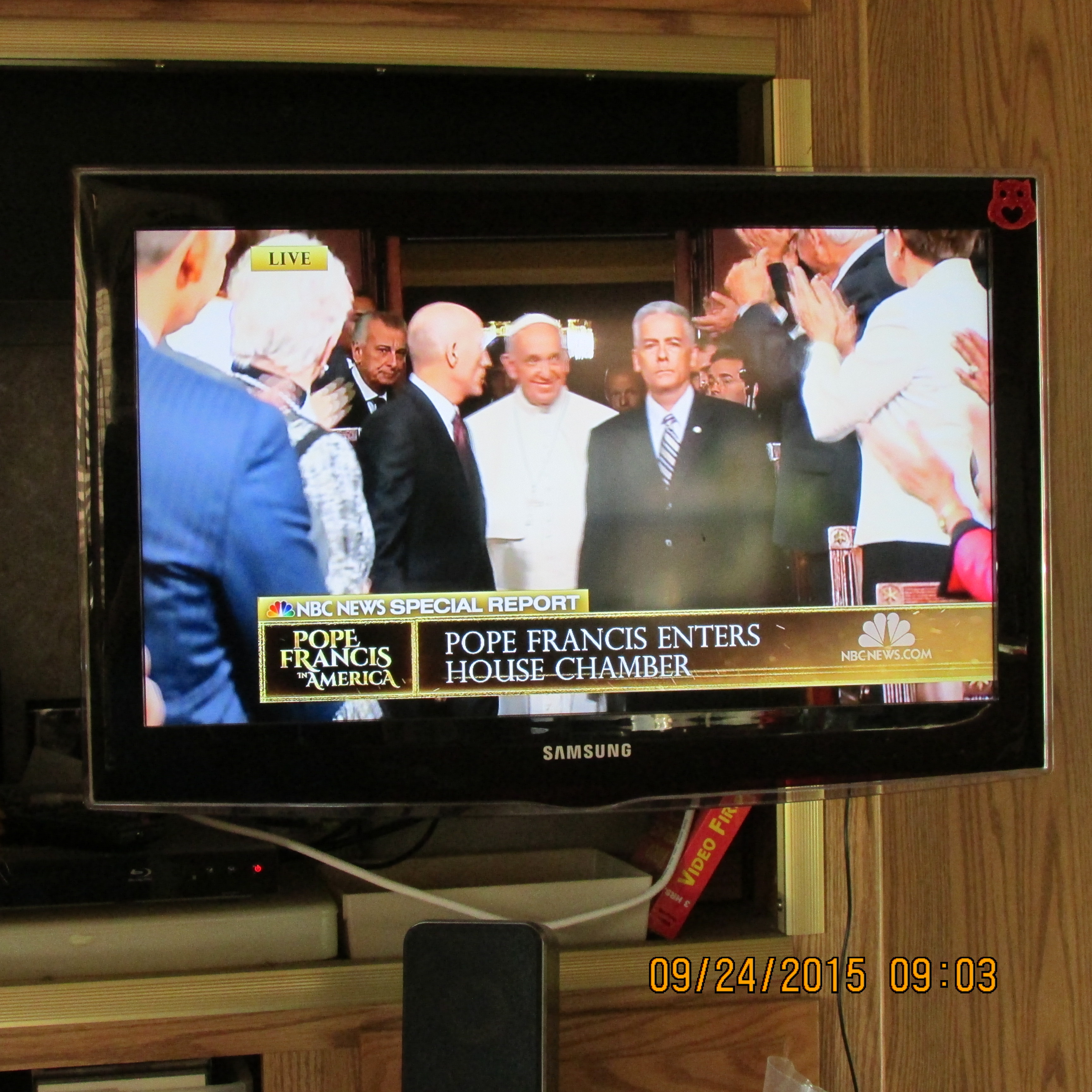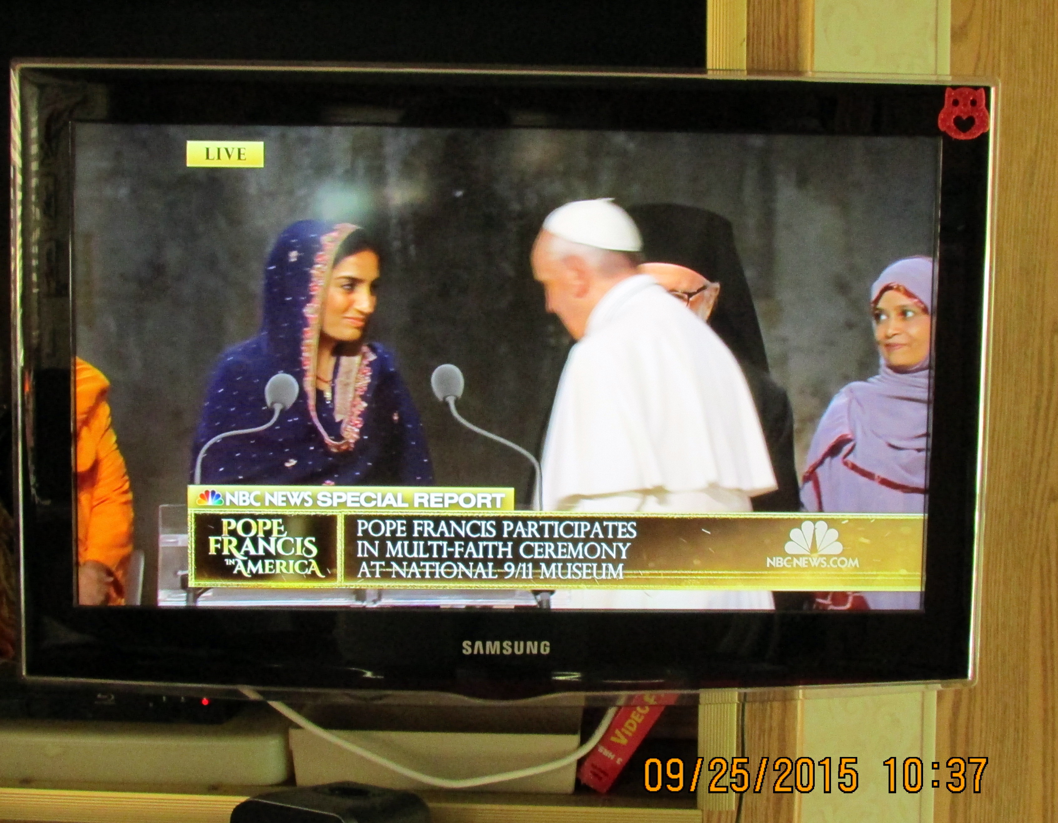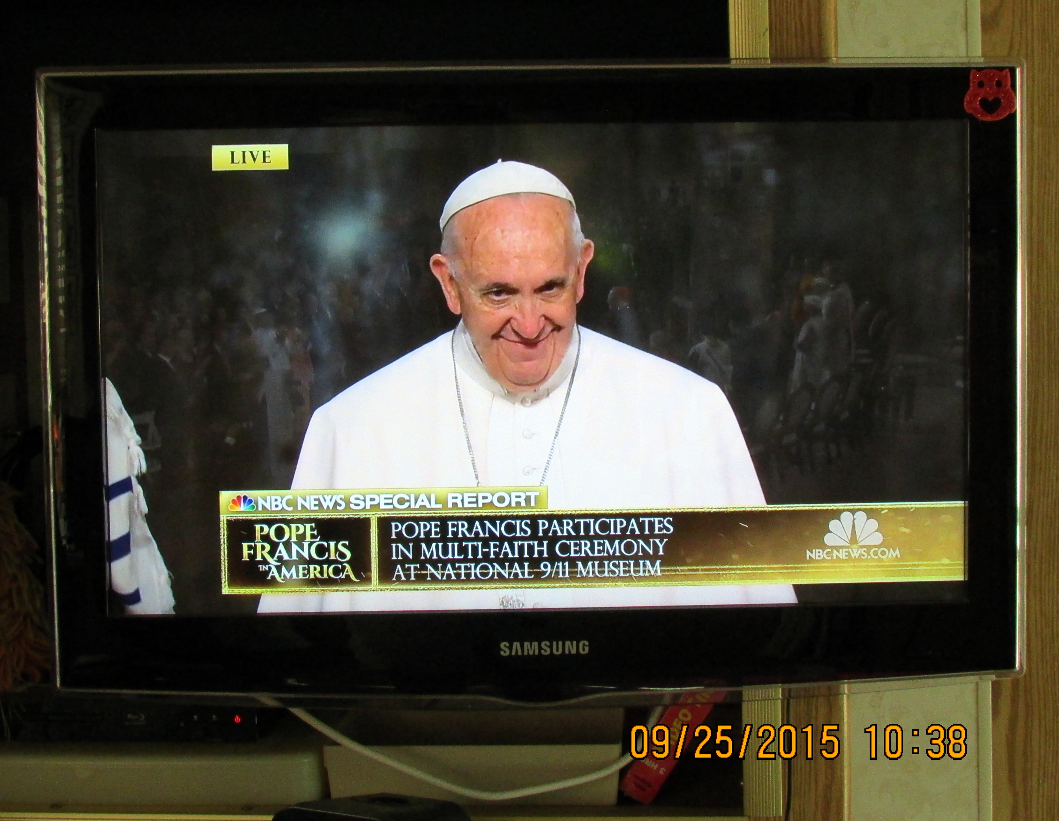 First: The Pope speaking at the United Nations. Second: Pope Francis participates in Interfaith ceremony at the 9-11 Memorial Museum. ~~ Click each picture to enlarge for better viewing. The pictures are irregular sizes because I “cropped” them for emphasis on television screen and not cabinetry around television set. With twenty-twenty hindsight, I should have set the camera up on a tripod.