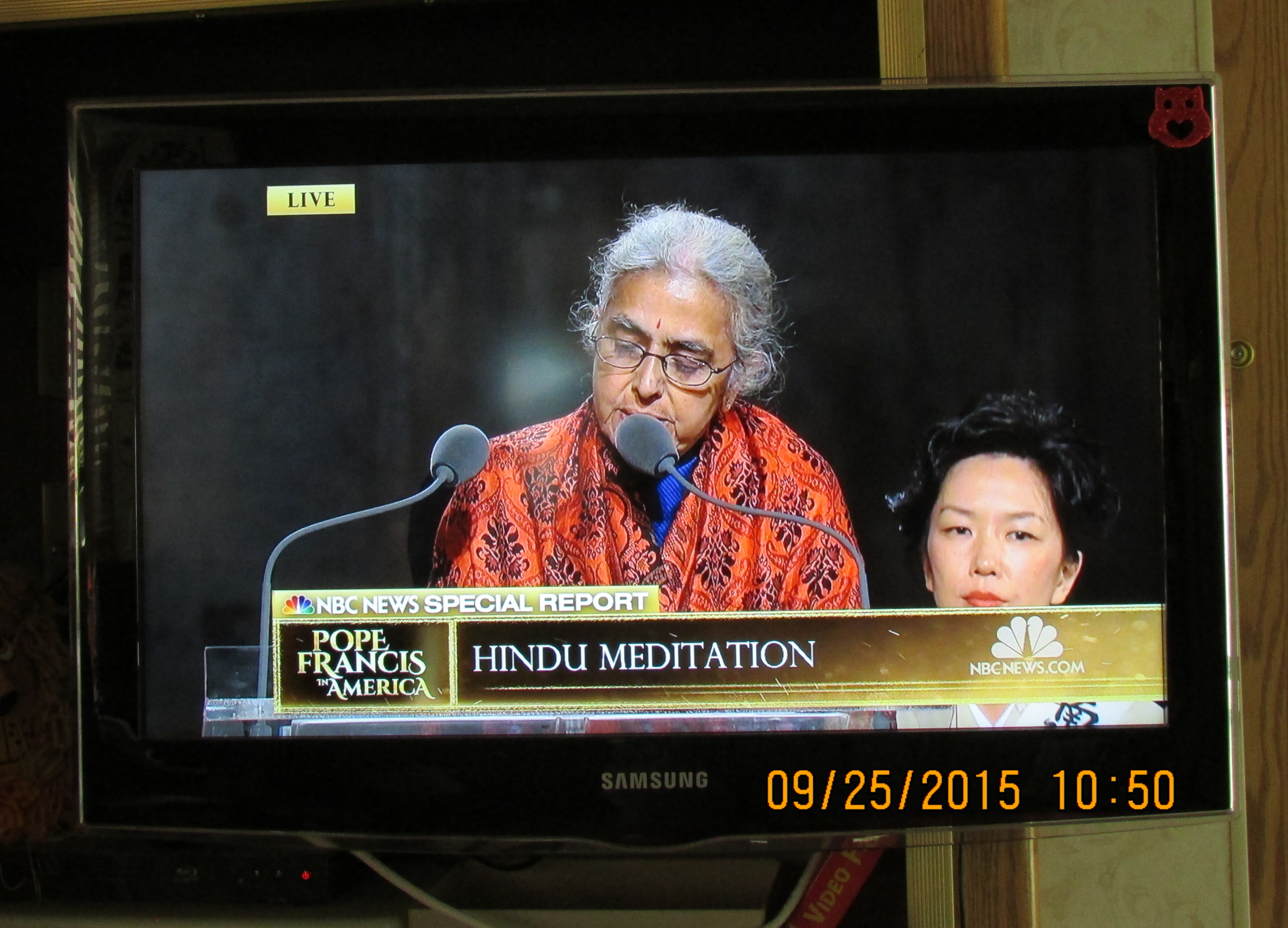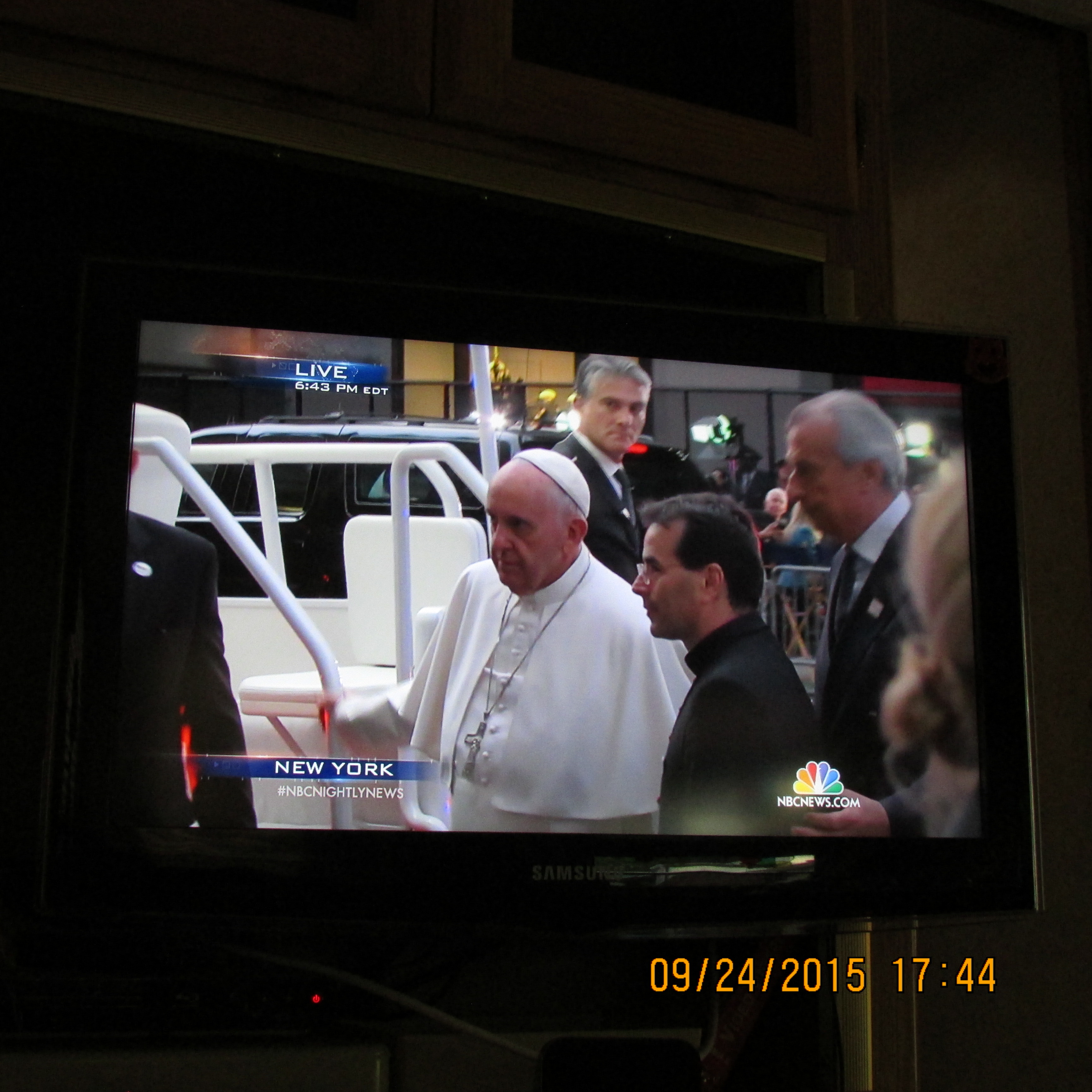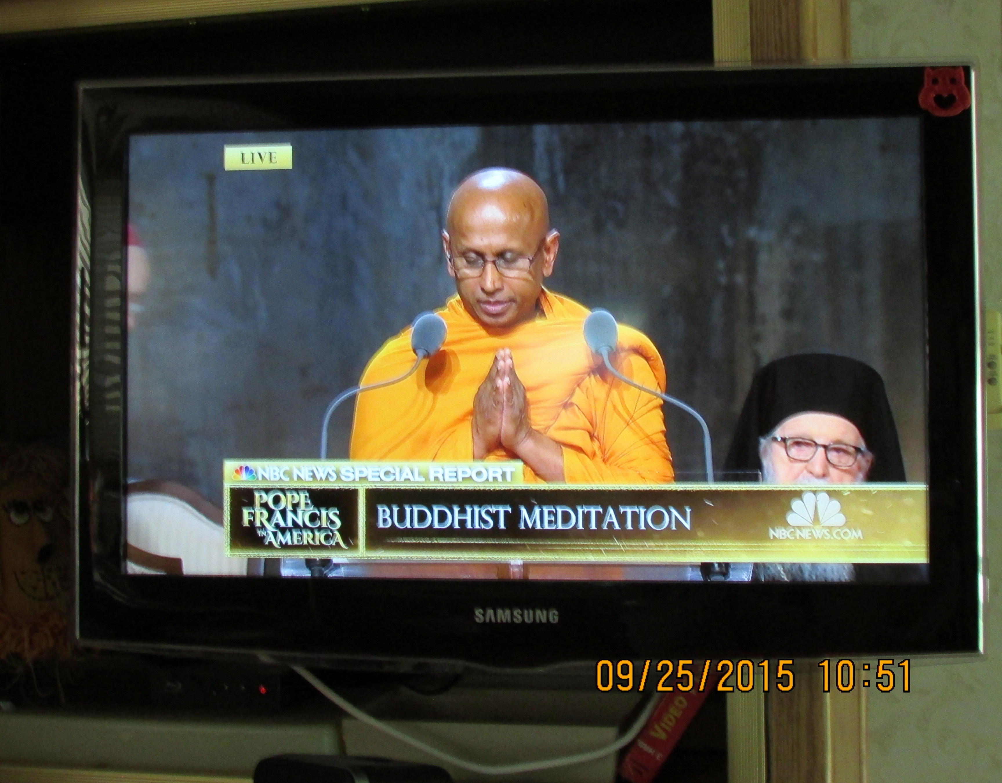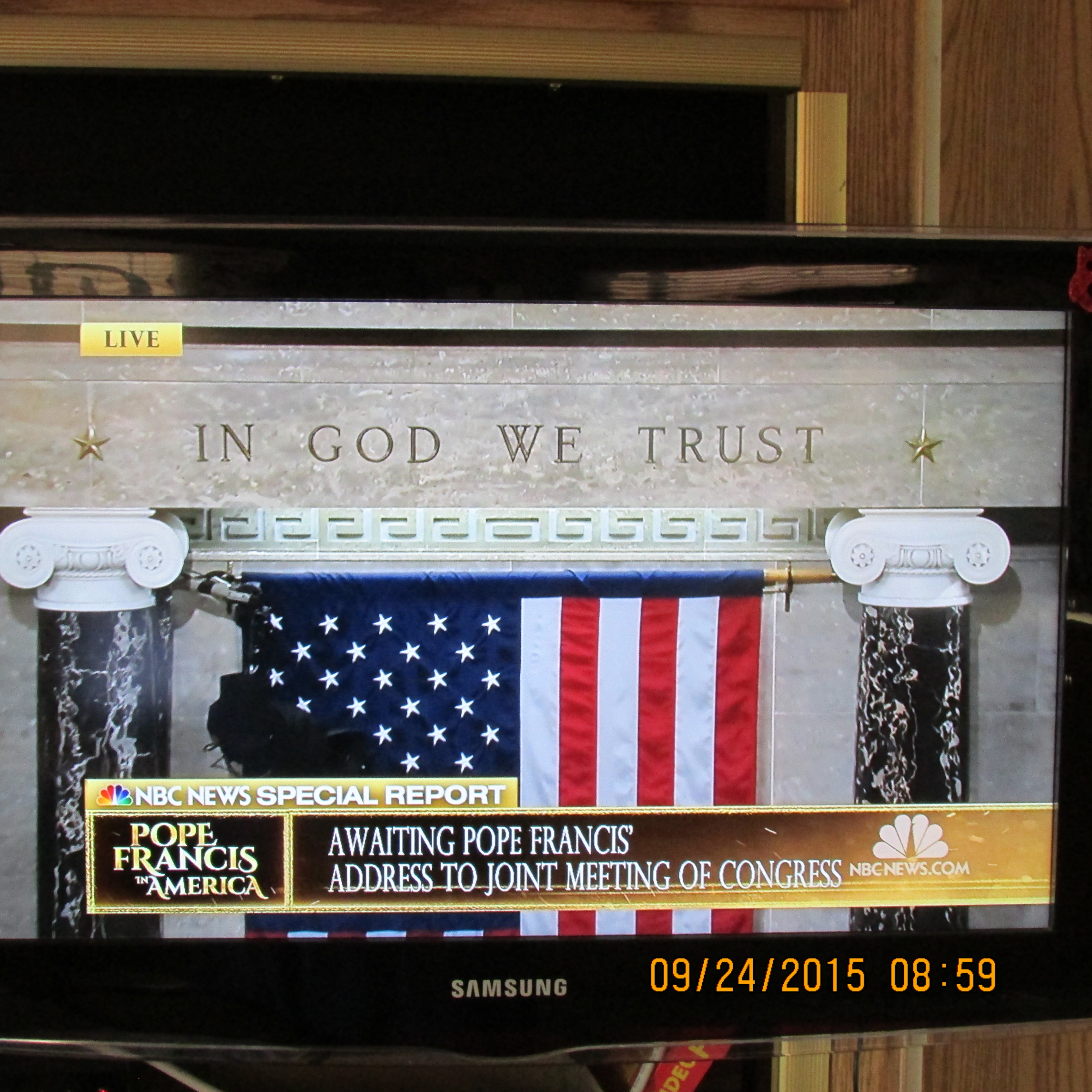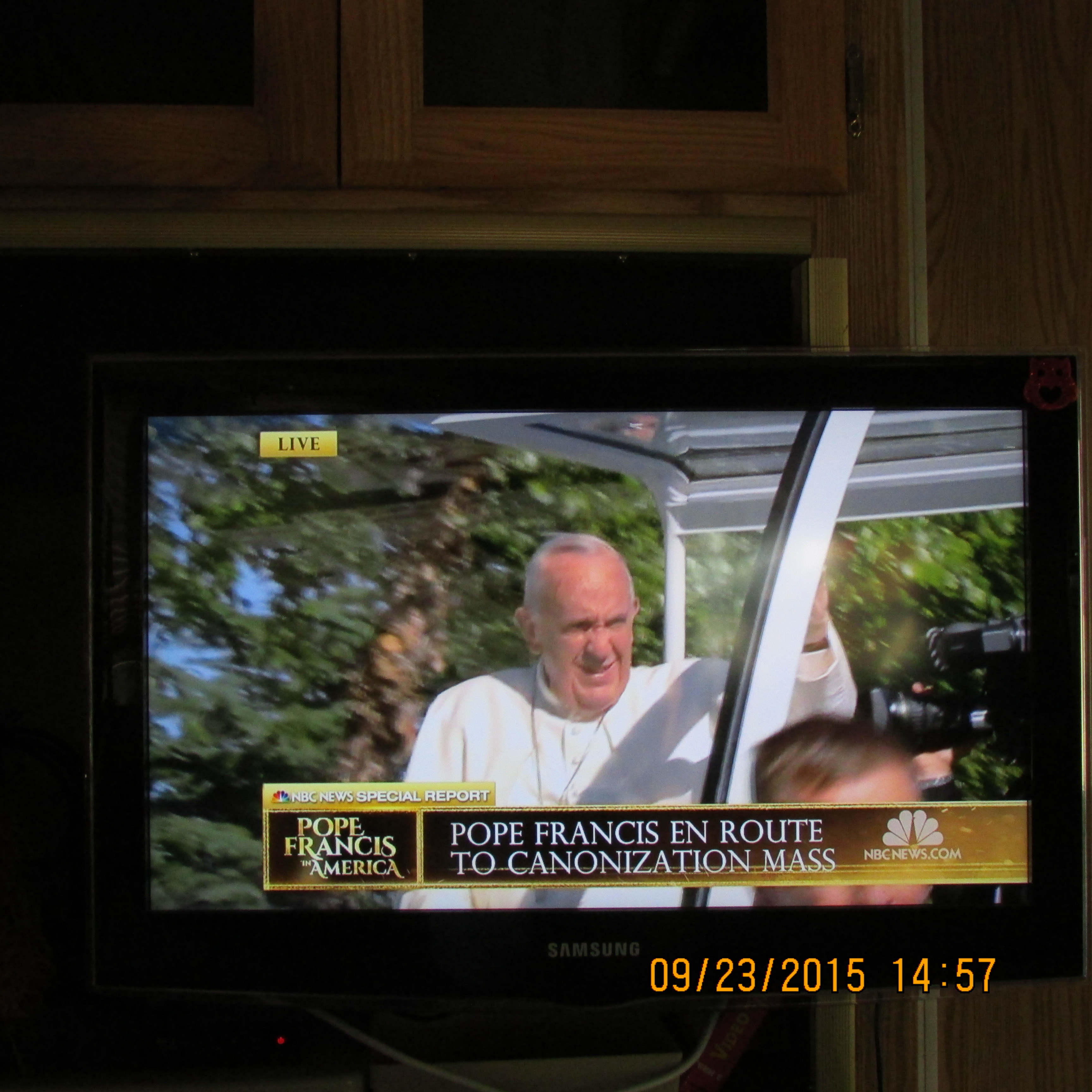 First: The Pope speaking at the United Nations. Second: Pope Francis participates in Interfaith ceremony at the 9-11 Memorial Museum. ~~ Click each picture to enlarge for better viewing. The pictures are irregular sizes because I “cropped” them for emphasis on television screen and not cabinetry around television set. With twenty-twenty hindsight, I should have set the camera up on a tripod.