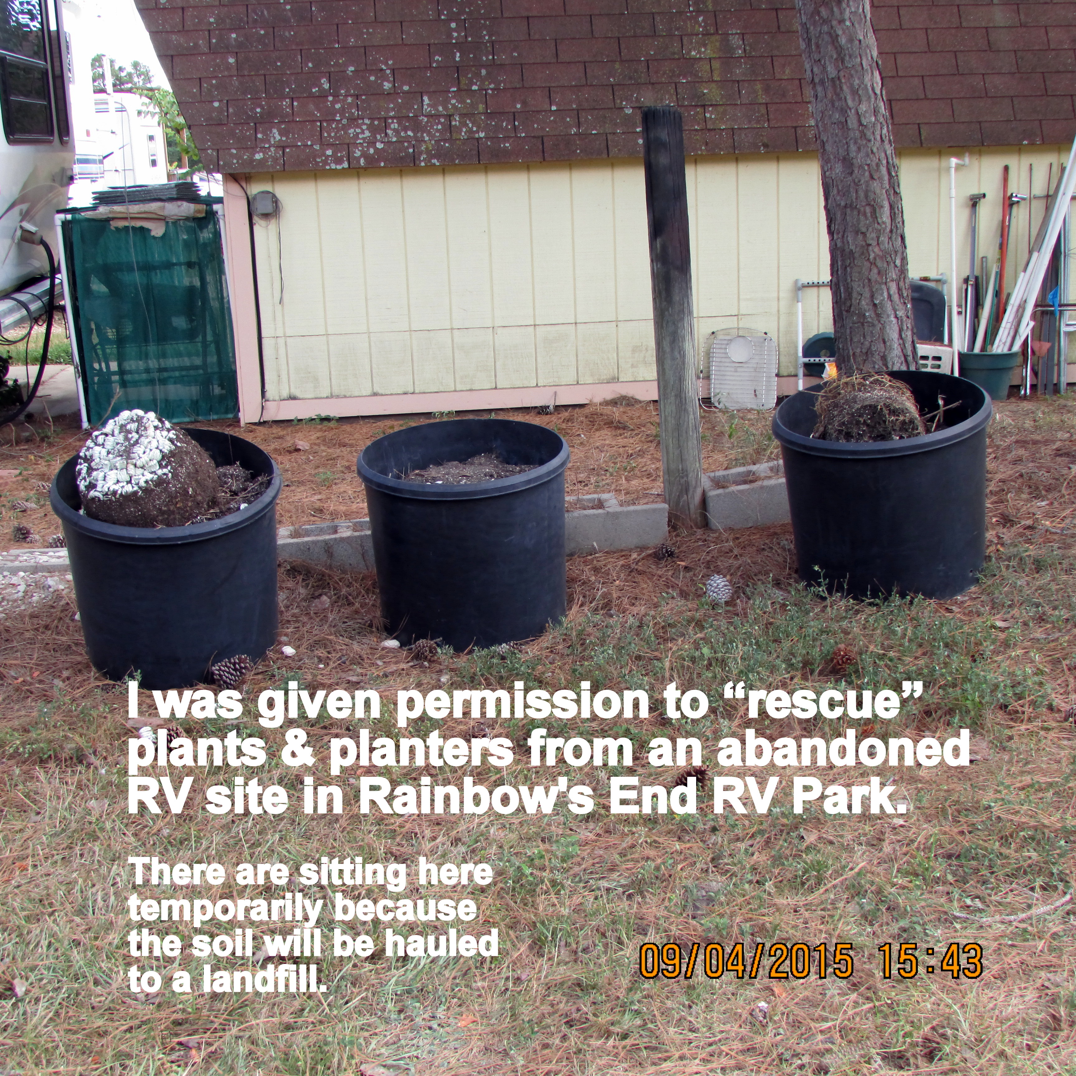The word is out: “Lorraine is the ‘plant nurse’.” Yesterday I learned of plants and planters that were available at a neglected RV site in Rainbow’s End RV Park. The next-door neighbors said the owner would not mind if I took the plants and planters. Frankly, I believe everything in the planters is dead. However, I’m told one planter had a beautiful Lantana. I removed it from the large black planter and hope to “nurse” it in my smaller container. In the picture, only three of five large planters. I suspect the soil is old and “dead”; an acquaintance will haul it to a land fill.