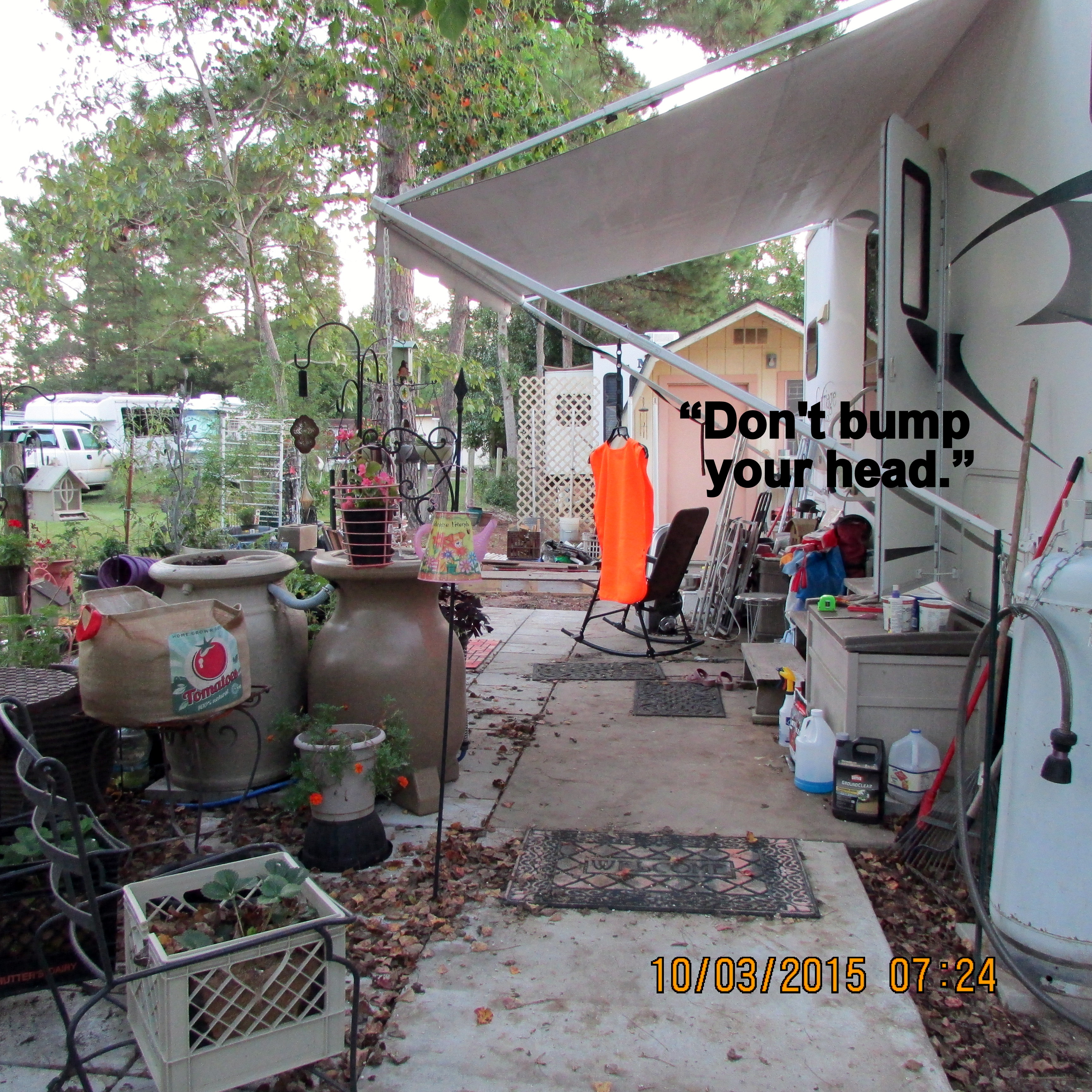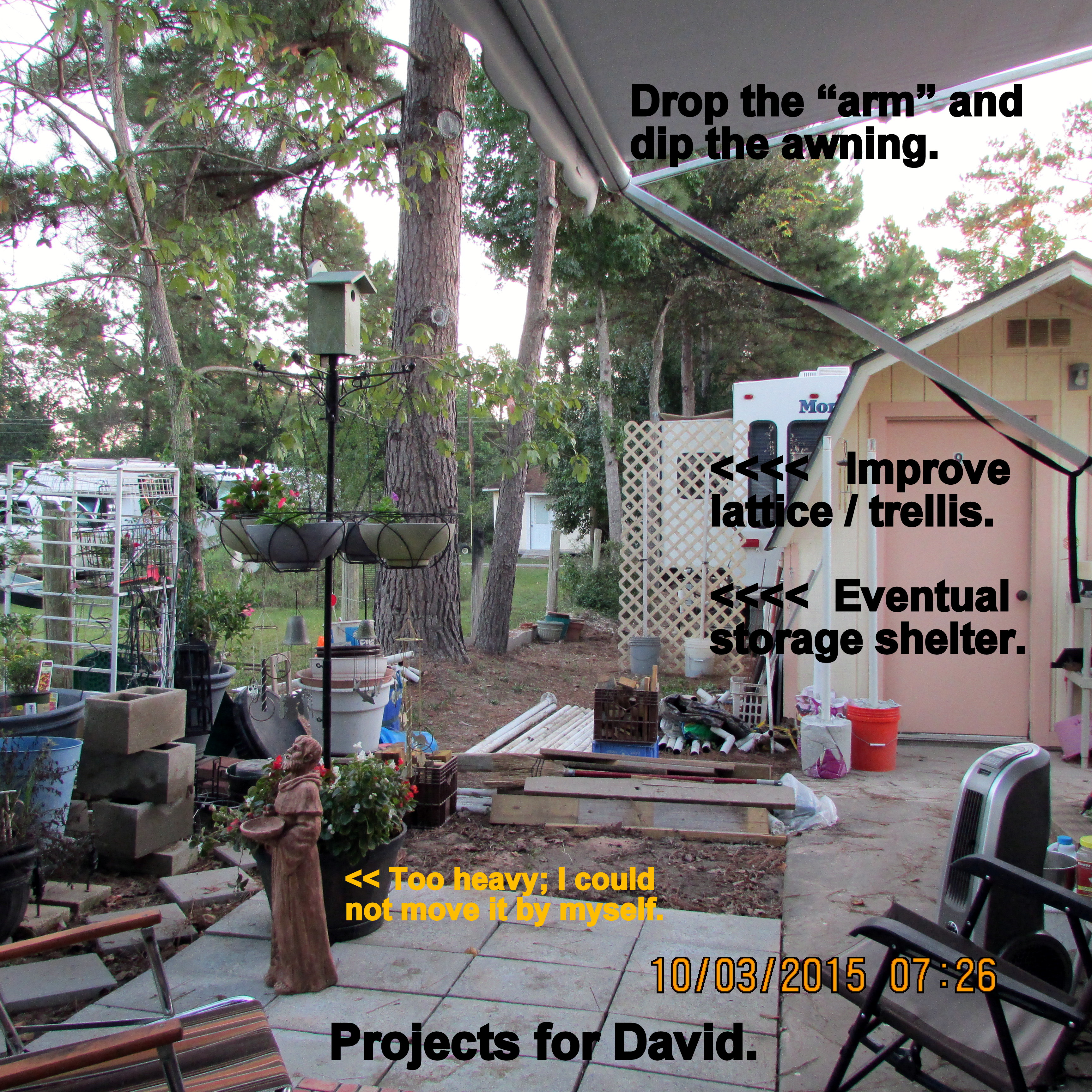 Let me explain. The garden “grew” without an original plan. The major definition was purchase and location of two rain barrels. In the early months of my residency, I collected water in dish pans, etc., etc. When FedEx delivered the rain barrels, I (obviously) put them under the corner of the awning that channels rain water. In picture one, note the low “arm” support. I’ve hung that bright orange vest to alert my visitors. (Yes, visitors have bumped their head!!) My friend and handy-man, David, wants to position the “arm” perpendicular BUT the rain barrels prevent that. My current challenge: Empty the rain barrels and temporarily shift them out-of-the-way. The answer: 1) Drop both “arms” (and secure them), 2) “dip” the awning at the other end, and then 3) appropriately position the rain barrels. In picture two, see where I removed several large planters in preparation for the rain barrels. Hey, this is a major undertaking!! At least four more cement (patio) blocks at the far end… and eventual “re-do” of blocks where the barrels currently sit. Finally, decide where to relocate the planters (nine are victims of this shuffle).
