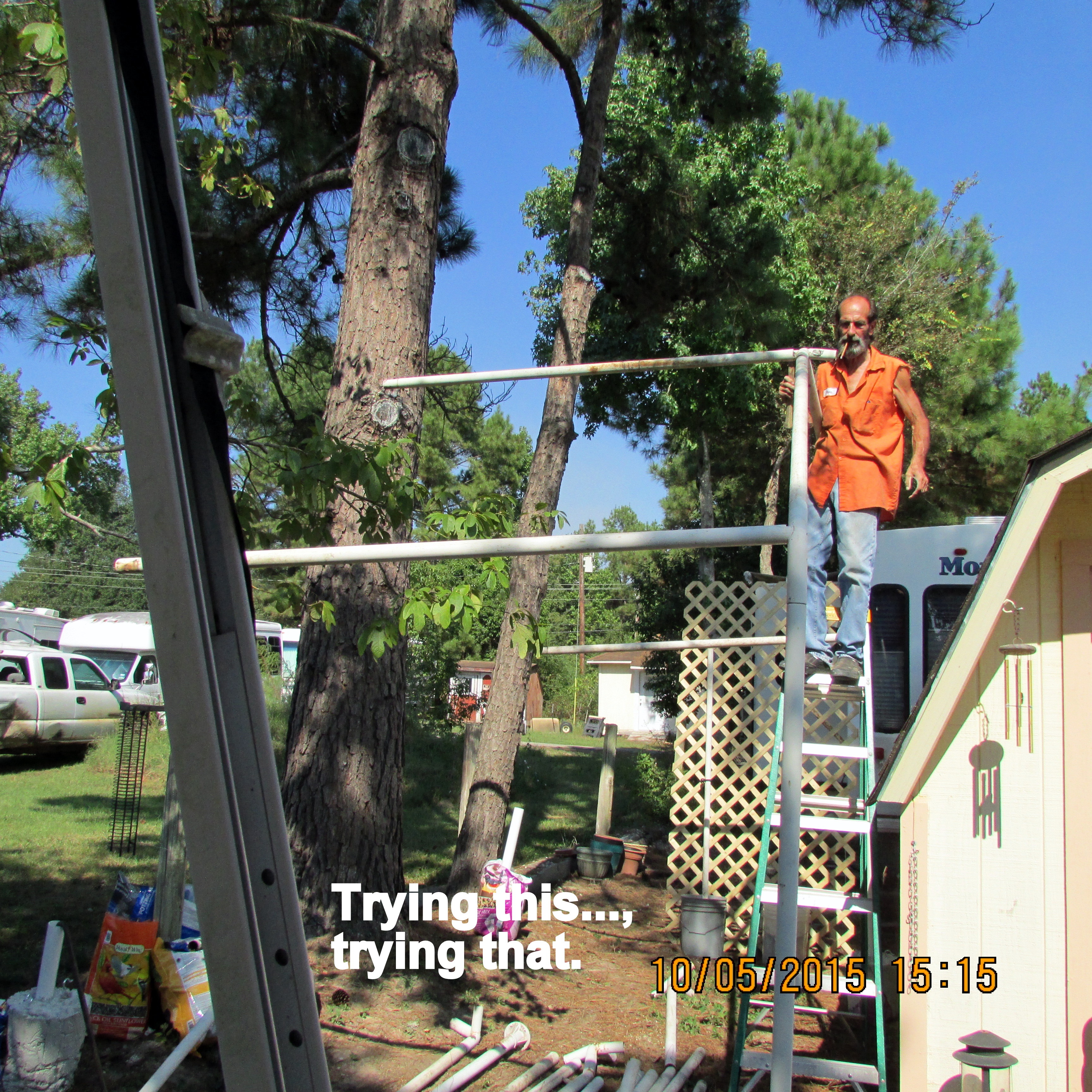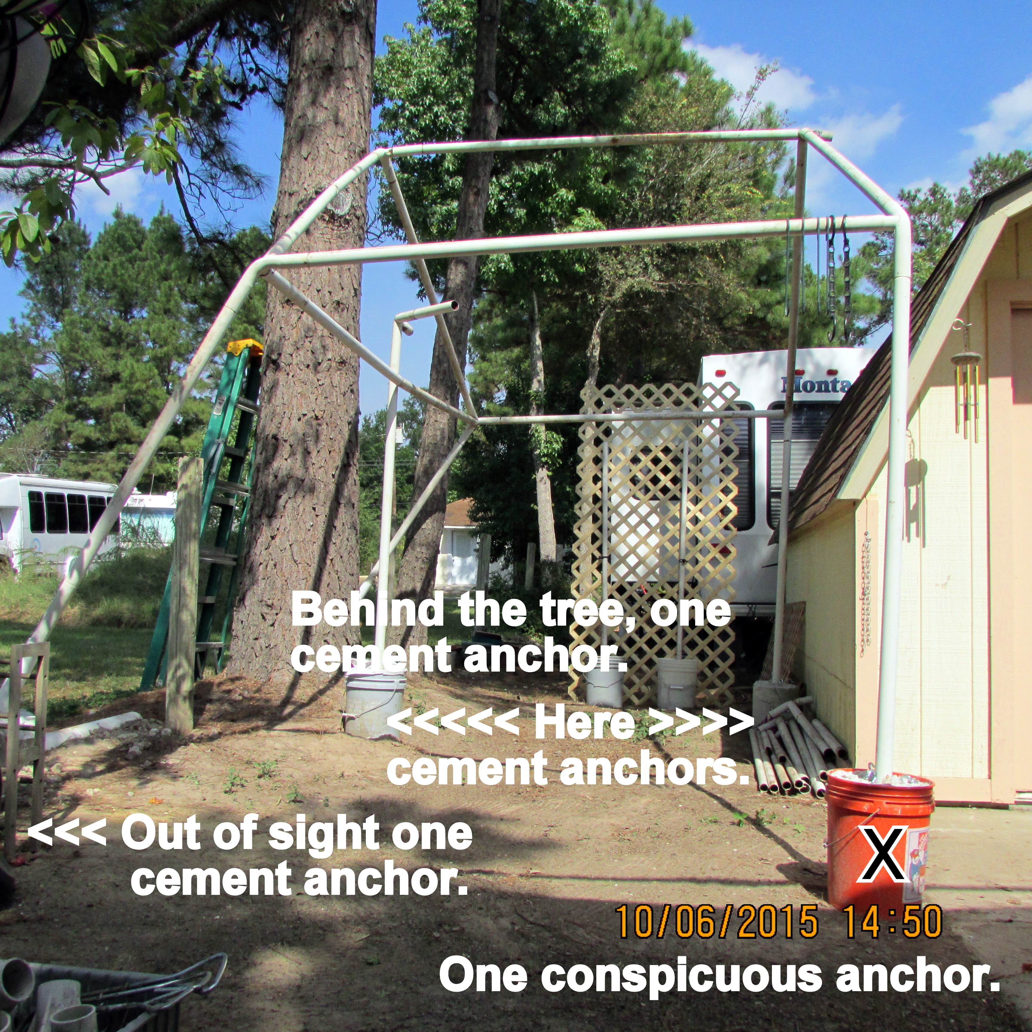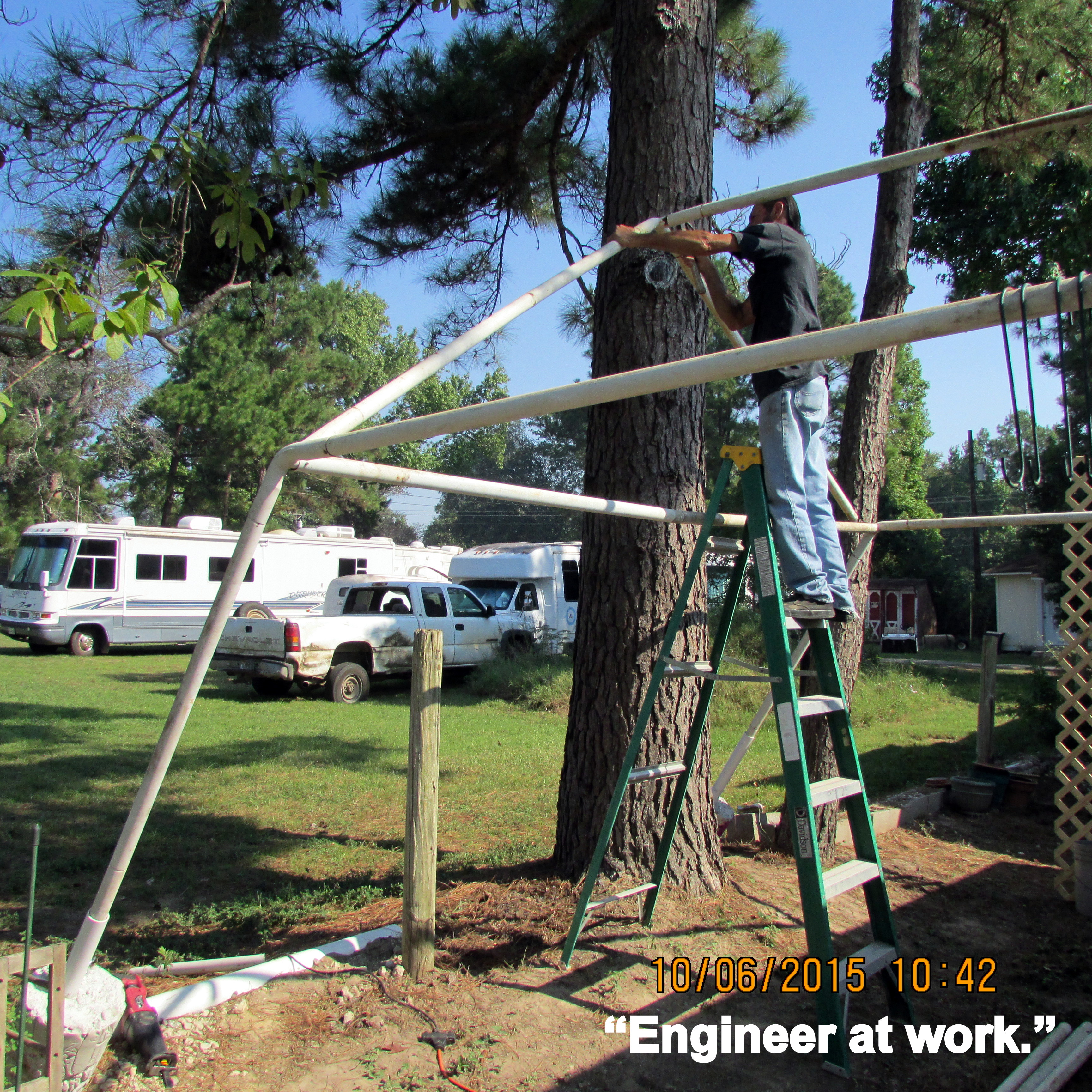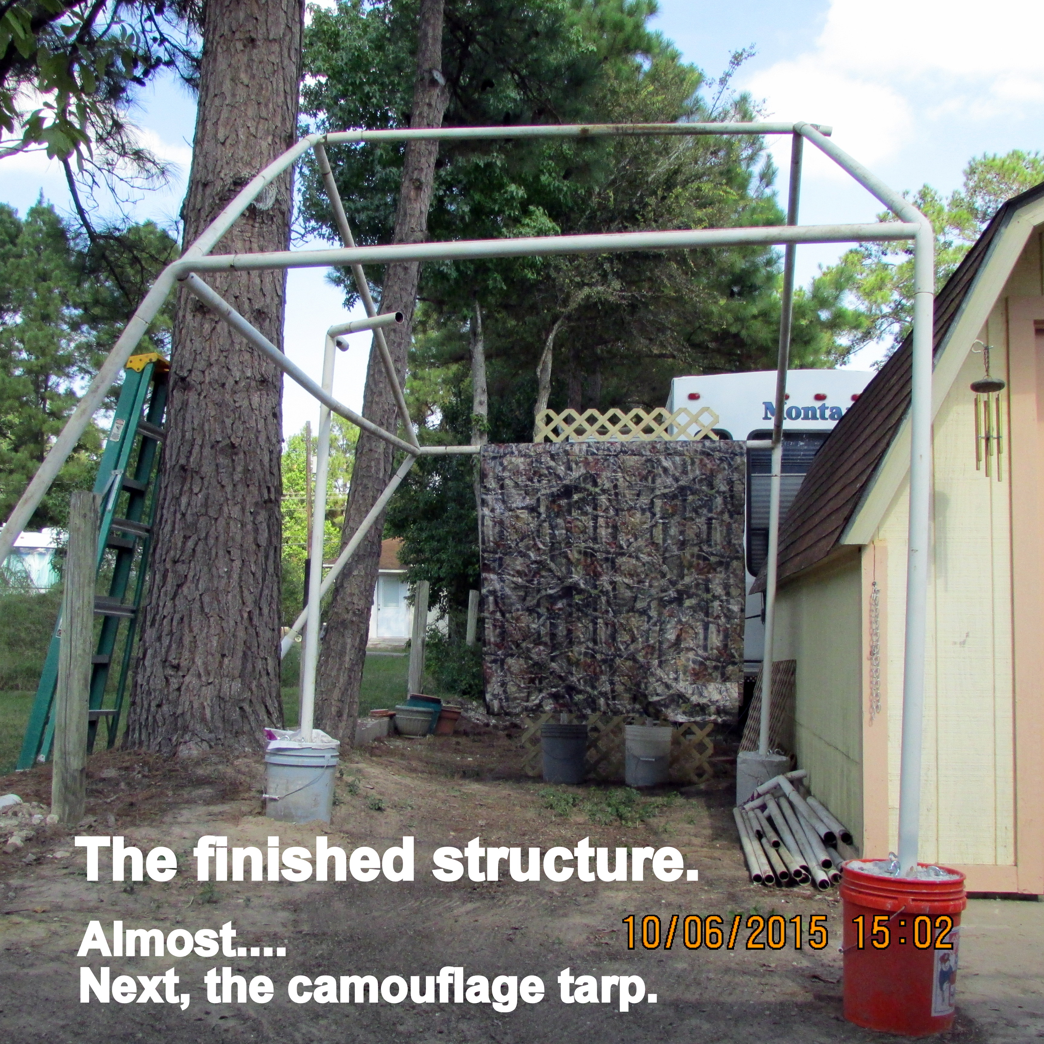 “Beauty is in the eye of the beholder.” In my humble opinion, my “storage shelter” will be “splendid”!! It is truly remarkable how David took salvaged pieces of pipe and engineered a structure that will withstand an earthquake. The five cement “anchors” weight over one-hundred pounds each. The wind won’t topple them!! Pipes slide together; pipes slide into angled “joints”; screws hold them so they won’t wiggle apart. We’ll make every effort to secure the camouflage tarp but recognize that a hurricane could rip away “the roof.” (Hopefully, no hurricane!!) ~~ The first two pictures show the completed structure.
