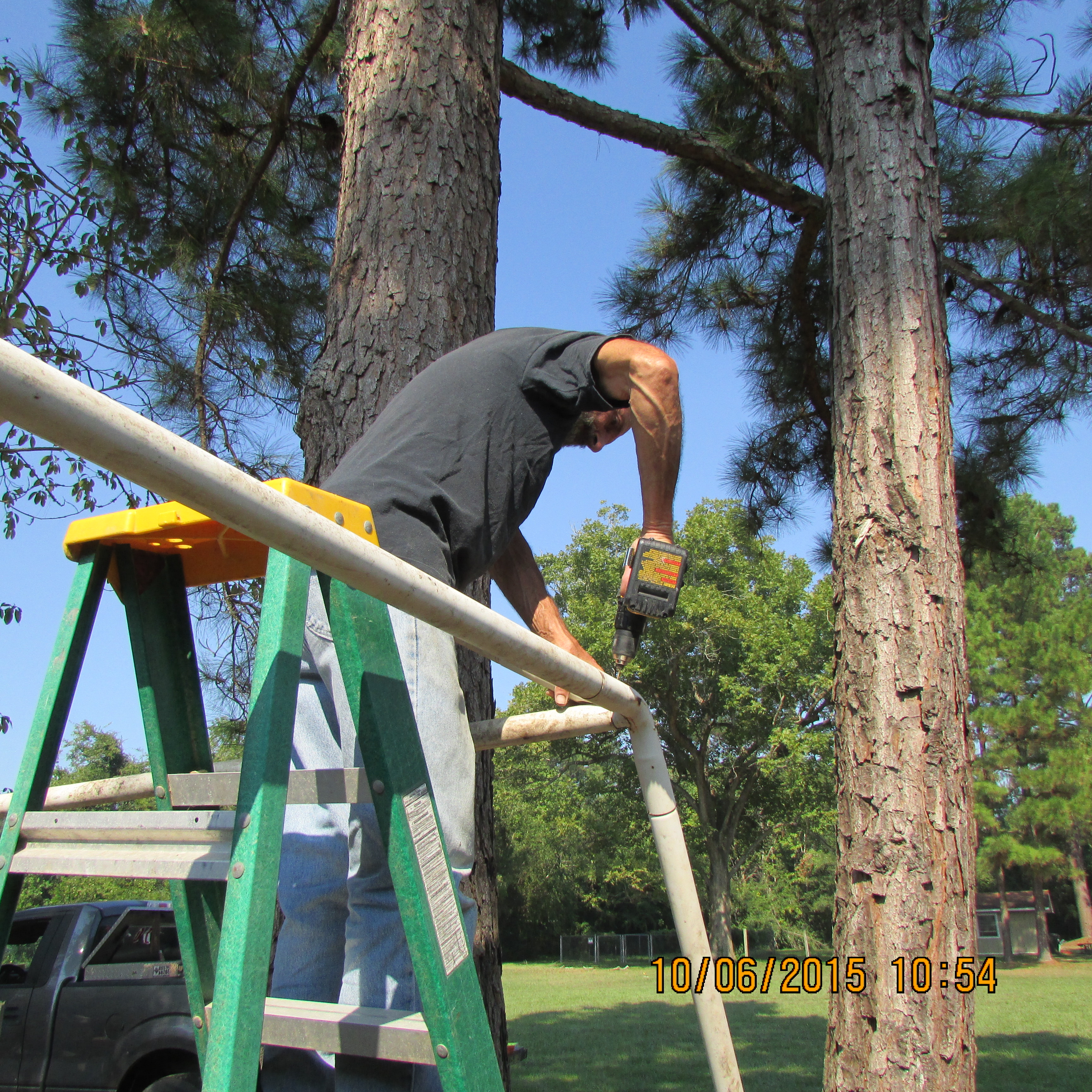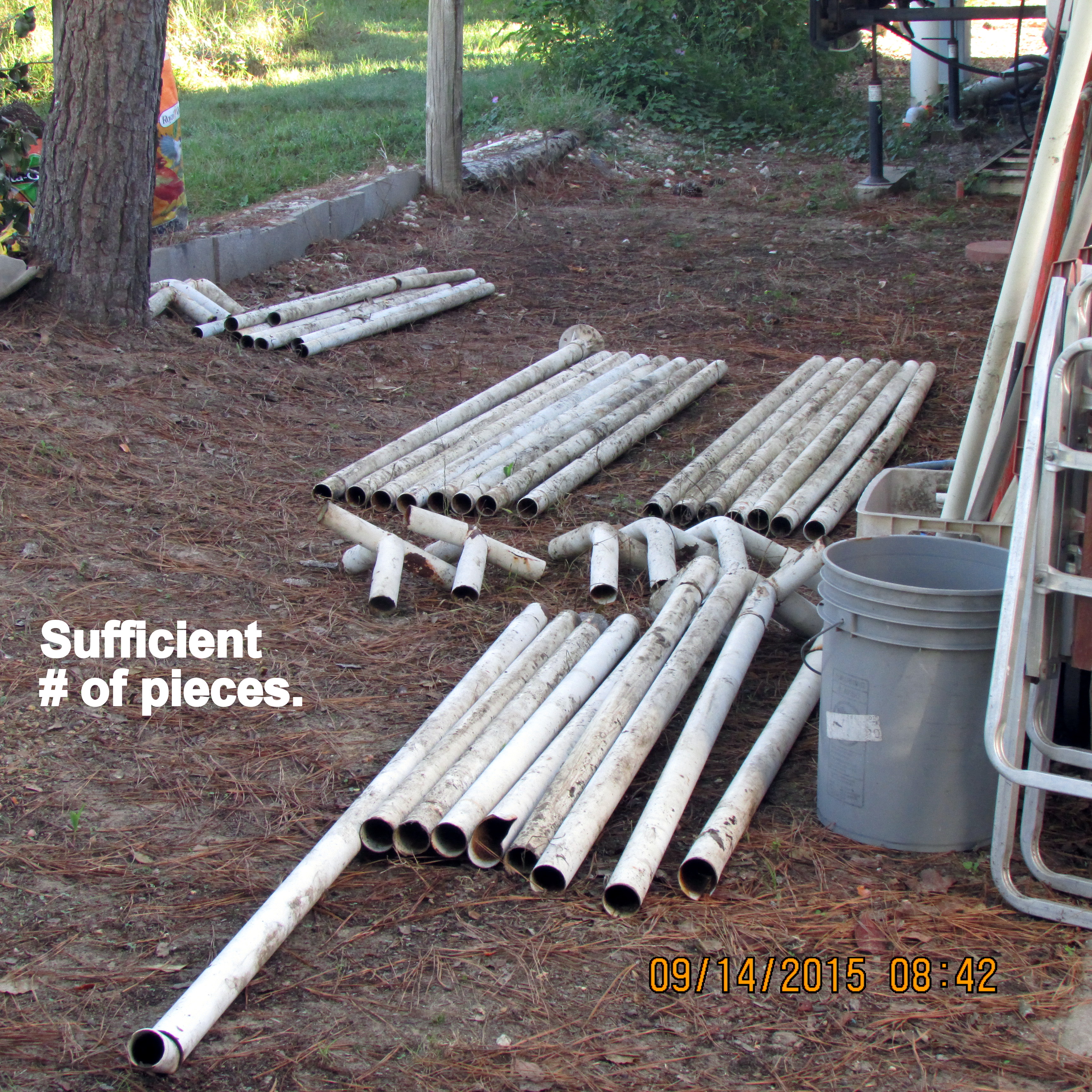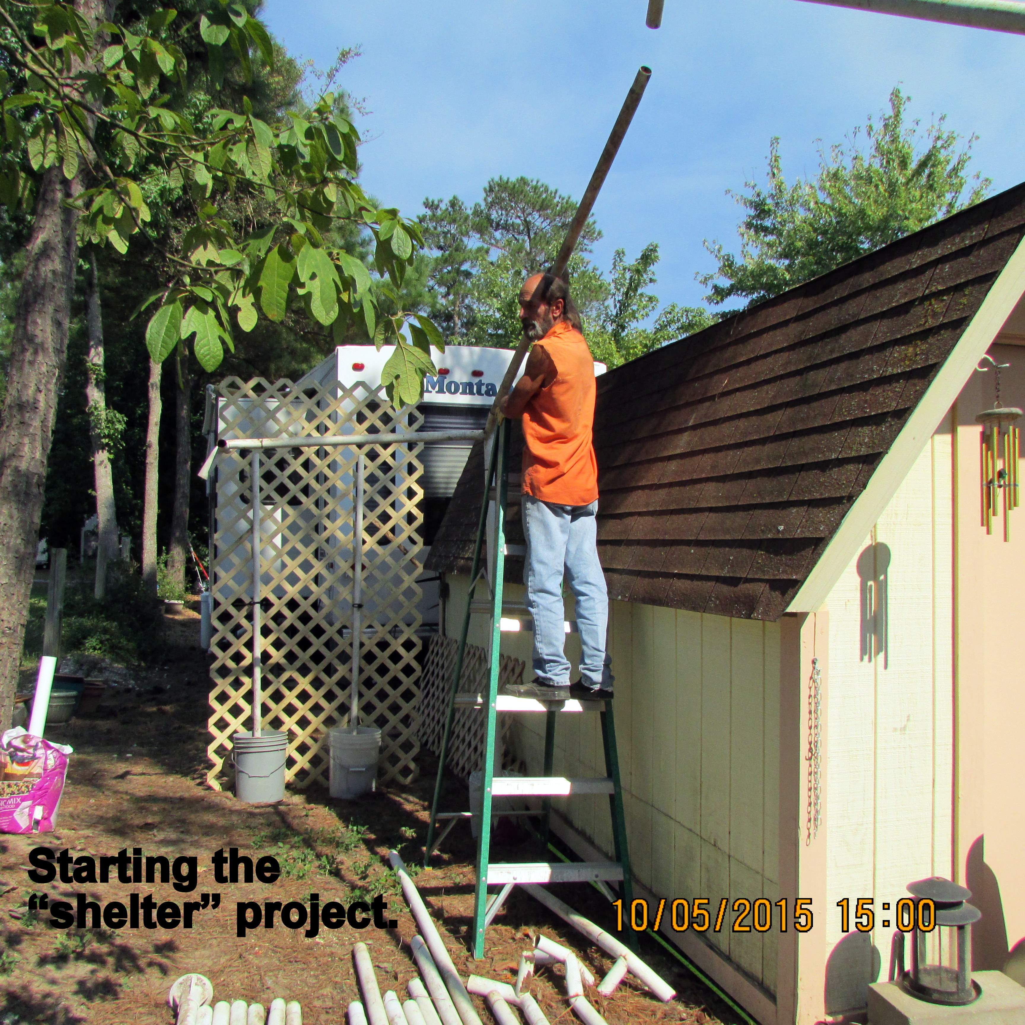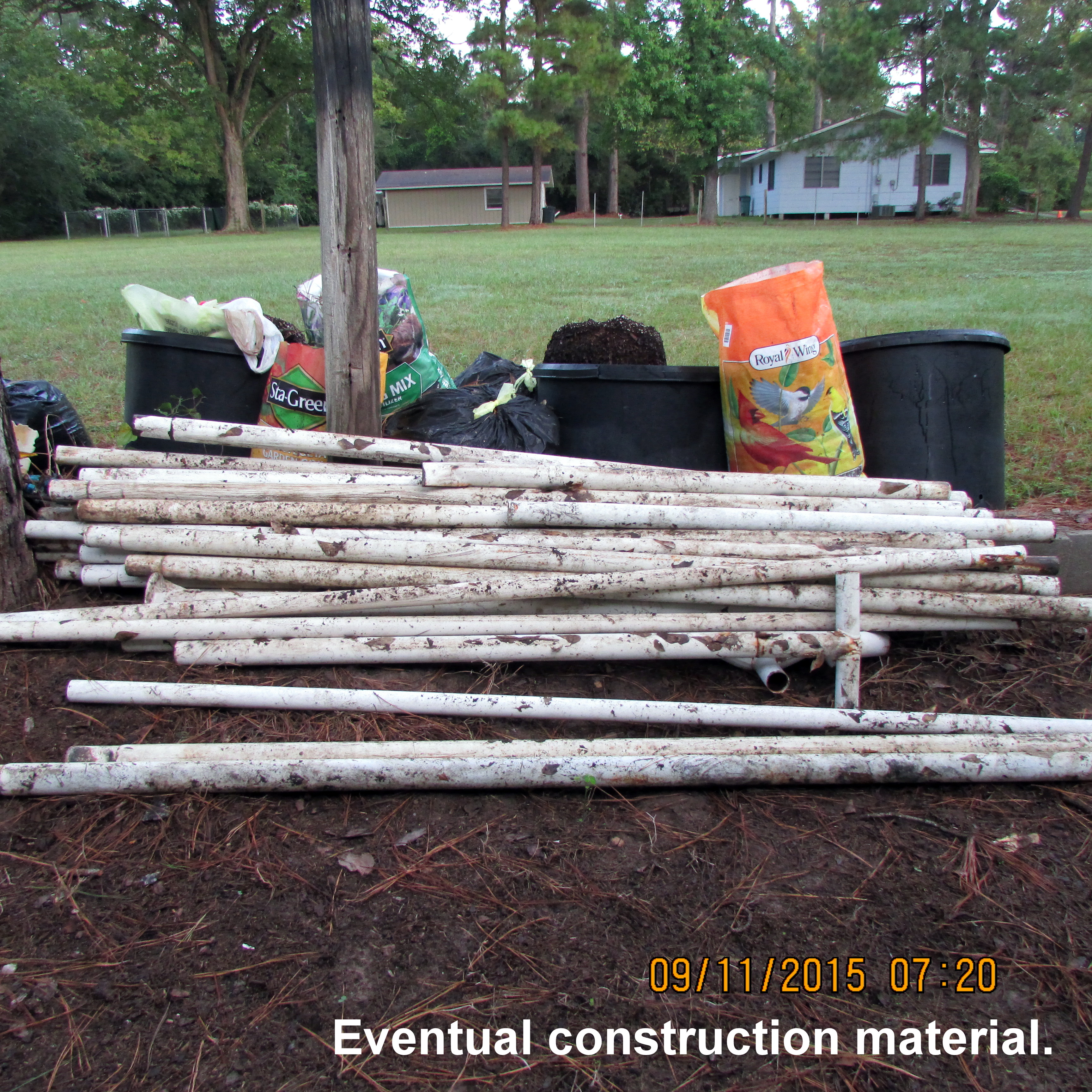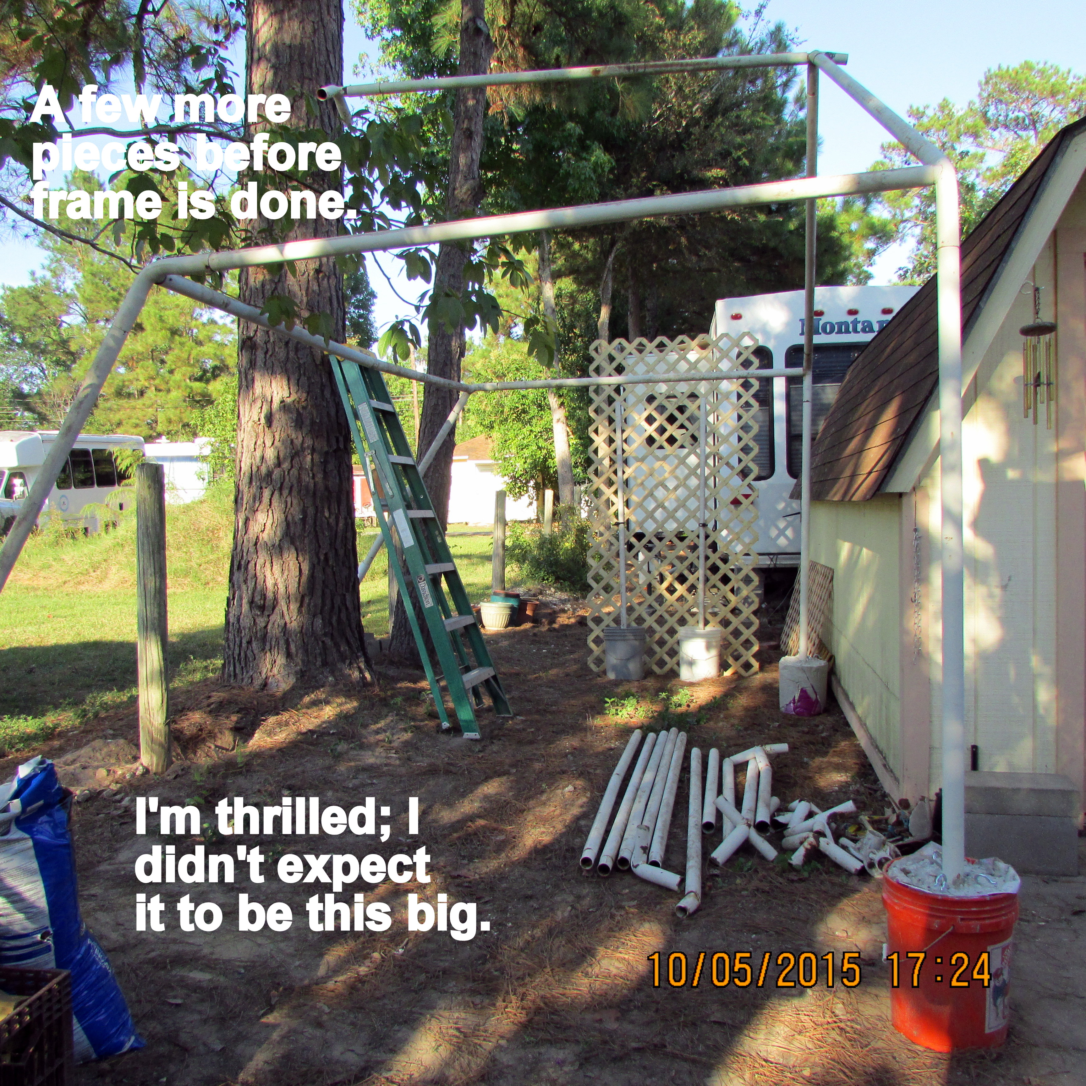 “Beauty is in the eye of the beholder.” In my humble opinion, my “storage shelter” will be “splendid”!! It is truly remarkable how David took salvaged pieces of pipe and engineered a structure that will withstand an earthquake. The five cement “anchors” weight over one-hundred pounds each. The wind won’t topple them!! Pipes slide together; pipes slide into angled “joints”; screws hold them so they won’t wiggle apart. We’ll make every effort to secure the camouflage tarp but recognize that a hurricane could rip away “the roof.” (Hopefully, no hurricane!!) ~~ The first two pictures show the completed structure.