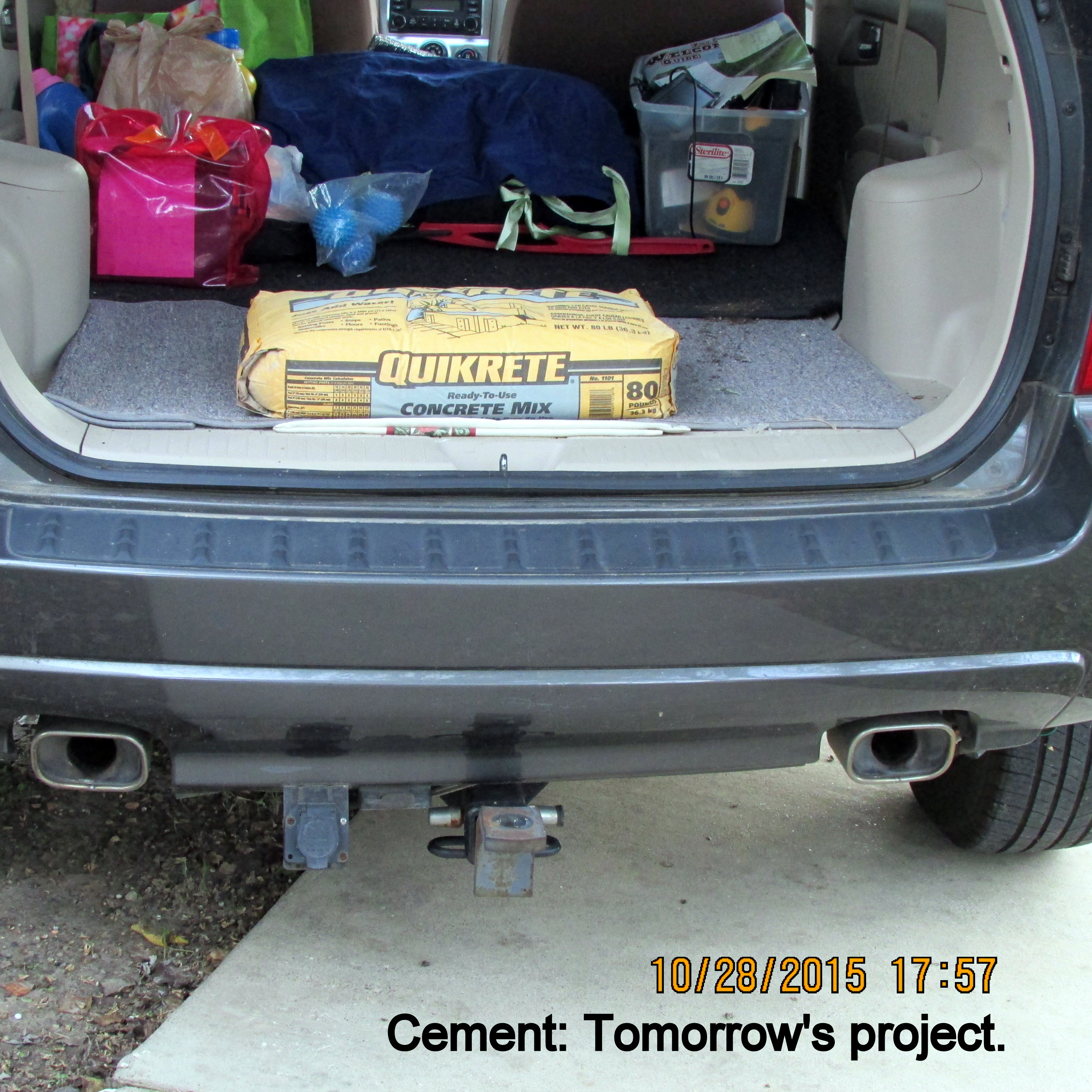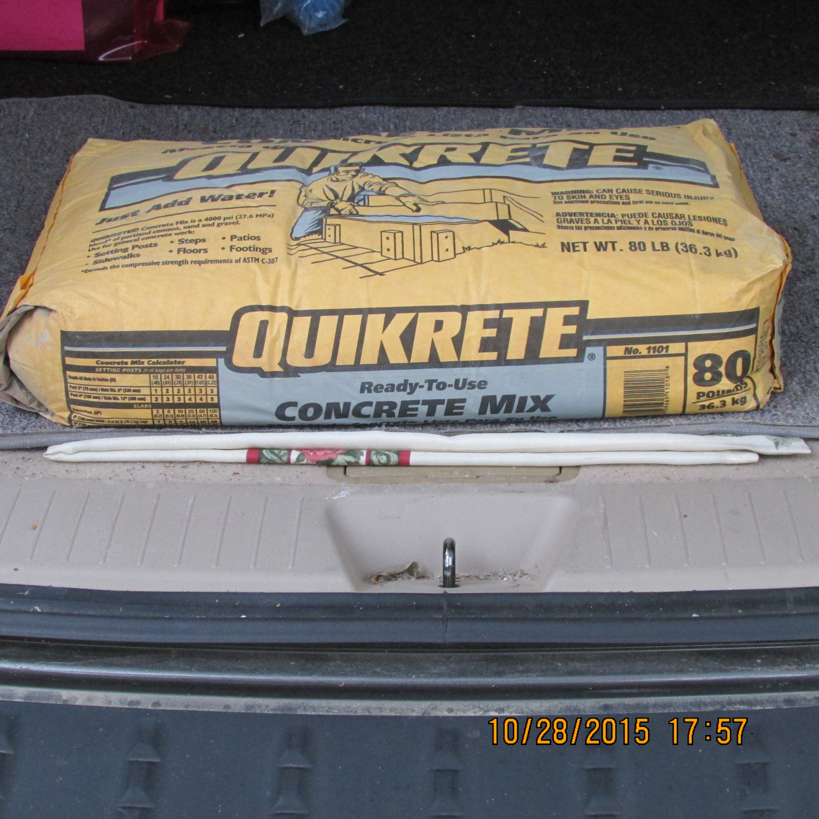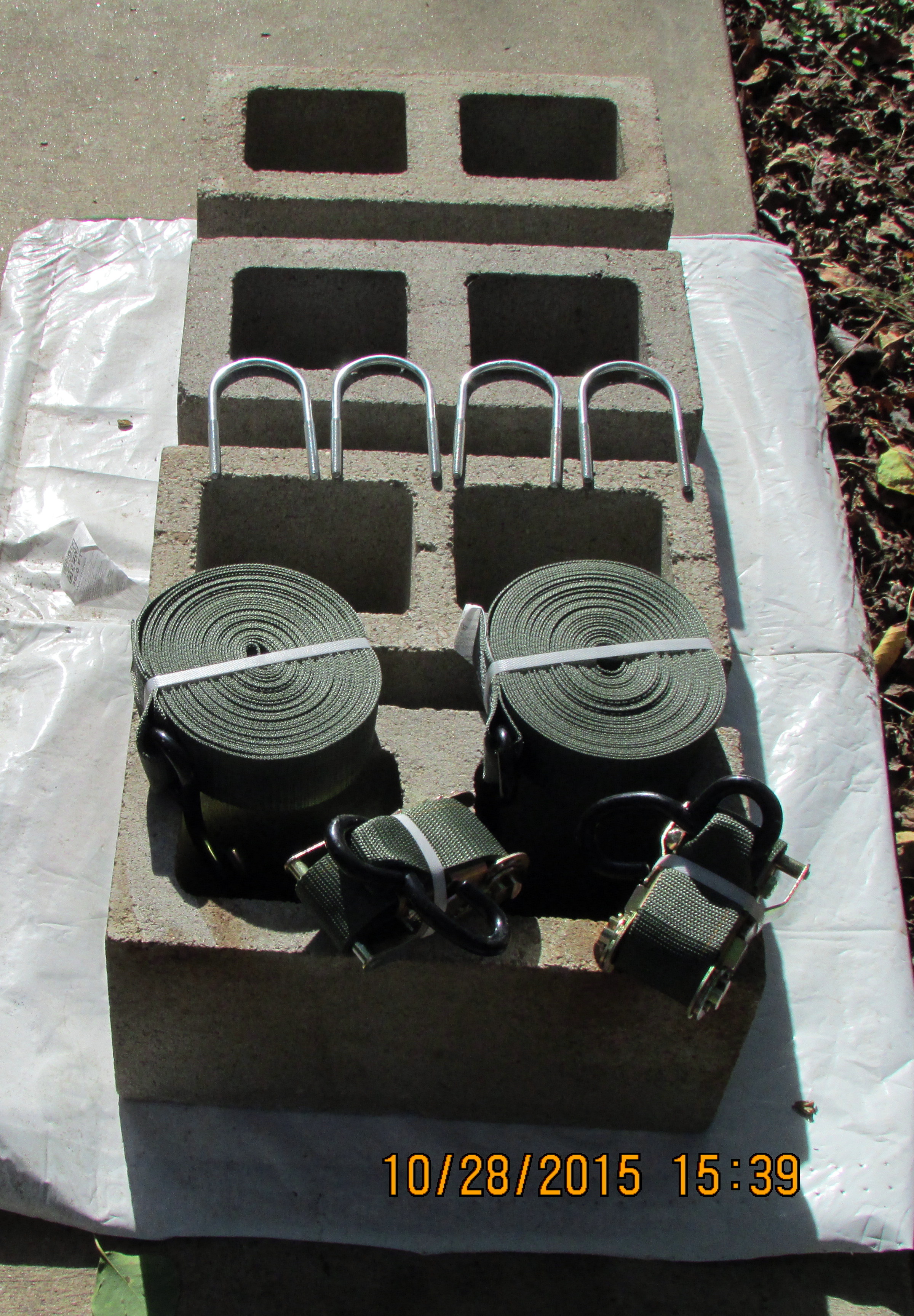 It only makes sense to me!? I ordered long “tie downs“ to go across my tarp-shelter. Rather than putting cement in pails, I choose to put cement in the middle of these cement blocks–with a horseshoe-shape bolt embedded. I have the blocks; I don’t have pails. Less expense, this way, and just as effective.