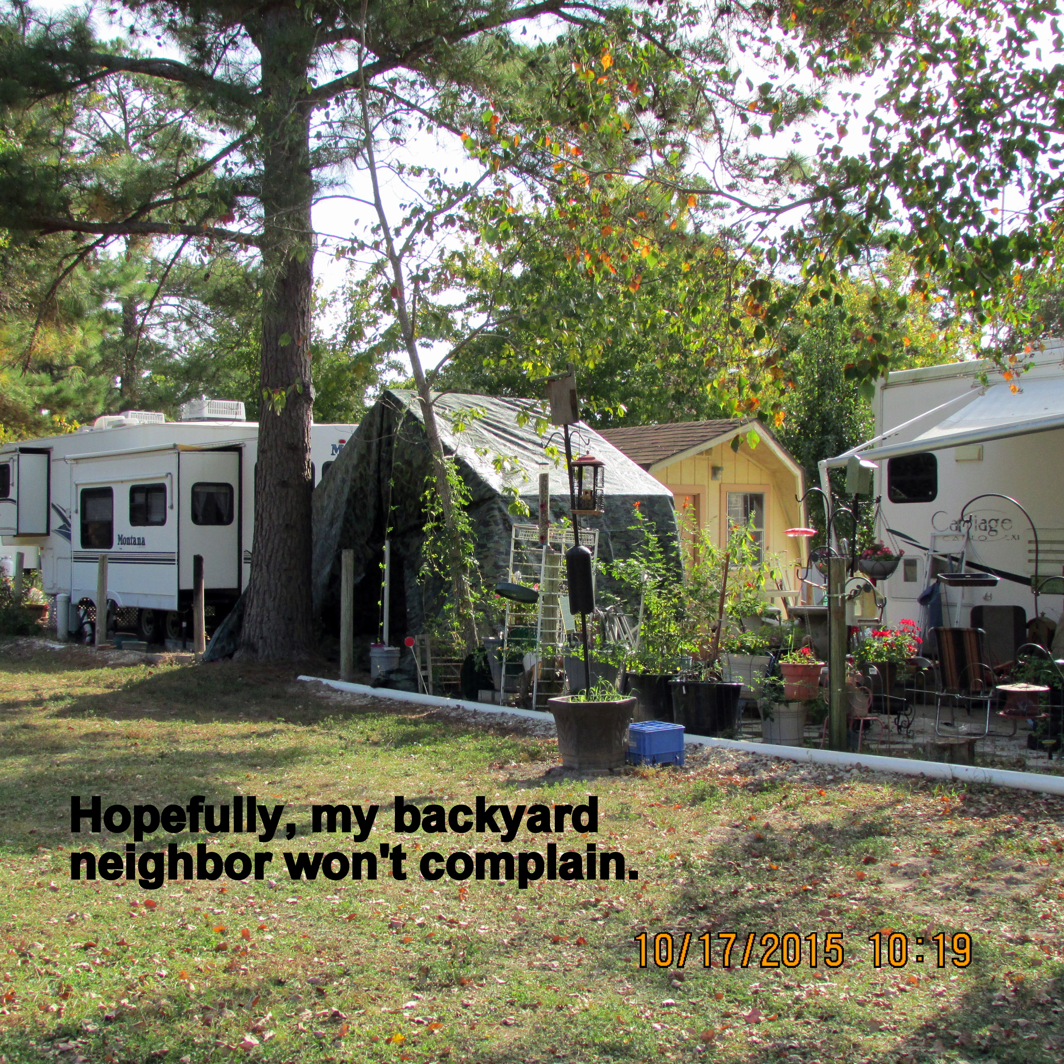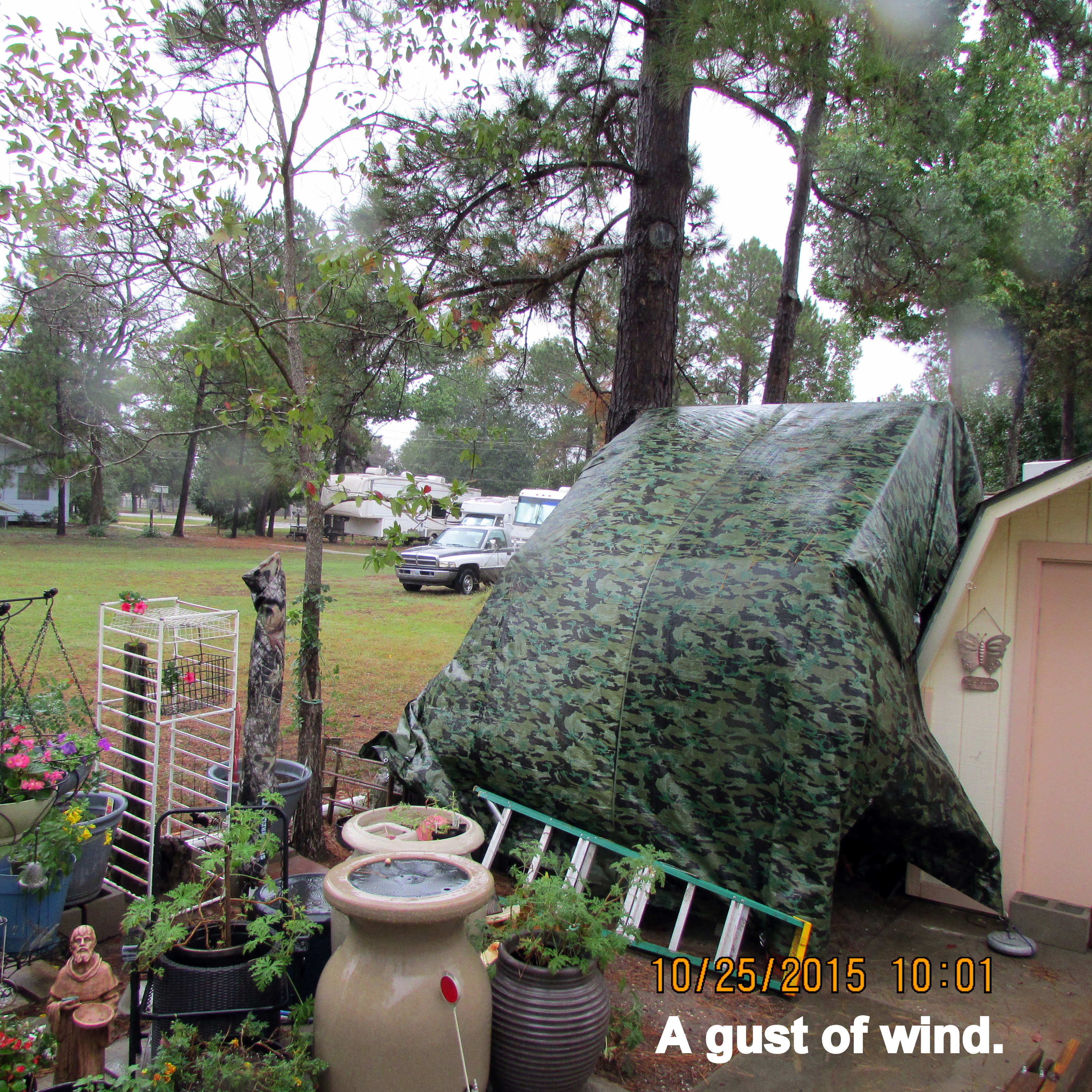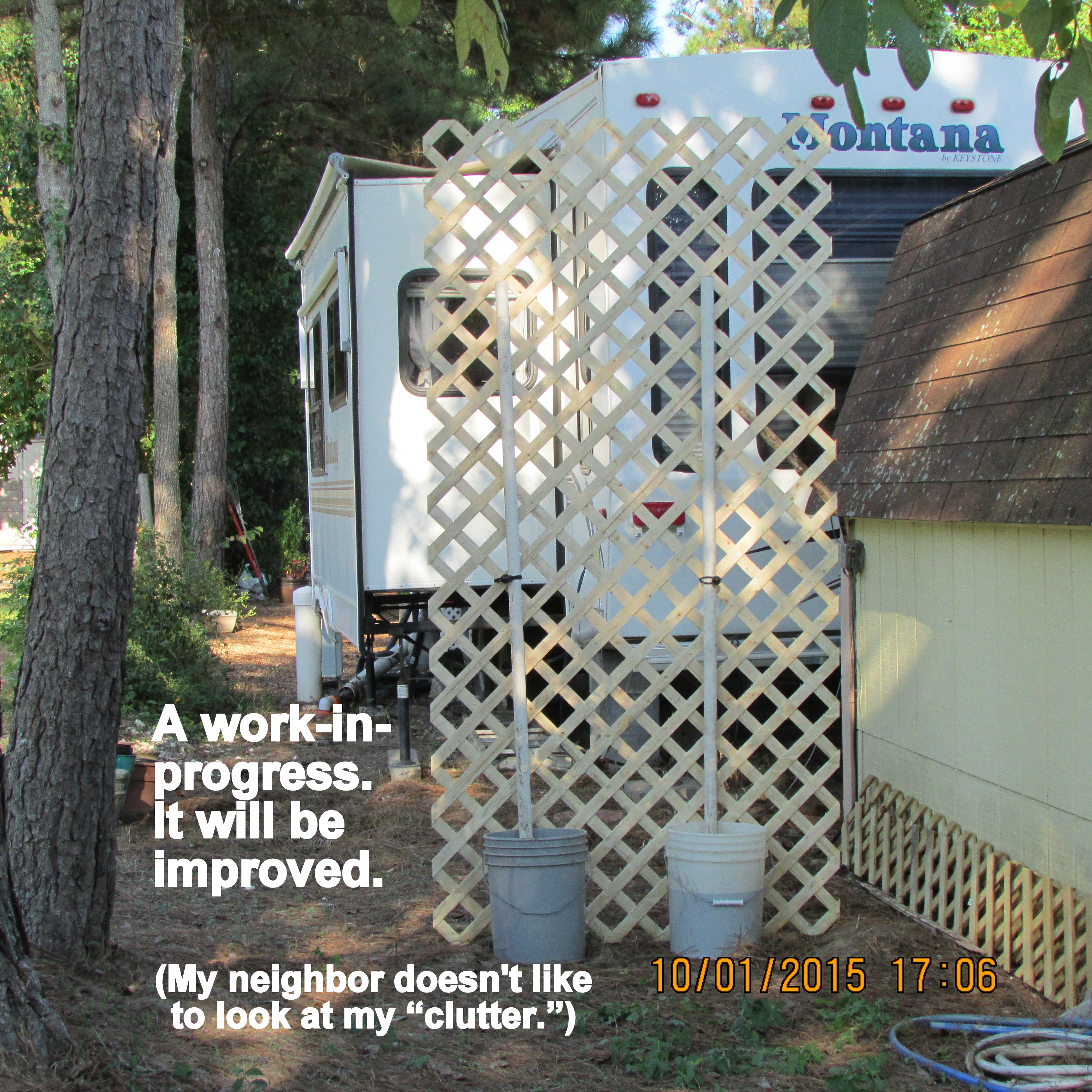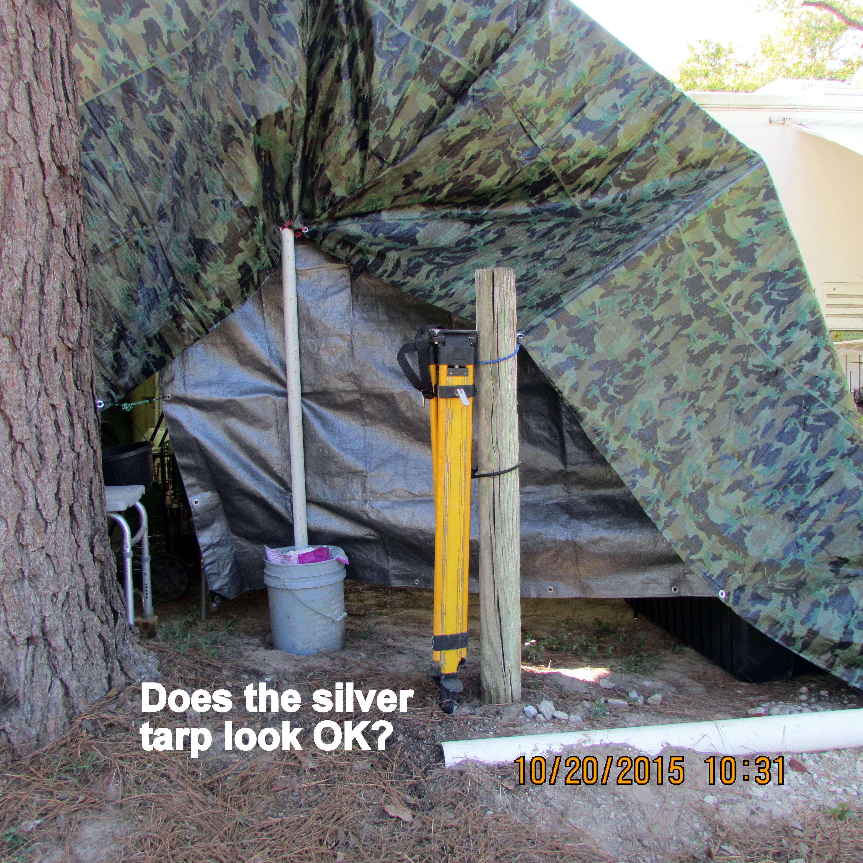 Good news: The backyard neighbor loves the camouflage tarp. She doesn’t want the lattice/trellis again. ~~ I moved the cement bases–temporarily–for the Thrift and Gift sign.