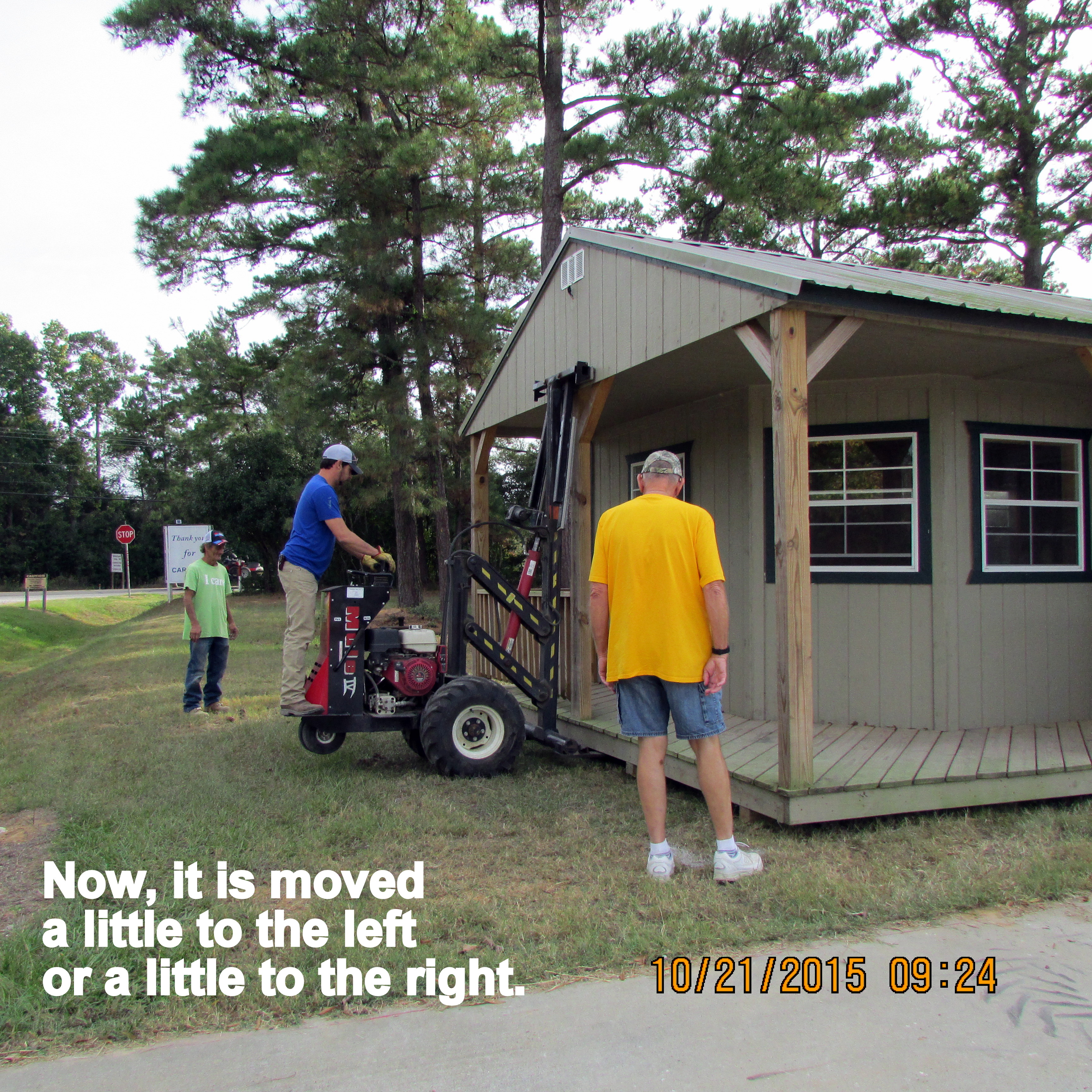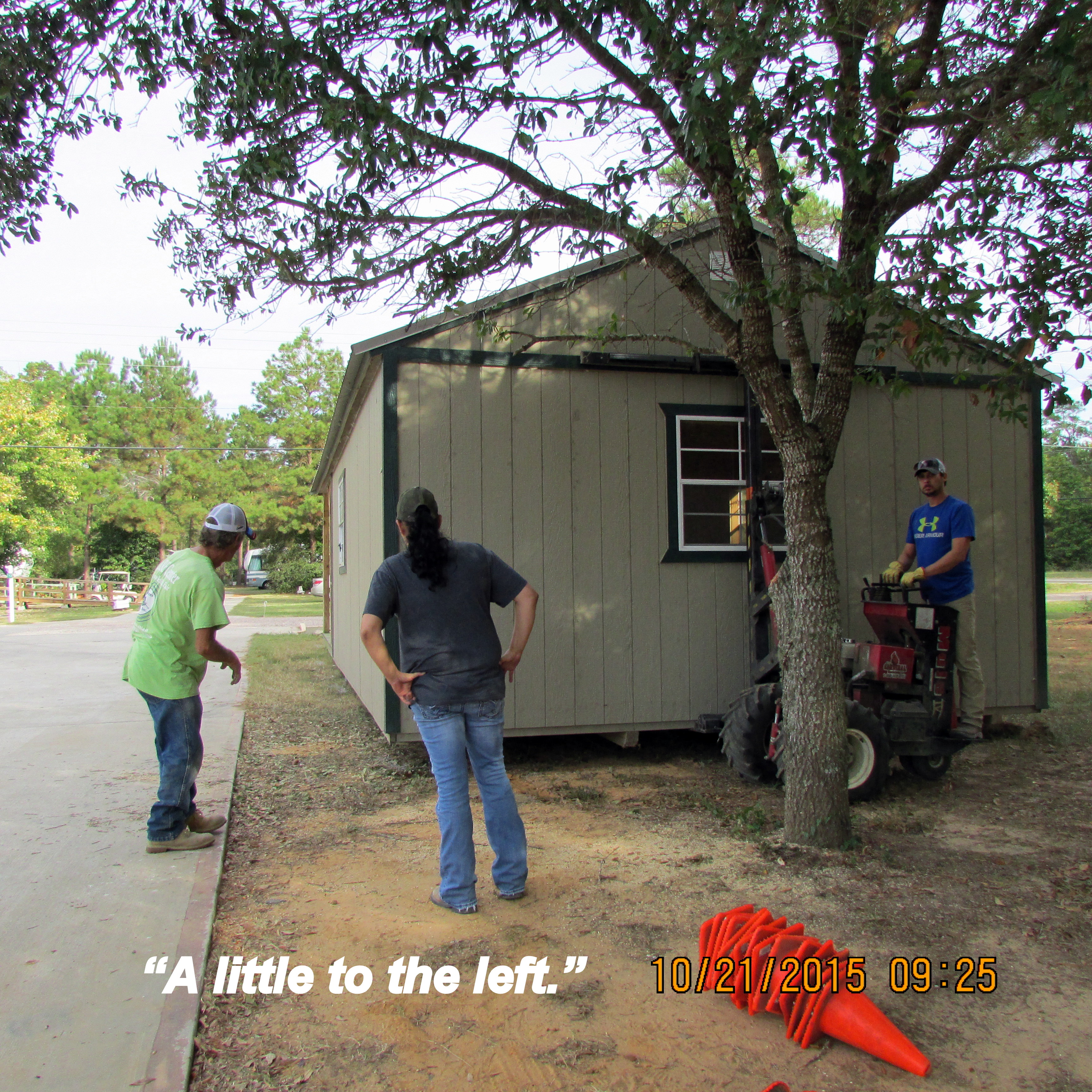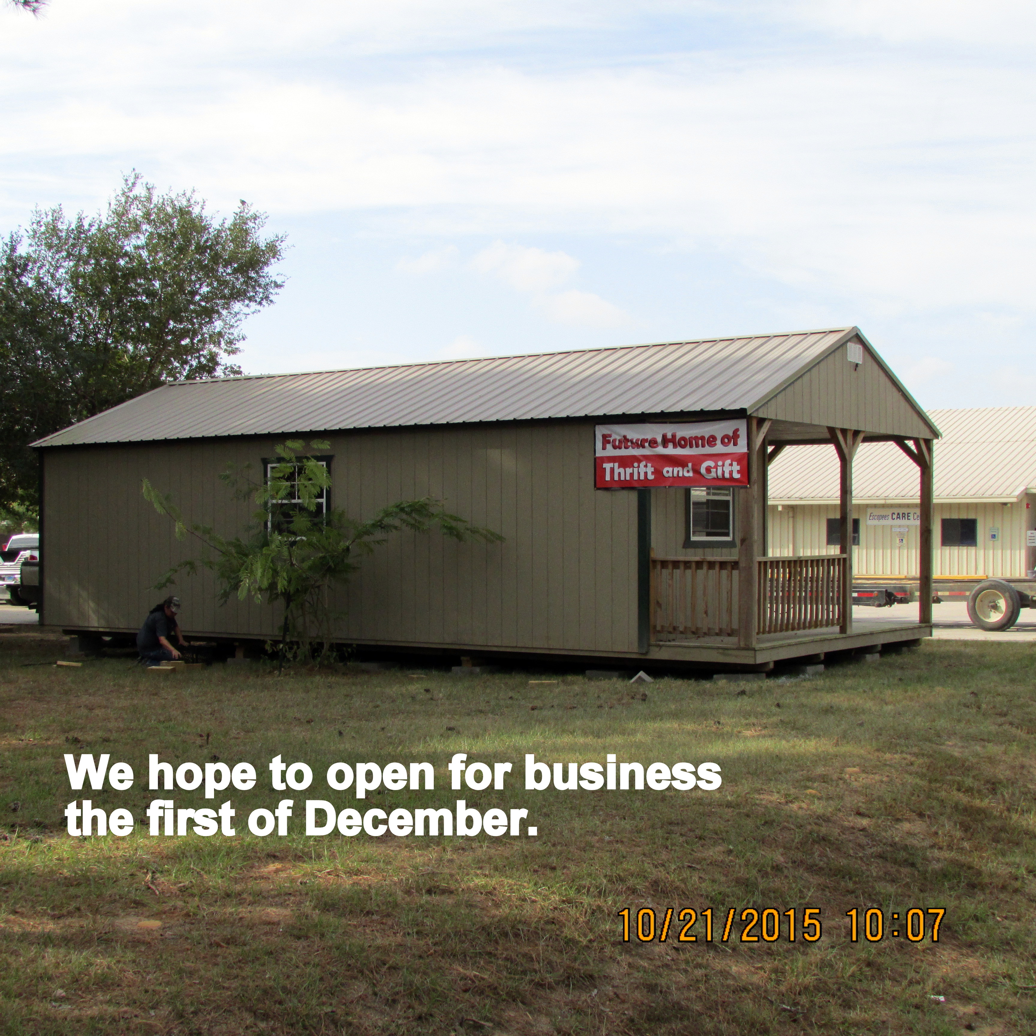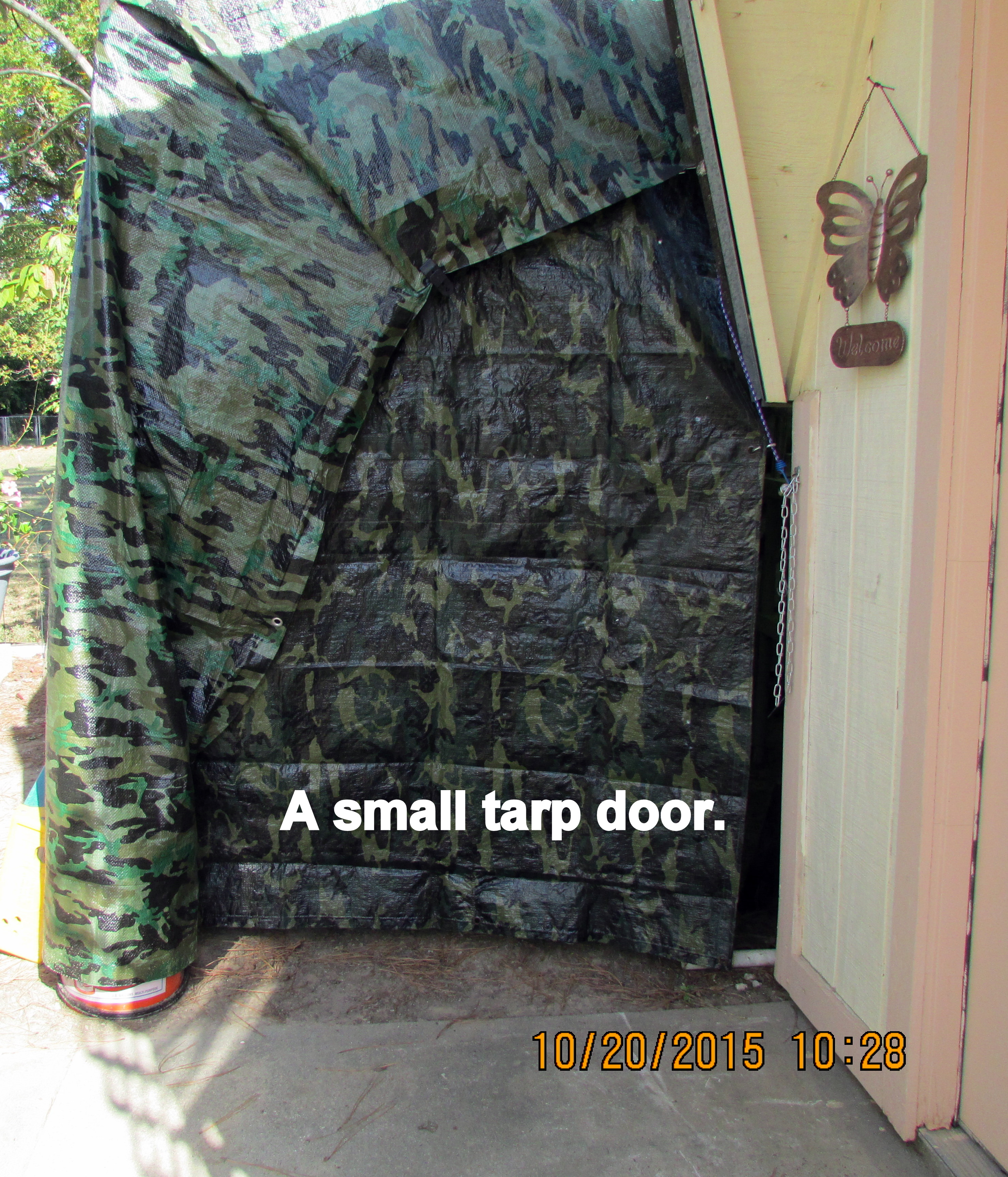 Good news: The backyard neighbor loves the camouflage tarp. She doesn’t want the lattice/trellis again. ~~ I moved the cement bases–temporarily–for the Thrift and Gift sign.