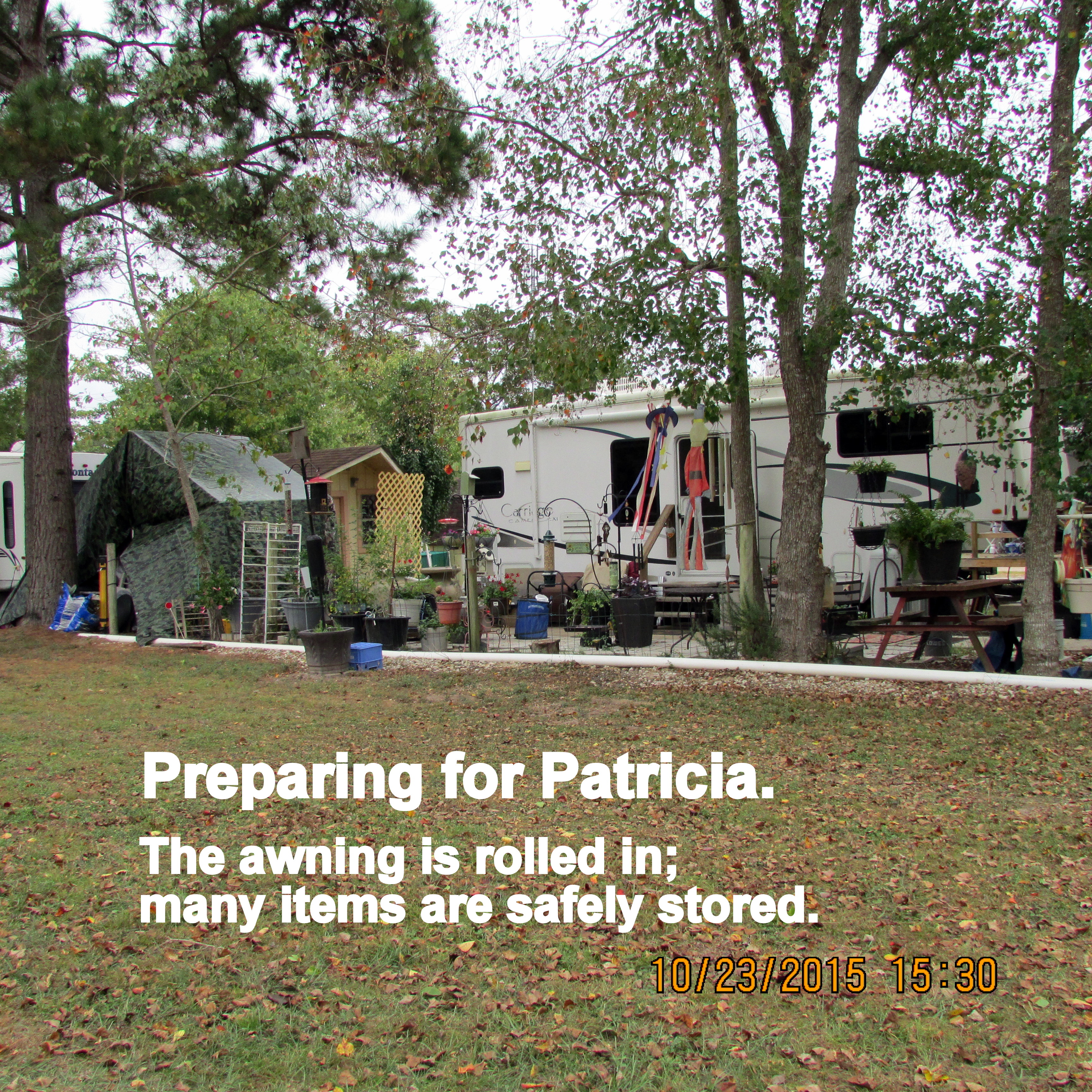 Watching television weather programs, I’m grateful to report that we (at CARE) are fine. The rain has been steady but mild (can’t hear it on the roof). ~~ Dallas (to the North) and Houston (to the South) has major flooding. I have “no flooding” (and my yard [during previous storms] has affectionately been identified as “Lake Lorraine“). ~~ Anticipating strong wind from remnants of Hurricane Patricia, my awning is rolled up. Sadly, I’ve missed filling the rain barrels (emptied recently for their relocation). ~~ Forgive me; eight-thirty and I don’t want to venture out (in the rain) to check the rain gauge. ~~ Sorry, I can’t find anything on the Internet identifying the amount of rain locally the past twenty-four hours.