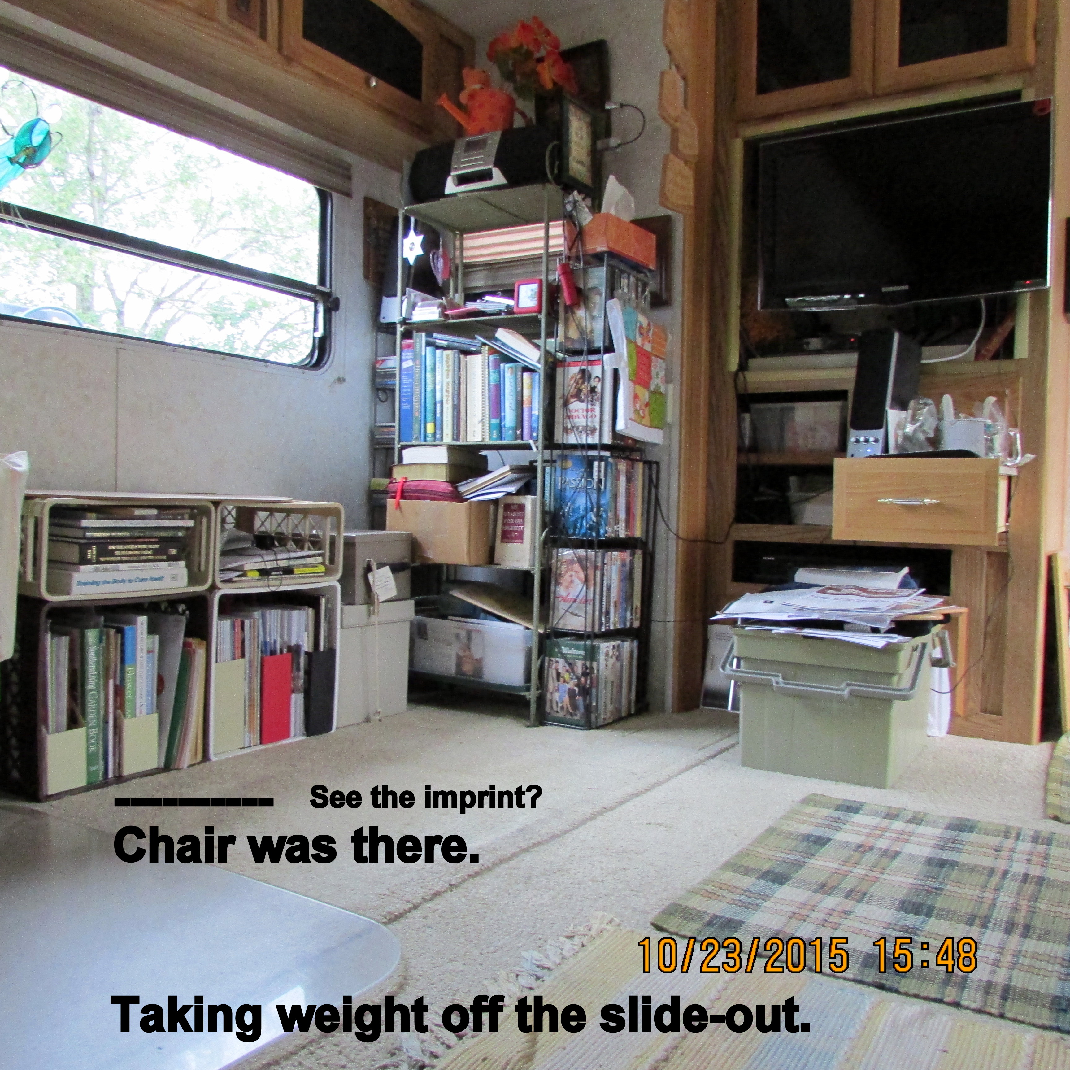 The supports for my slide-out look good, and I don’t have any spongy areas on my floor (that I’m aware of). BUT I am “paranoid” (lol) or properly prepared (proactive)?? ~~ With my “glider”-recliner at that location, I won’t be able to “recline” and limited “gliding.” But that’s the price I pay for piece of mind!!
