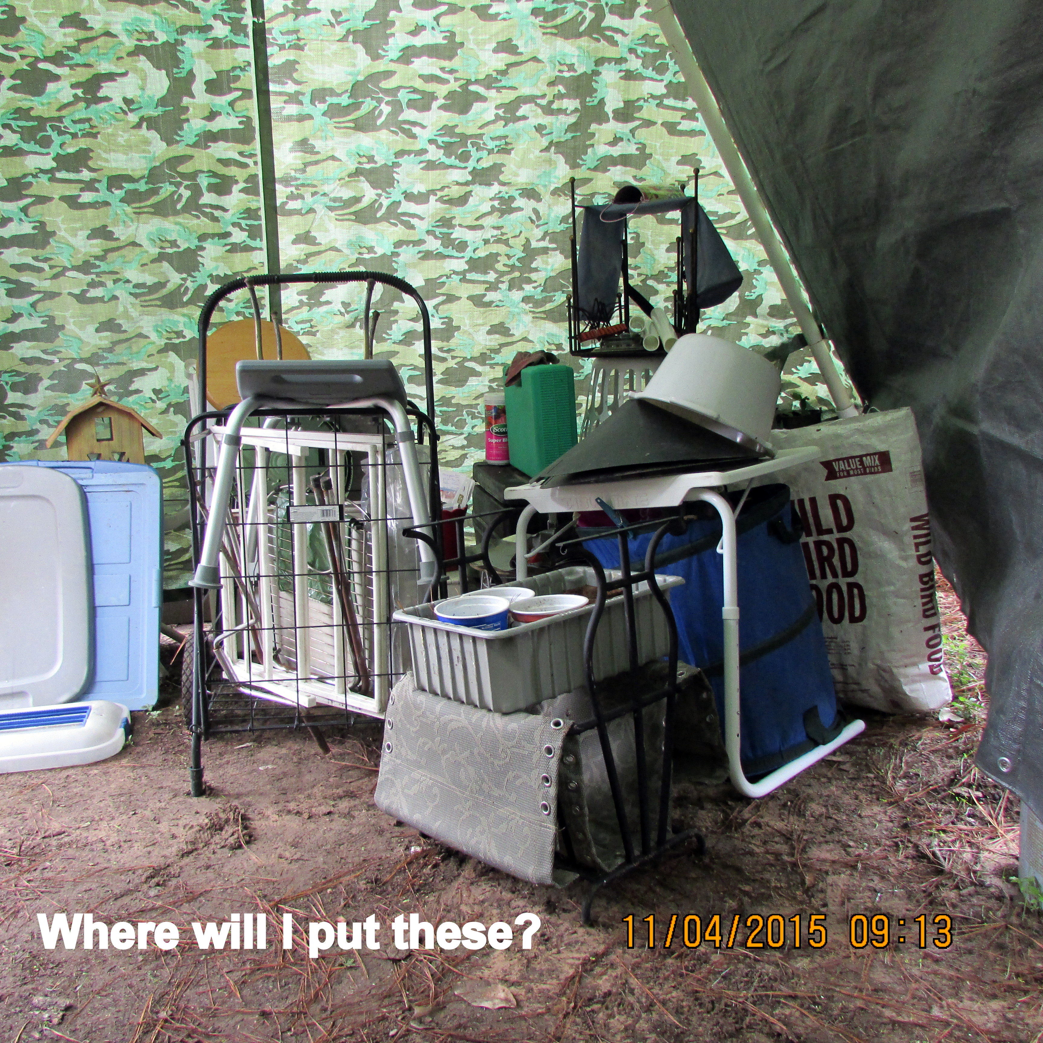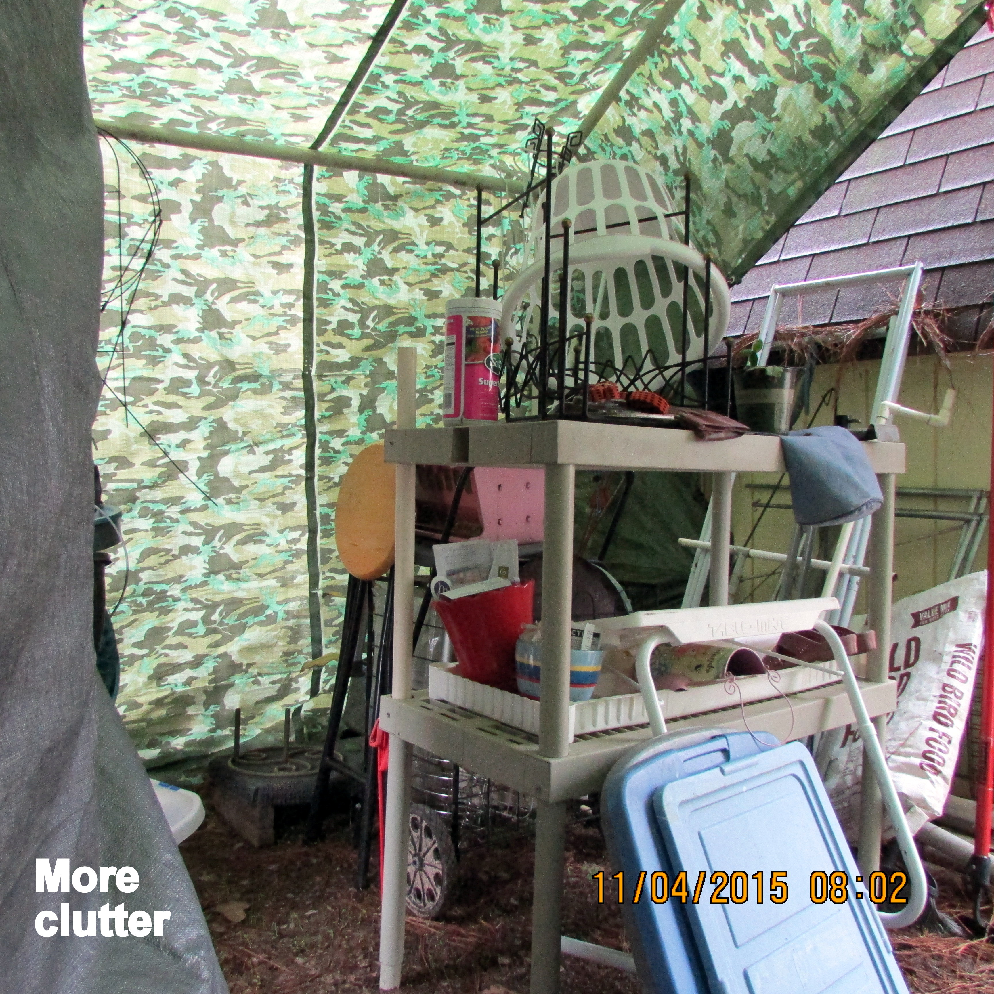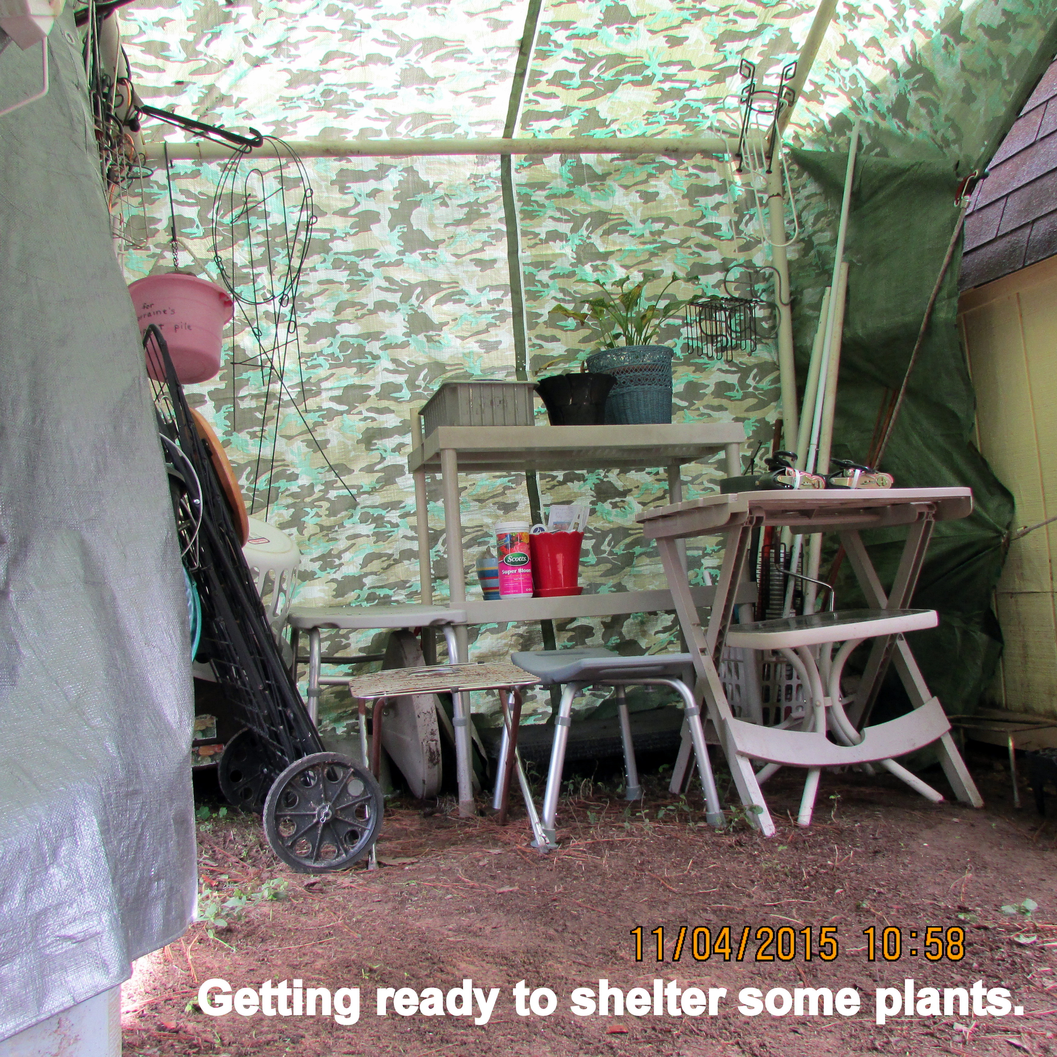 The “target” project, for today, was organization of the shelter. But I raked pine needles, swept debris, hosed off debris, and much more. I’m closer to that day when I move perennial plants under cover when TV meteorologist’ advise us of freezing temperatures. Read “Salvage… to Splendid“ for shelter construction pictures.