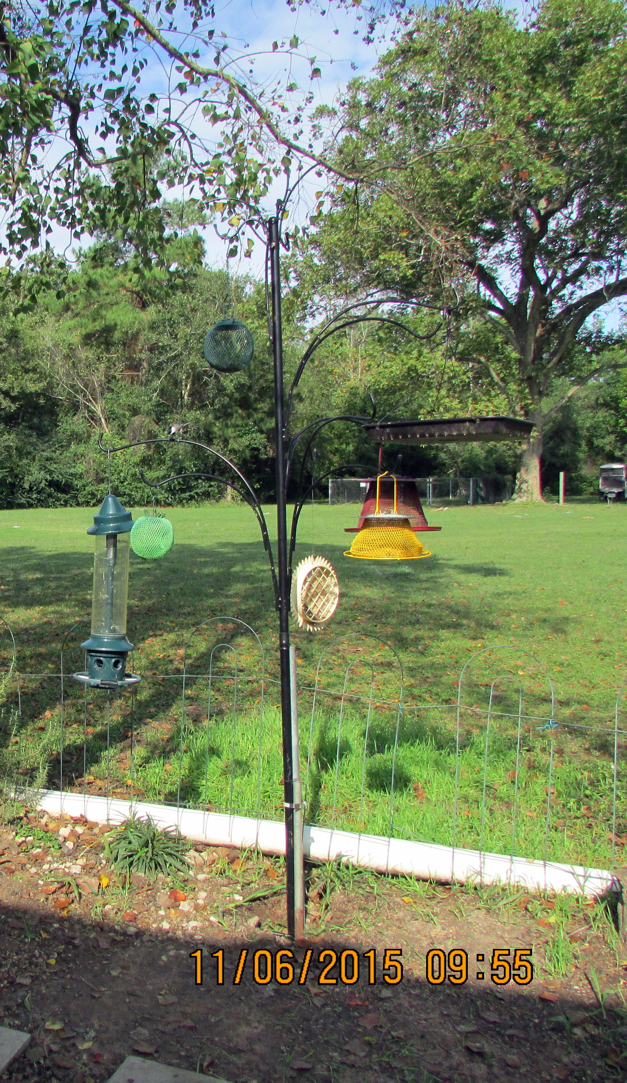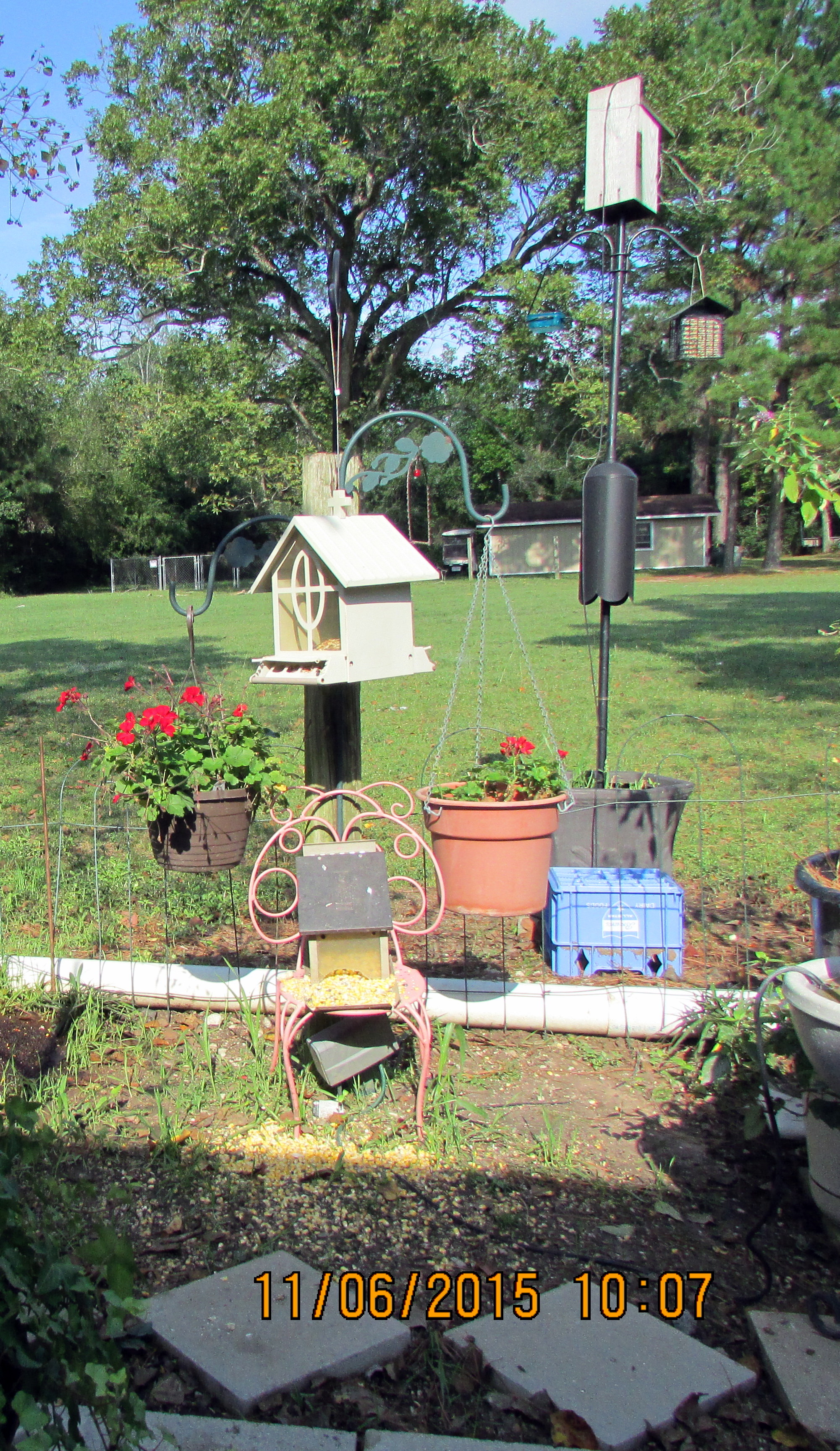 Very little rain; beautiful morning!! First, I pounded pipes in the ground to support the “feeding station.” I double-dare it to topple over again!! Then I positioned bird feeders but most are empty. Remember? A few days ago I had rain-soaked bird seed to discard and feeders to clean. Fewer feeders…, less seed!! (We still have rain predicted for this weekend.) Now I’m set for Project Feeder Watch. (Not my first experience watching and counting the birds.)
