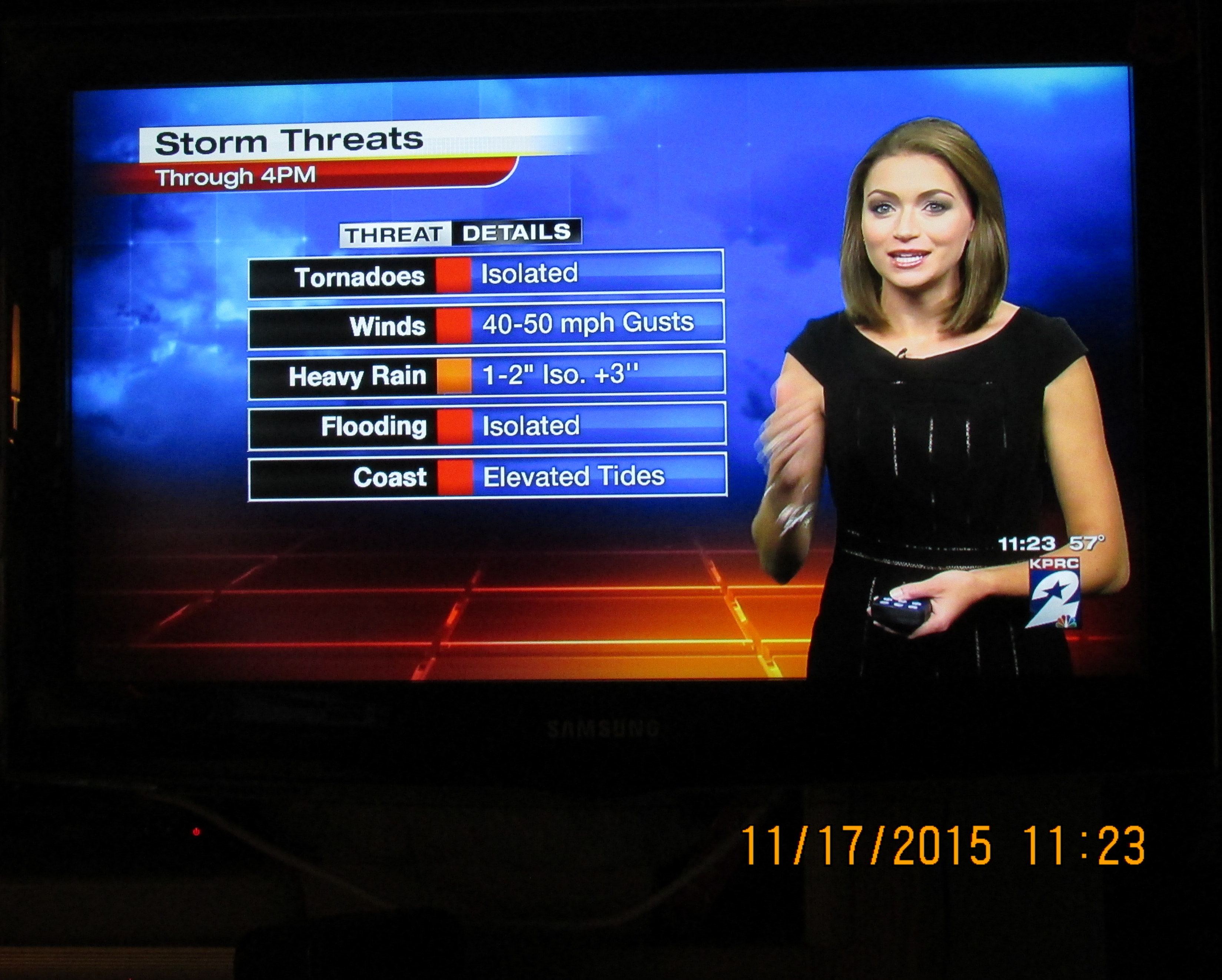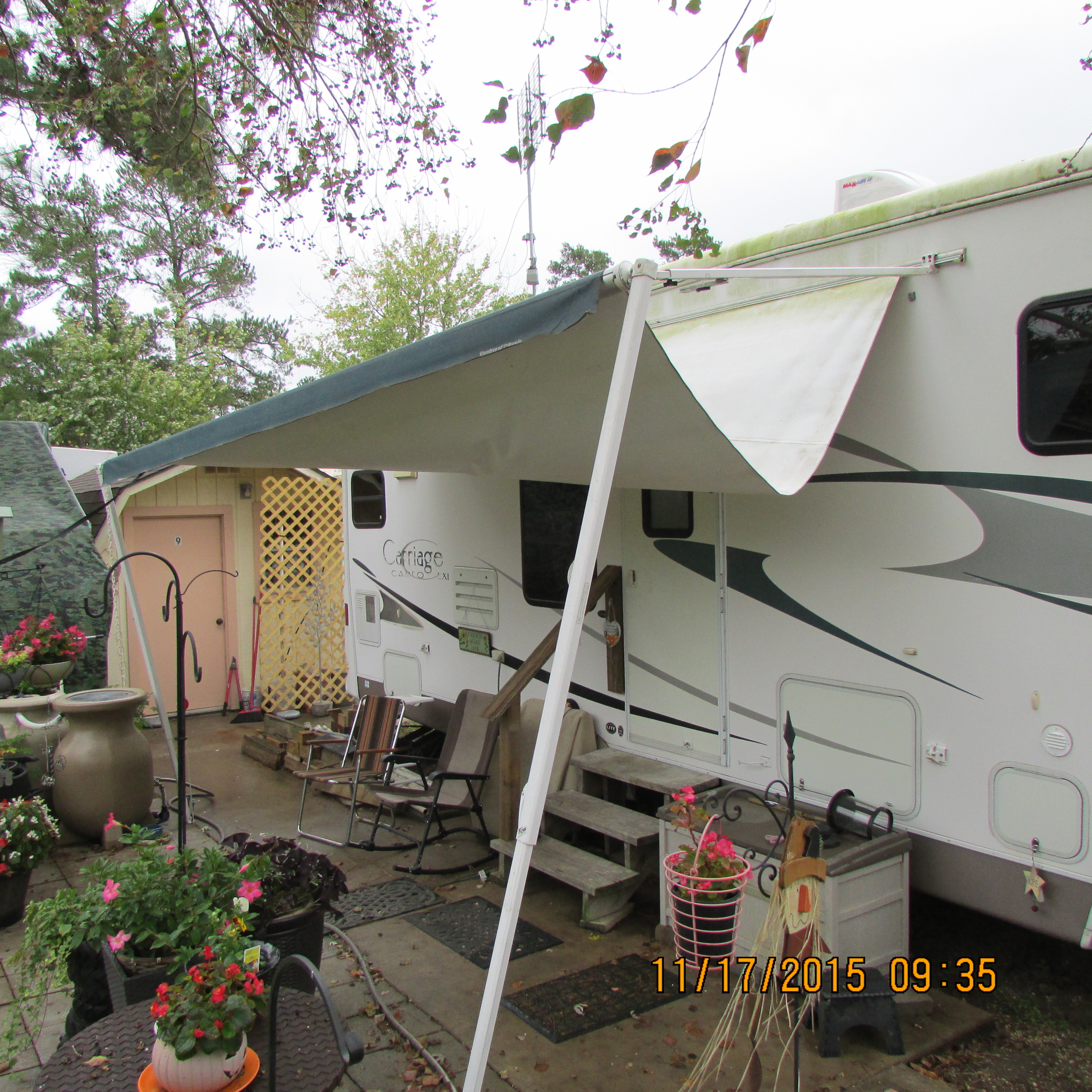 A sleepless night!! The trailer was “rockin’ and rollin” and the awning was buffeted by the strong wind. Hour after hour, I was wide awake. Finally, after 4:00 AM, I fell asleep but the NOAA weather radio awakened me at 4:40 with news of tornadoes (but not local). ~~ Fortunately, the tarp is still on the shelter. I have long “tie down” straps to go over the top and secure to the cement blocks (prepared last month).
