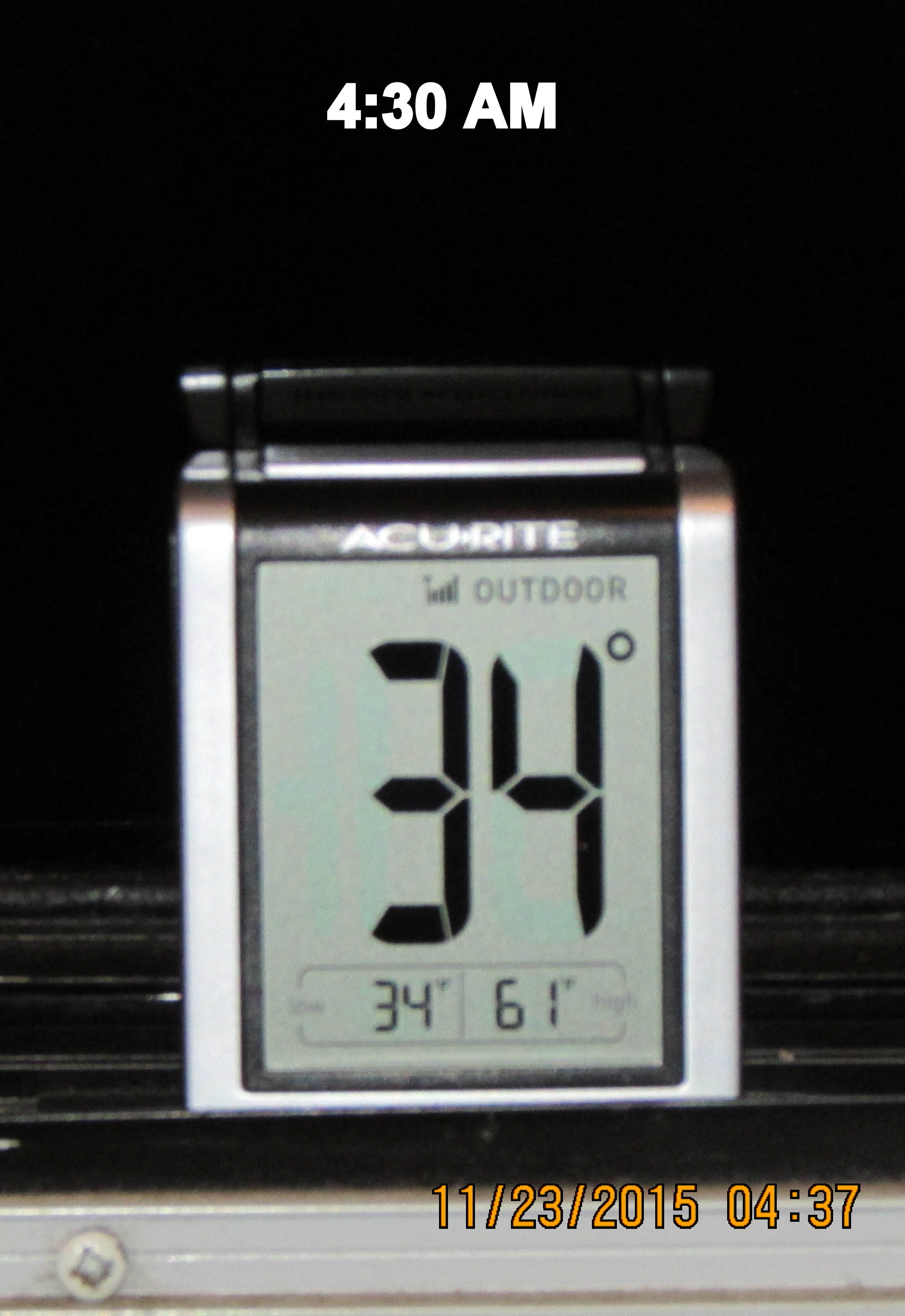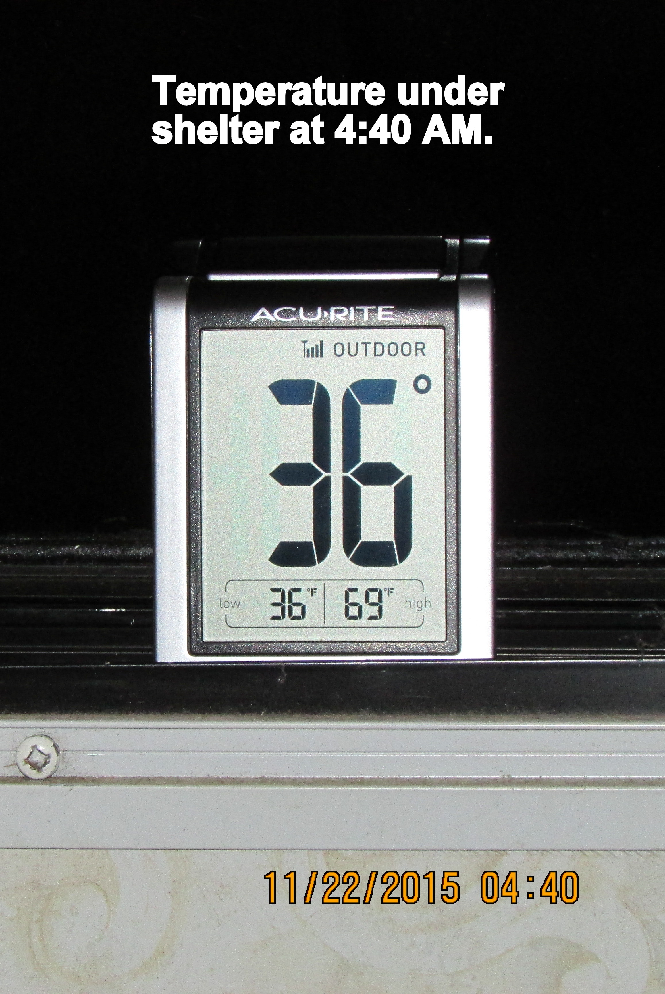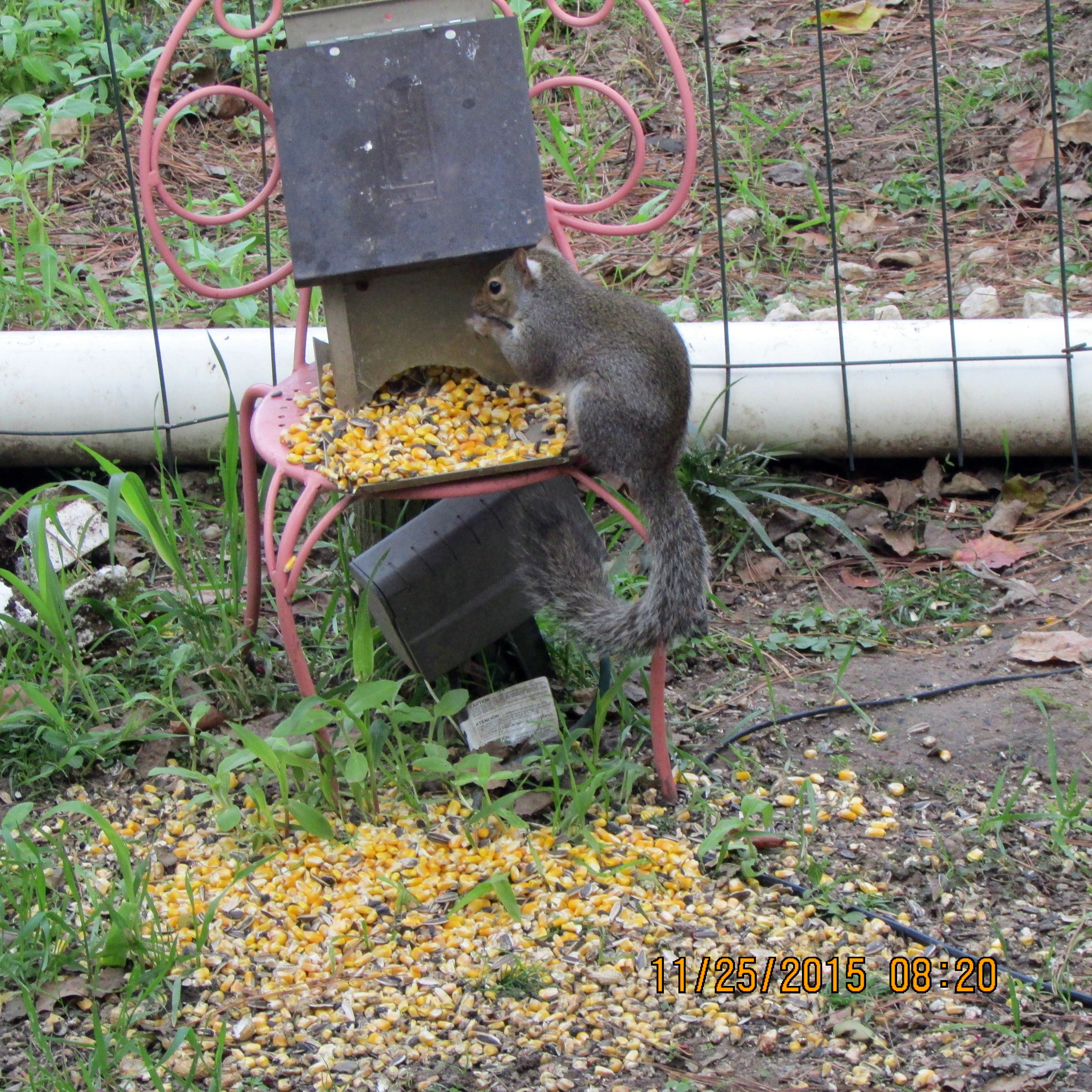 Ha ha, this is so amusing!! The squirrels raid the bird feeders; a possum dines at the squirrel feeder. I also suspect he got the pecans on the cement block front left. ~~ I was outdoors to take the nine o’clock picture of thermometer and this little guy was not the least intimidated by my presence. He didn’t run away after the flash.