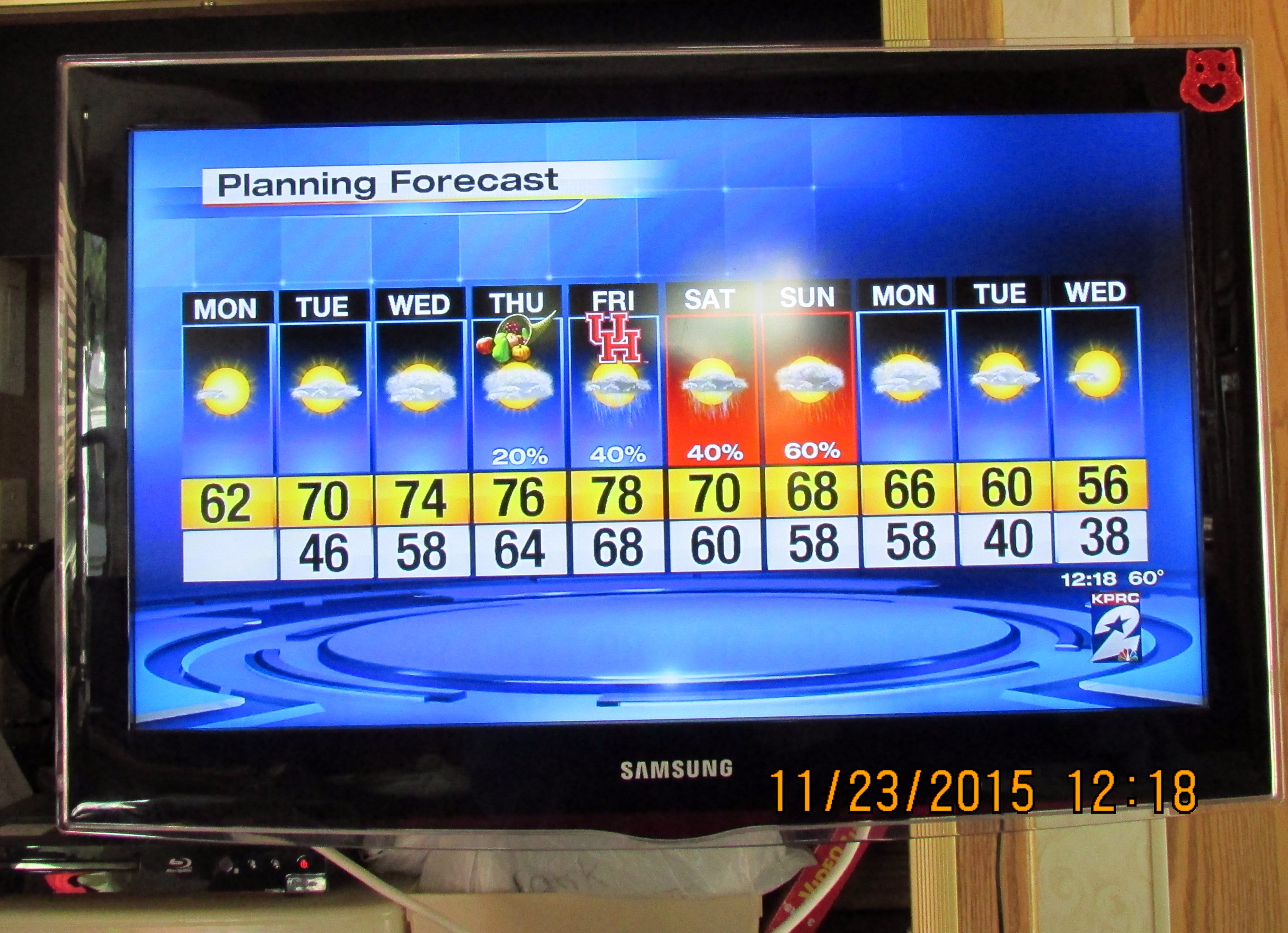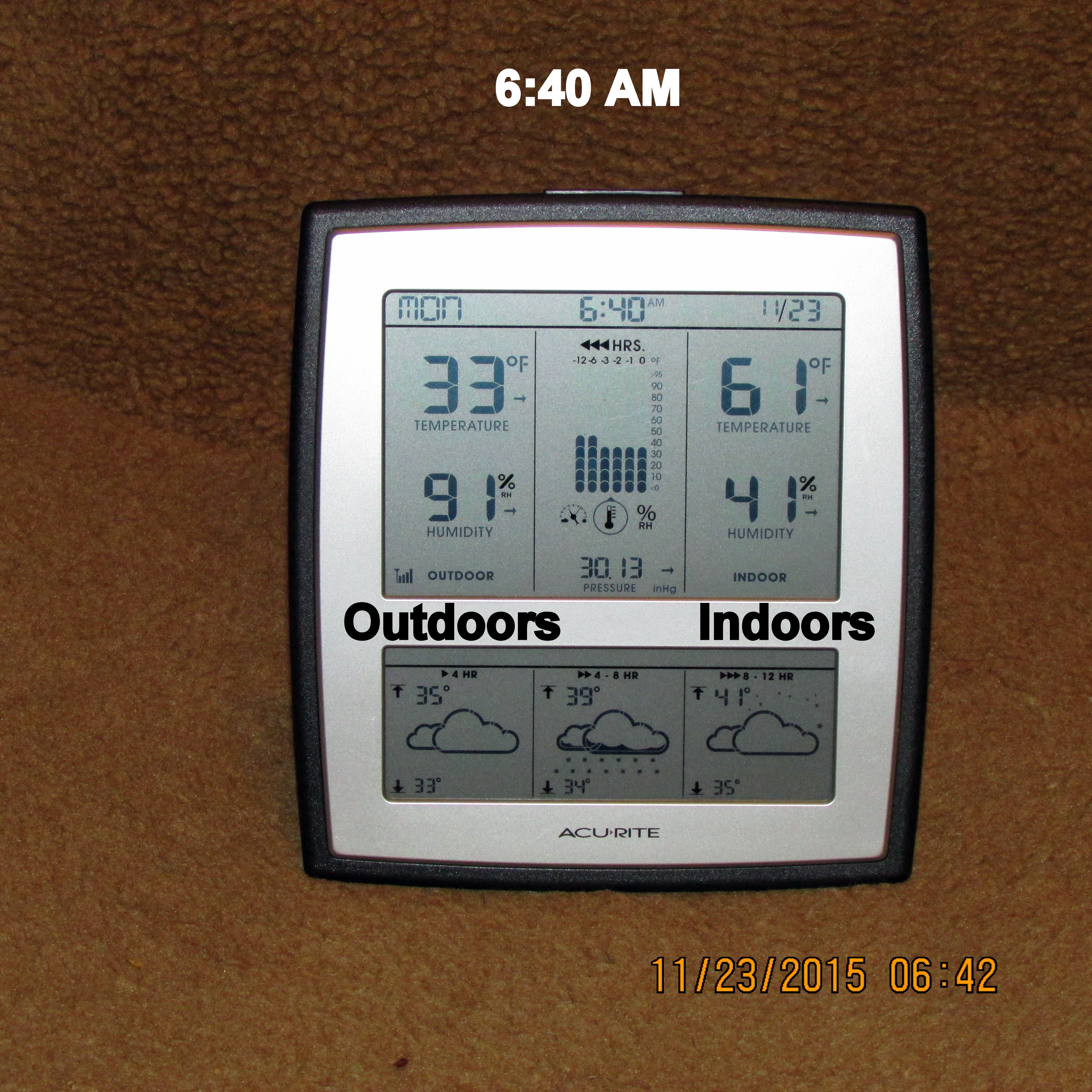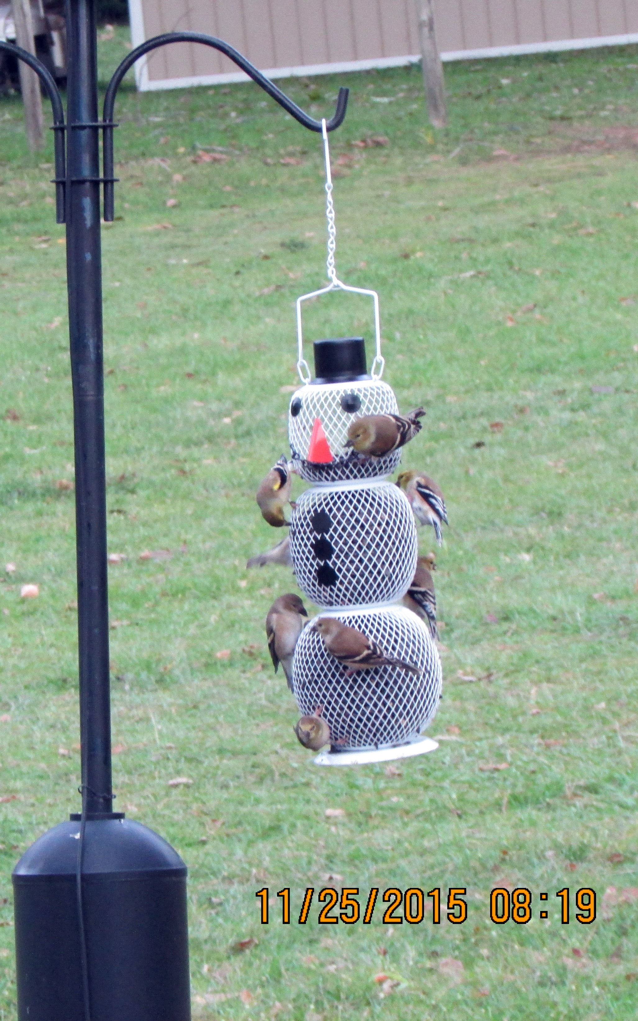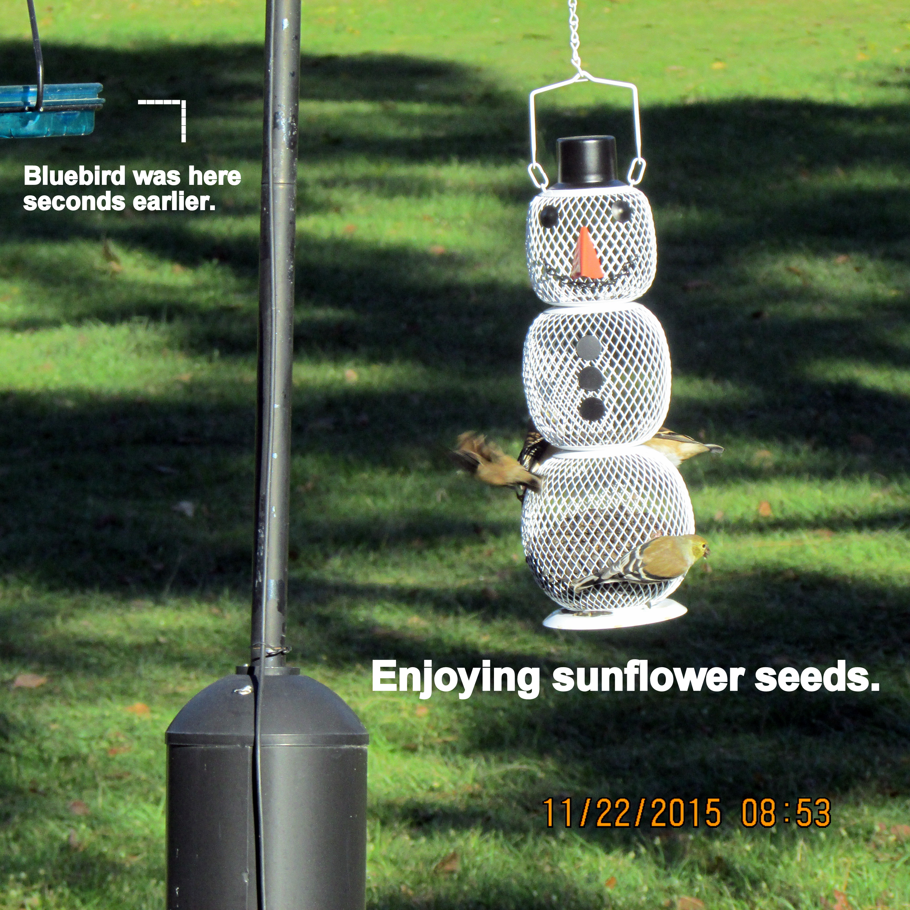 Ha ha, this is so amusing!! The squirrels raid the bird feeders; a possum dines at the squirrel feeder. I also suspect he got the pecans on the cement block front left. ~~ I was outdoors to take the nine o’clock picture of thermometer and this little guy was not the least intimidated by my presence. He didn’t run away after the flash.