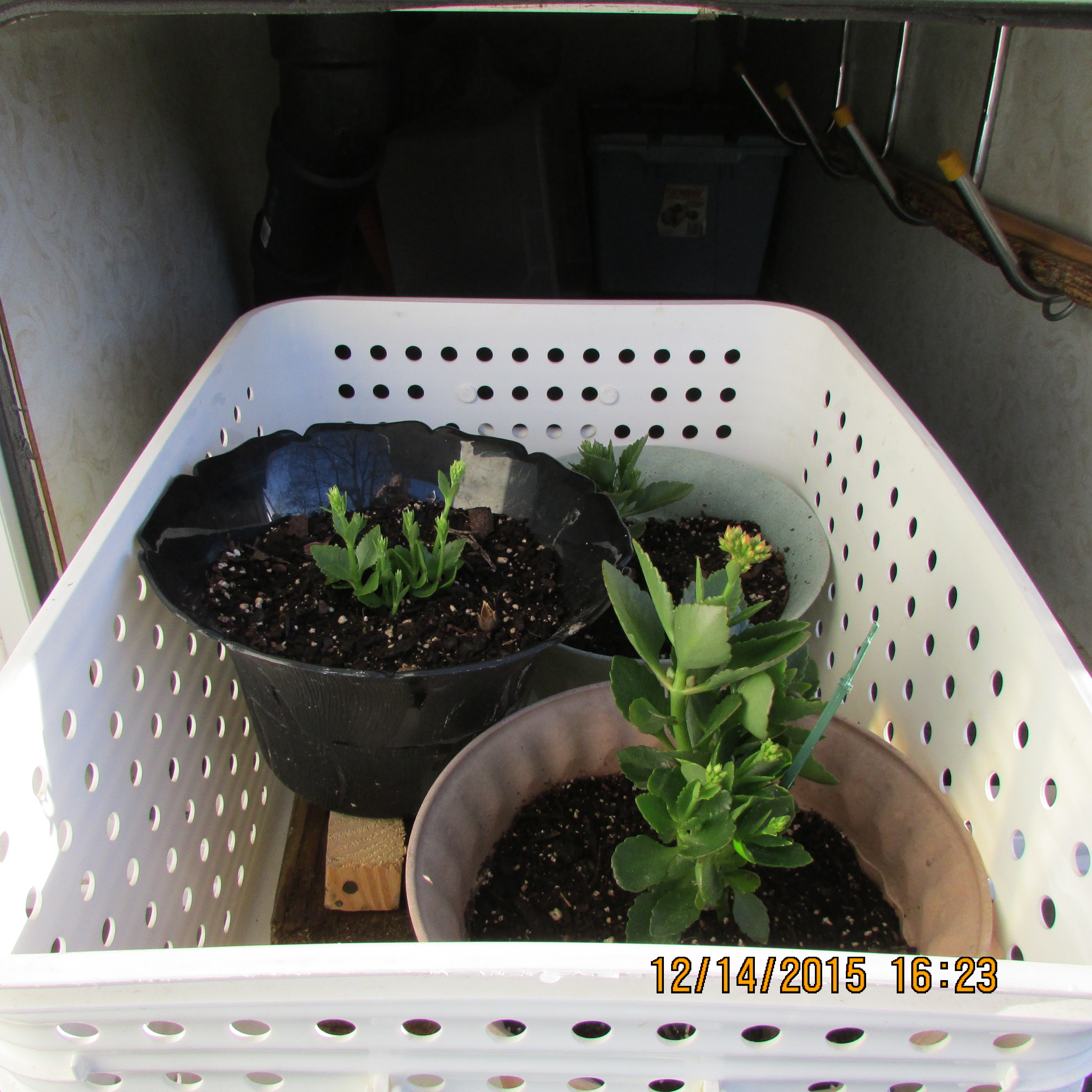 Very recently, I planted a number of Kalanchoe plants. After reading several web sites, I understand they can’t tolerate cold temperatures. Although my tarp shelter may save most plants from freezing, it isn’t warm enough for Kalanchoe. So I’m hoping  “the basement” of my trailer home will be satisfactory. The “start” in the red pot is indoors but not enough space to bring all seven planters indoors.
